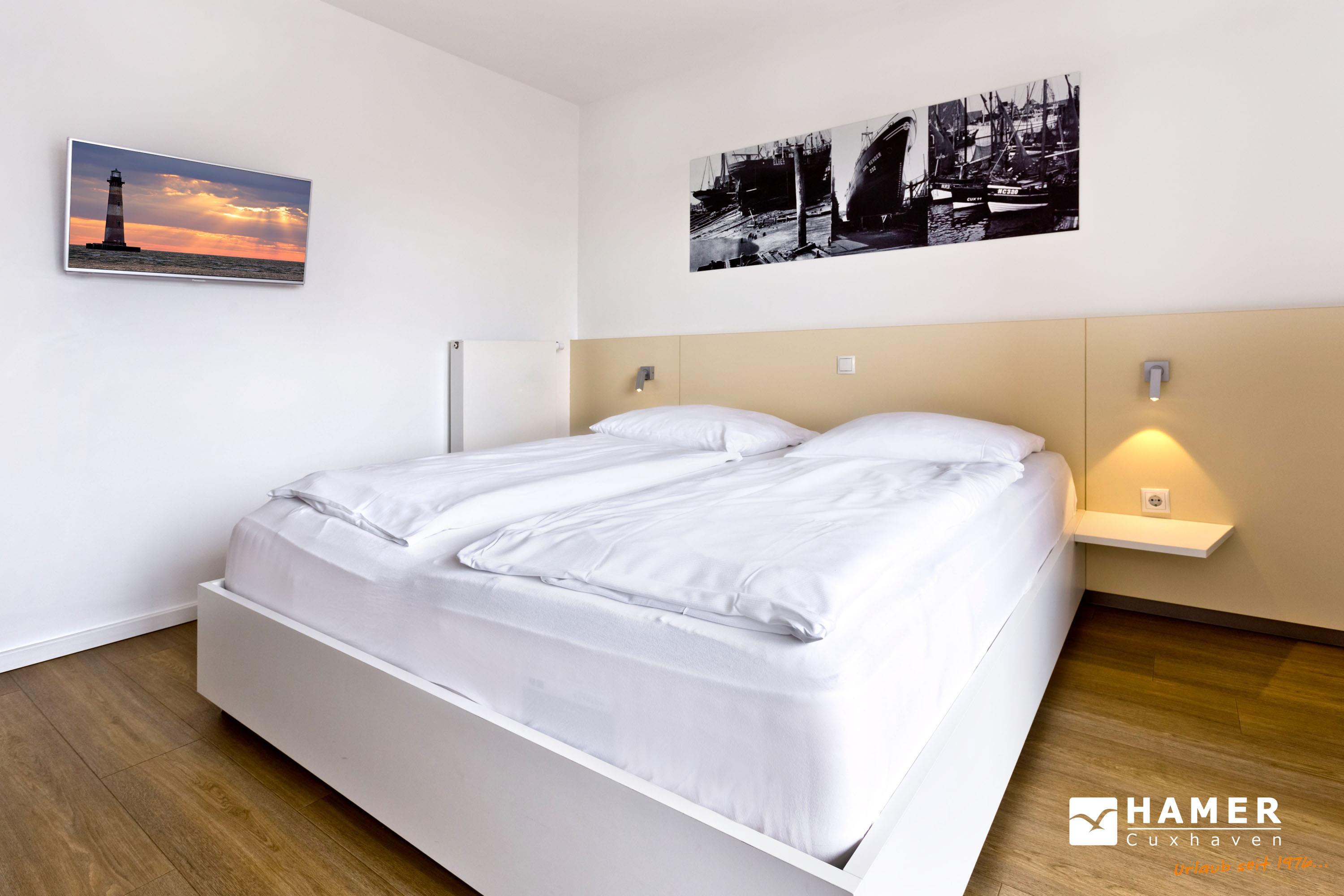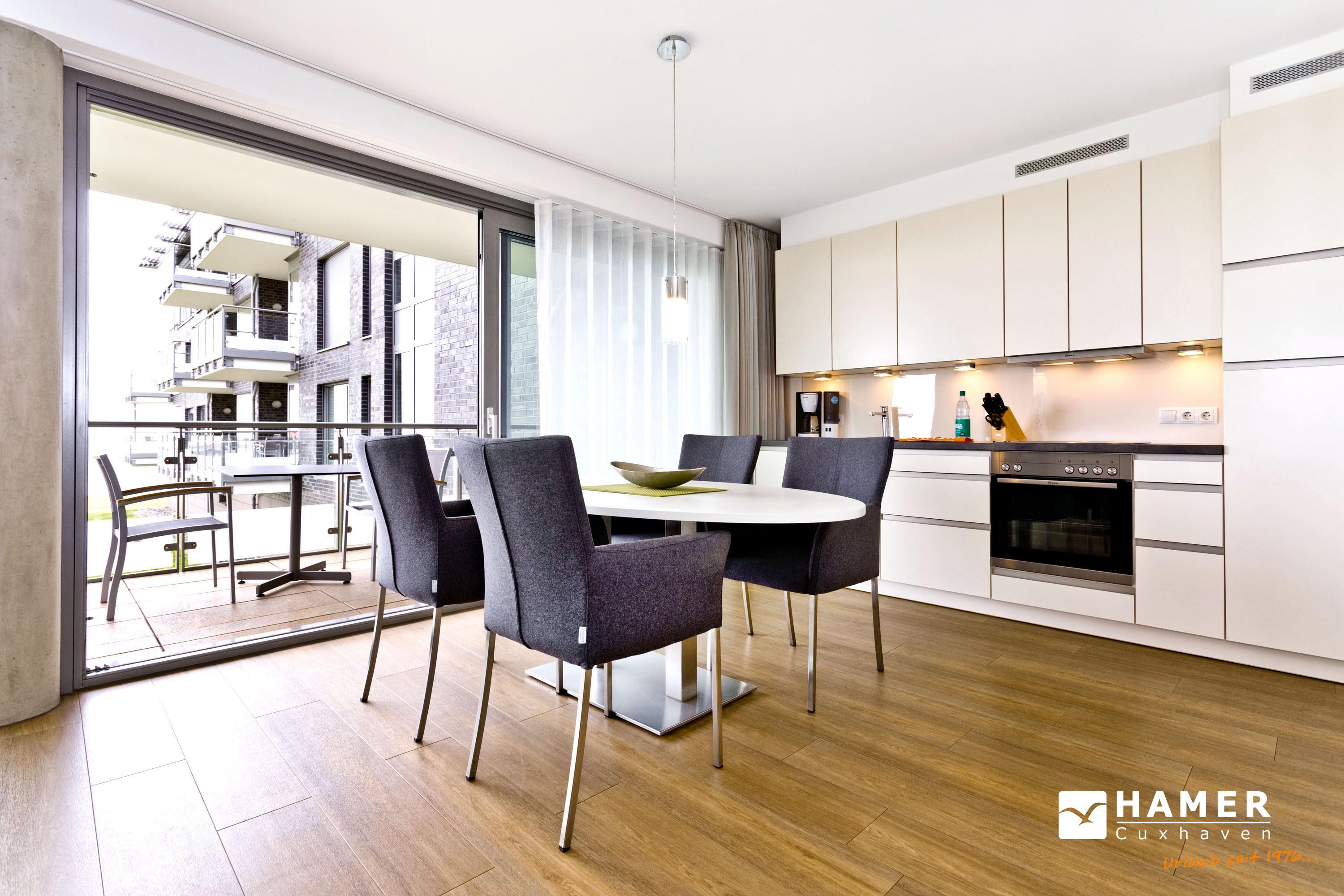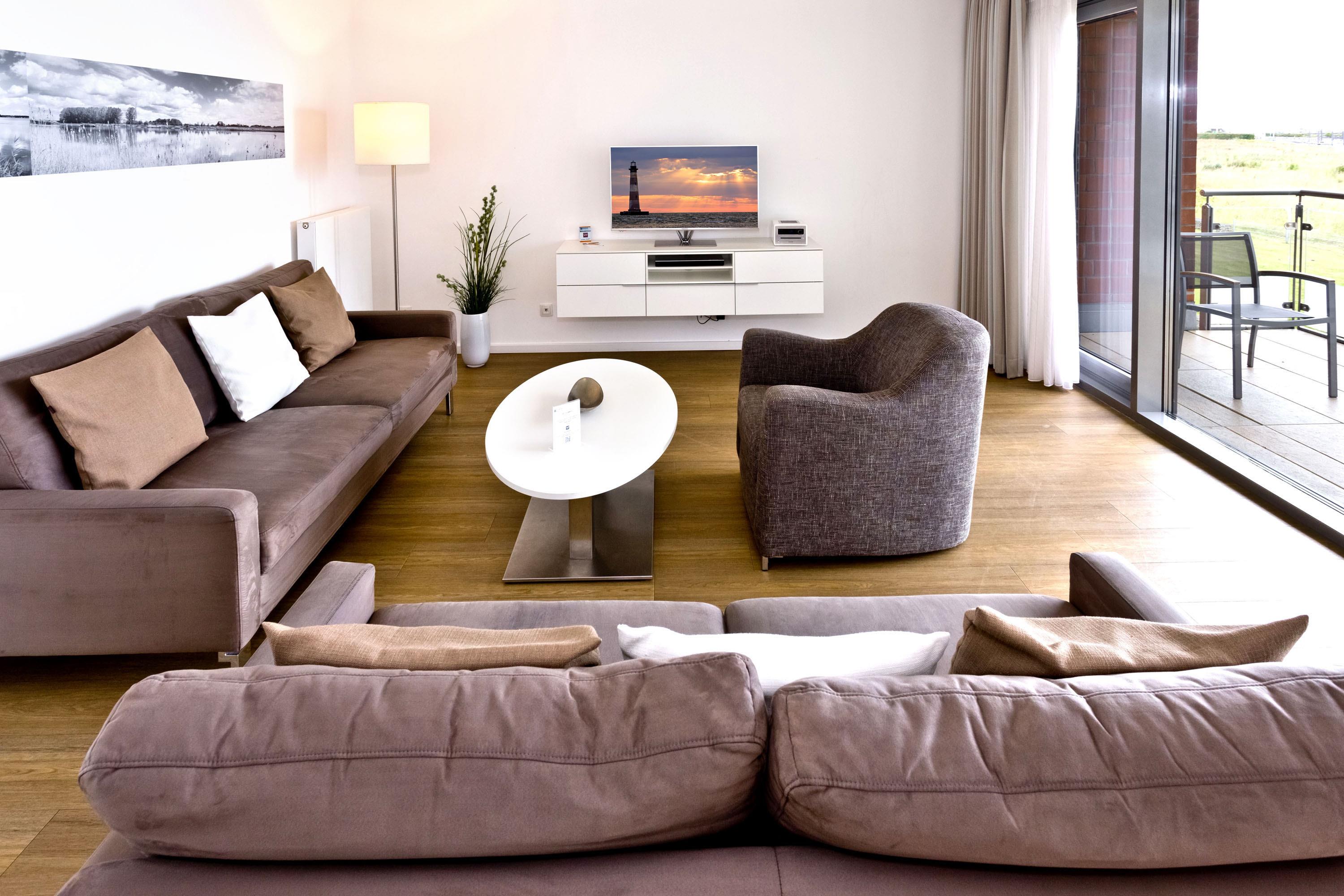 Seesicht vom Feinsten. Komfortable 3 Zi. Luxus-Wohnung über 91m², 1. Etage, großzügiges Wohnzimmer mit großem Balkon (nord), ein weiterer Balkon zur Südseite an den Schlafzimmern, vollständig ausgestattete Küchenzeile, 2 Schlafzimmer mit Doppelbetten und Außenjalousien, 2xTV, DVD, Radio/CD, kostenloses W-Lan-Internet, 1xDu/WC, 1x Gäste-WC, reservierter Außenstellplatz, freie Saunanutzung, Nichtraucher, keine Haustiere.