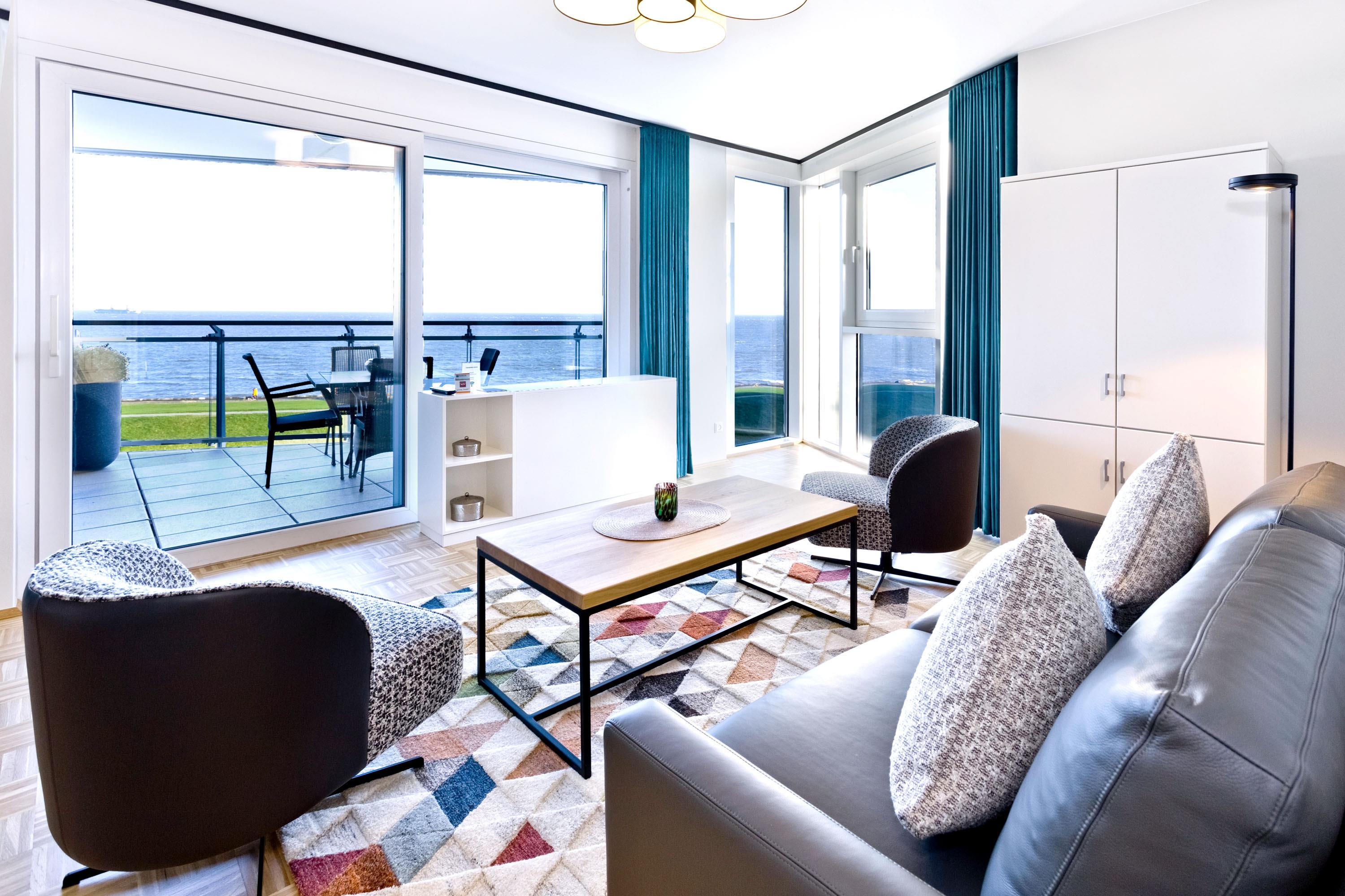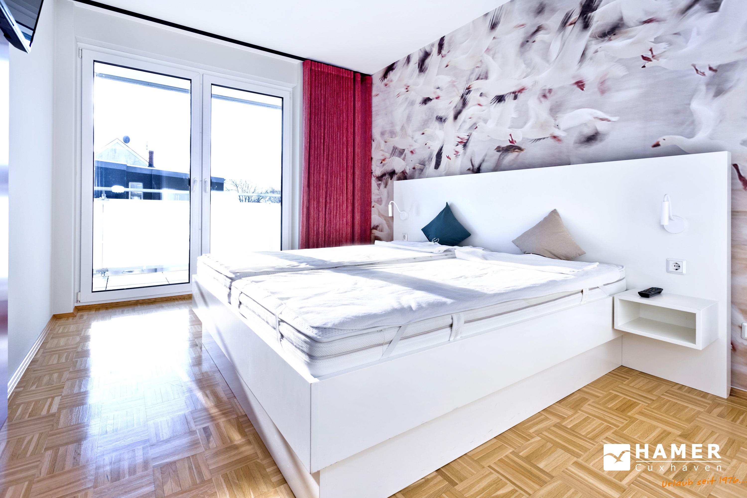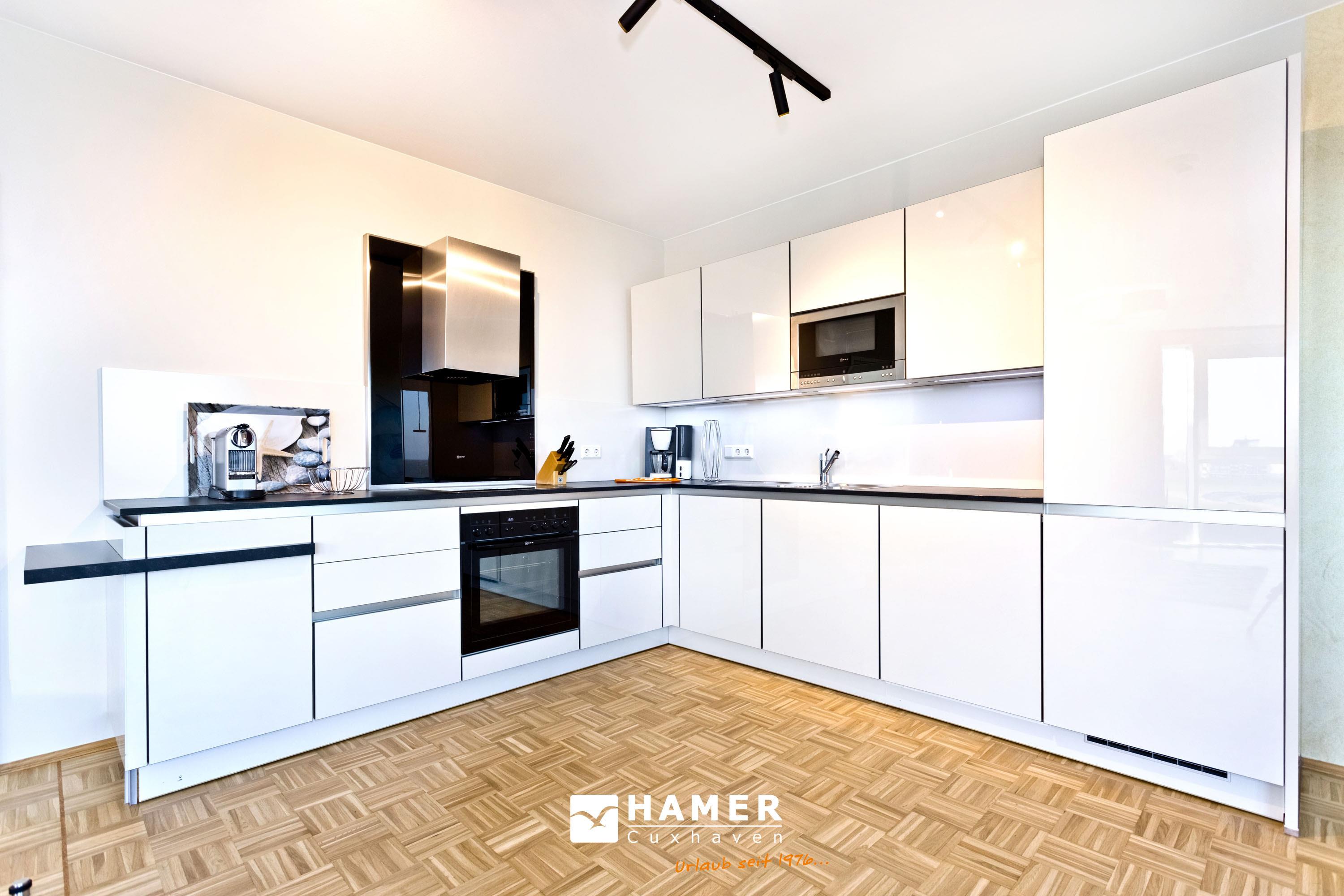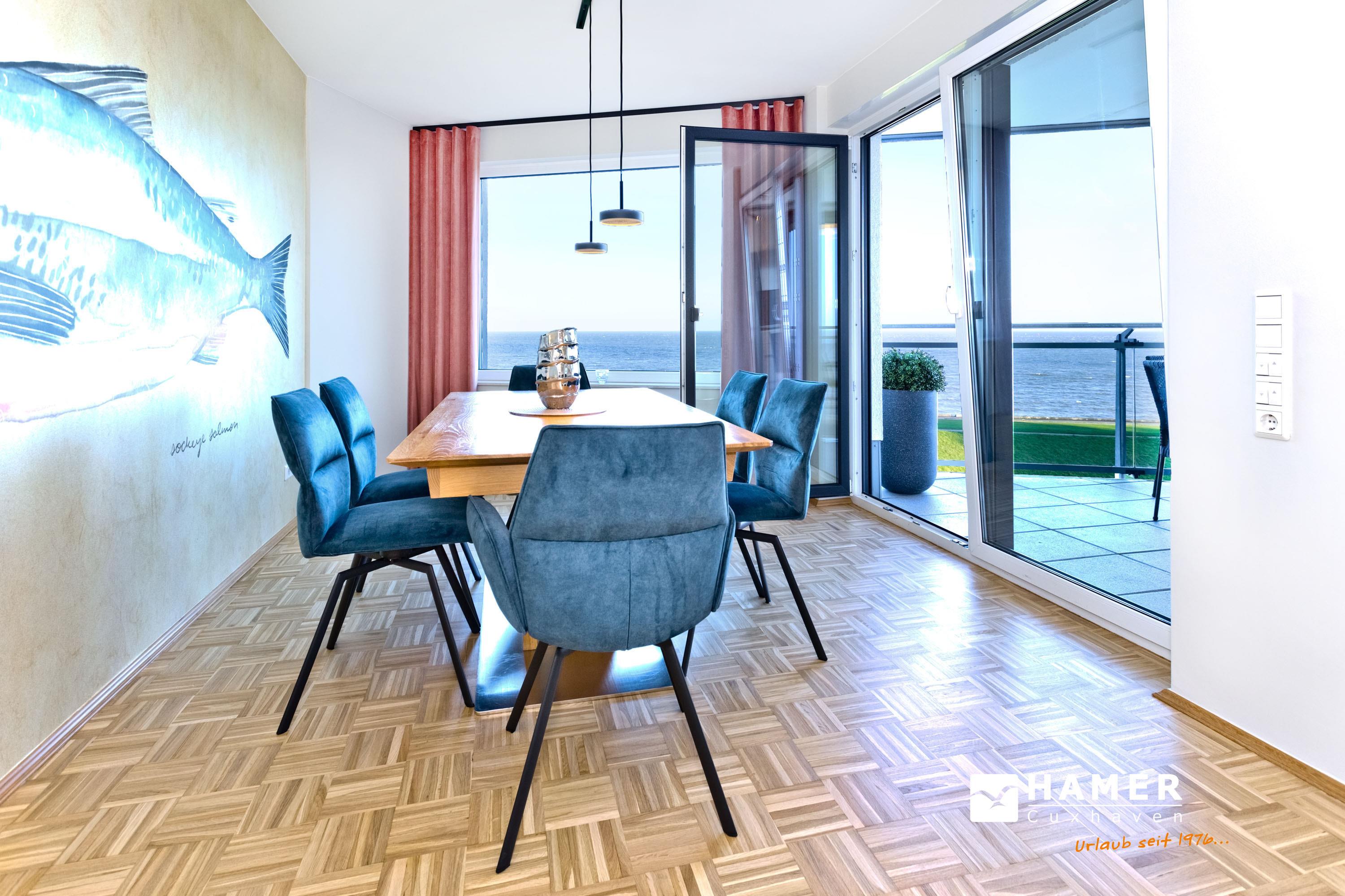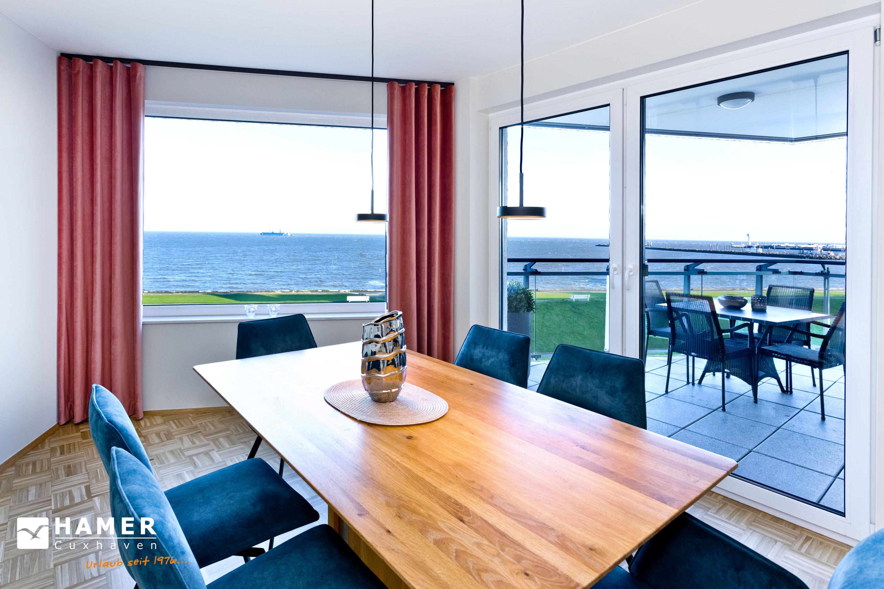 Luxus-Seesicht-Wohnung in der 3.Etage auf 120m² bis 5 Pers.. Hier haben Sie den Traumseeblick auf die vorbeiziehenden Schiffe. 2 Schlafzimmer jeweils mit Doppelbetten +TV, 1 Schlafzimmer mit Einzelbett (2,10m), alle Schlafzimmer mit Außenjalousien, 1xDu/Wc mit Fön, 1xBad/Wc, Ankleideraum, großes Wohnzimmer mit TV (lässt sich im Fernsehschrank ein -und ausfahren), Radio, kostenloses Internet (W-LAN) offene u. vollständige Küche, 1 Balkon (nord) mit Blick auf die Elbe, 1 Balkon (süd) auch mit Seesicht!, alle Räume mit hochwertigem Parkett ausgestattet. Fußbodenheizung. Zur Wohnung gehört eine eigene Garage am Haus (Höhe ca. 2m). Nichtraucher, keine Haustiere.