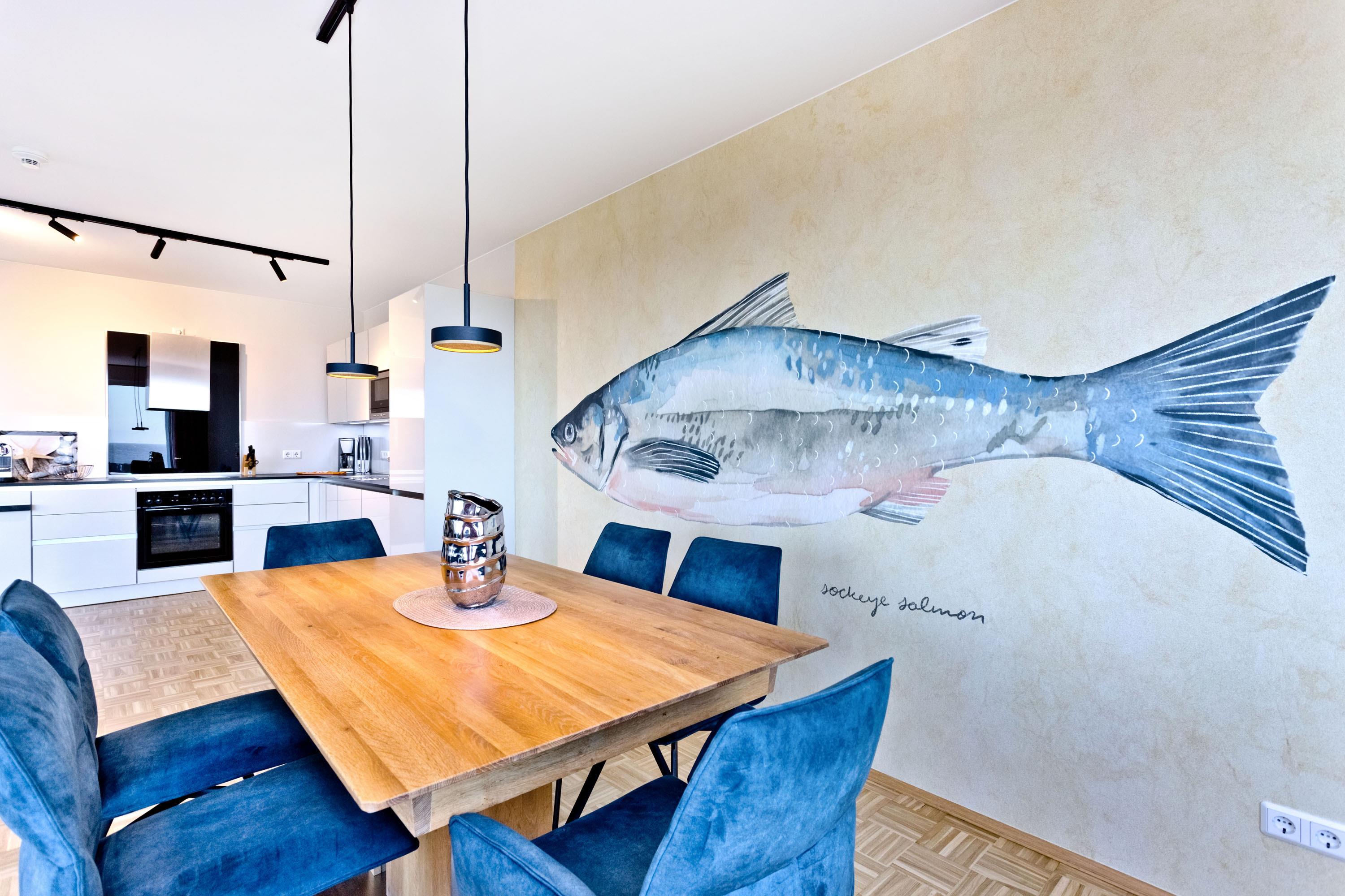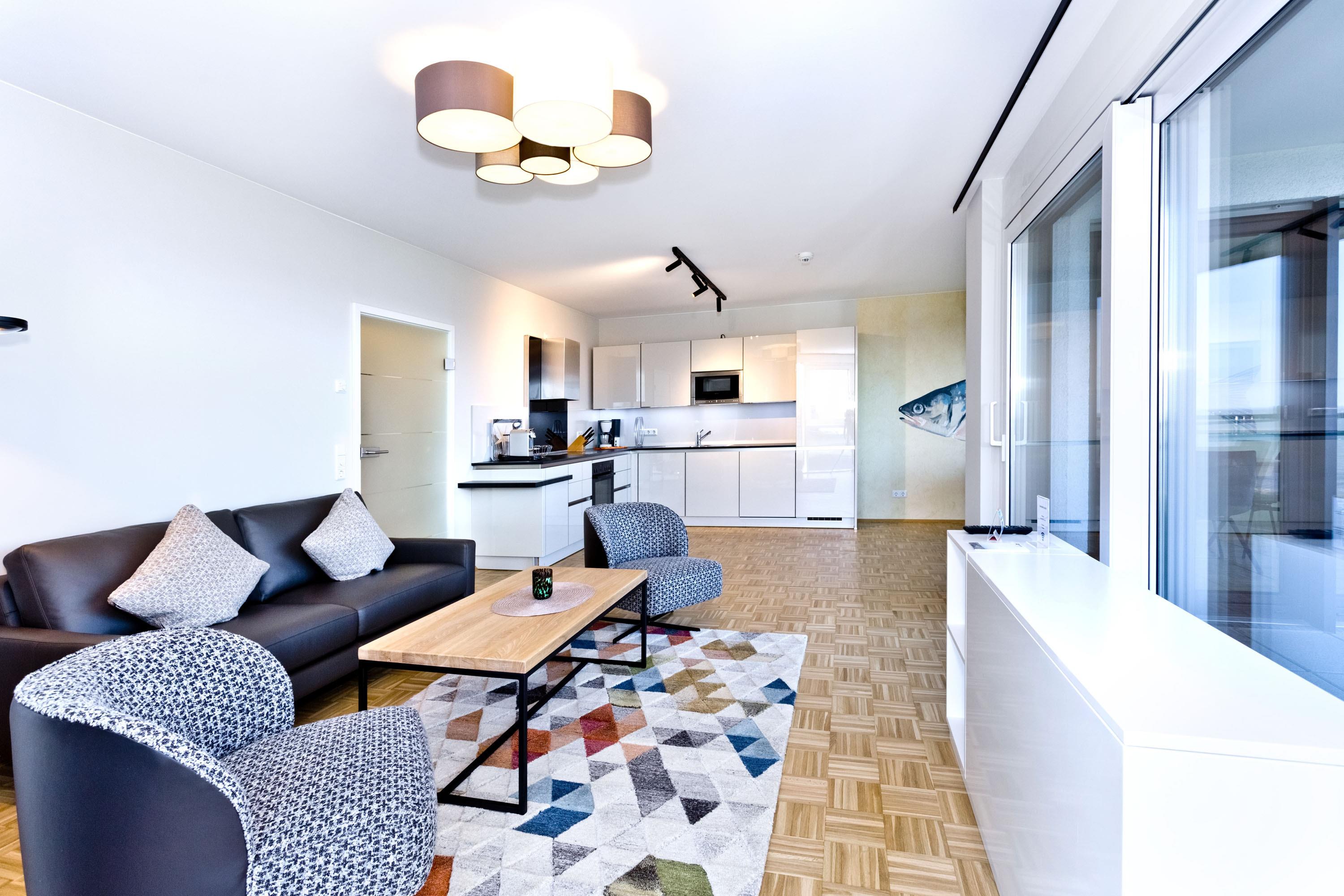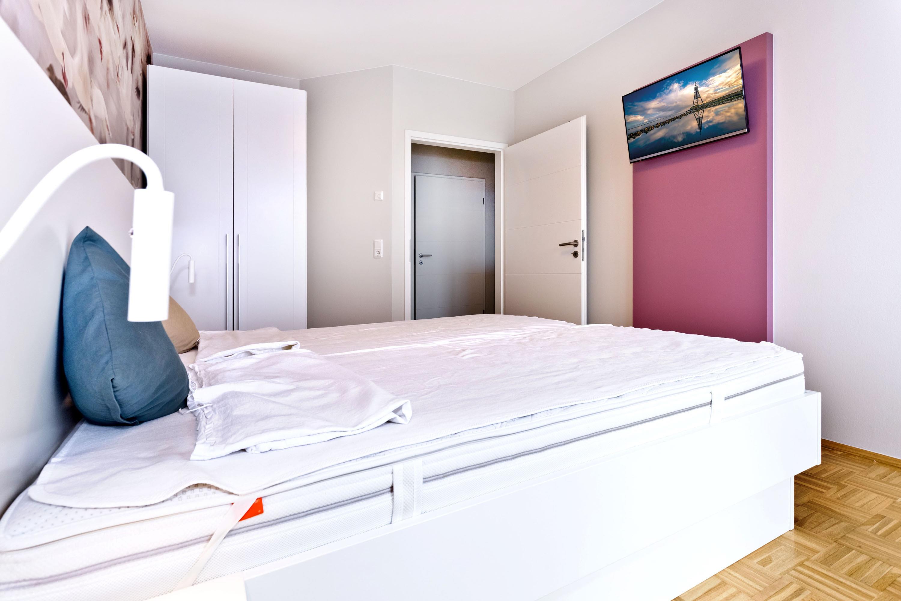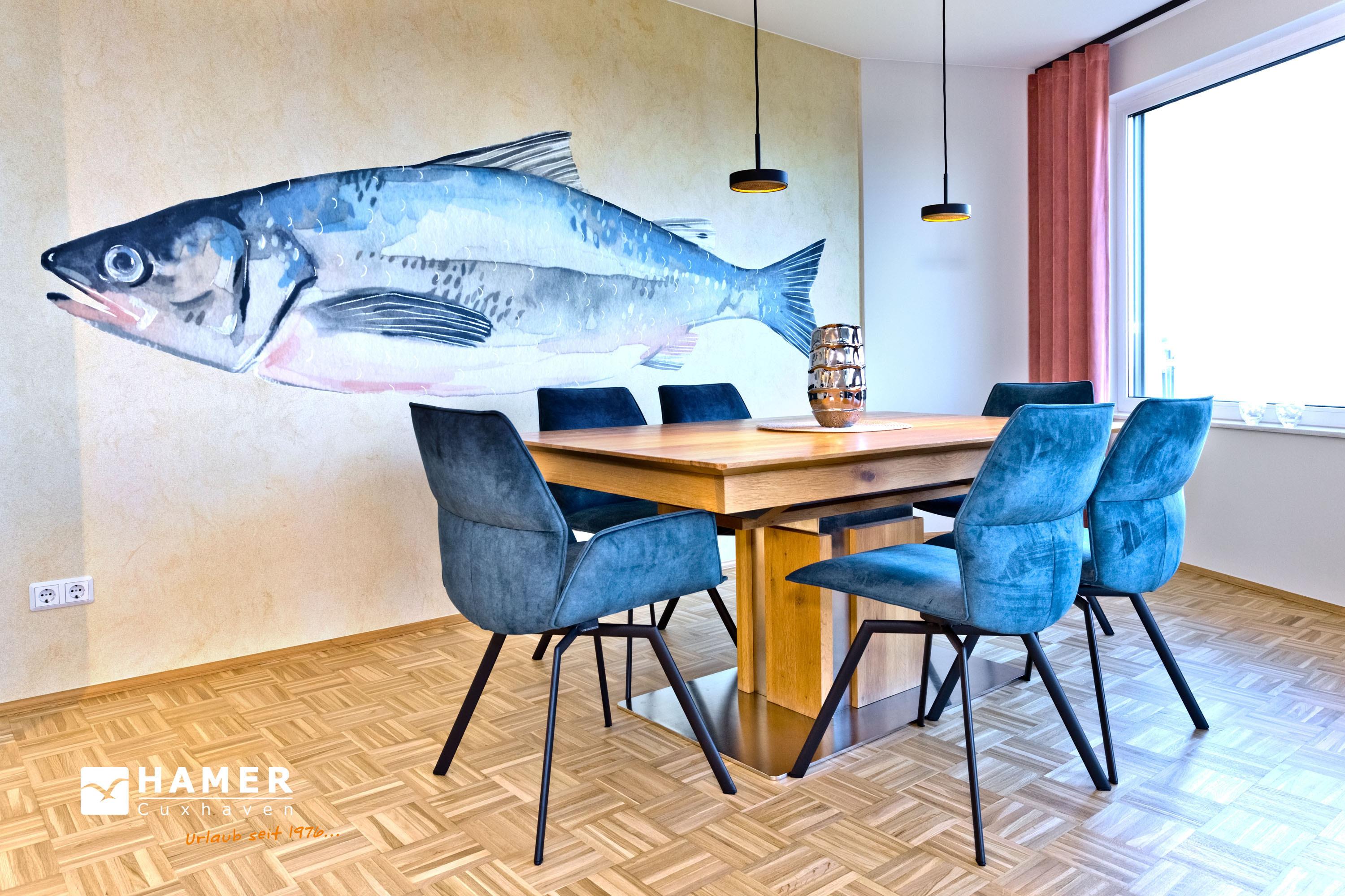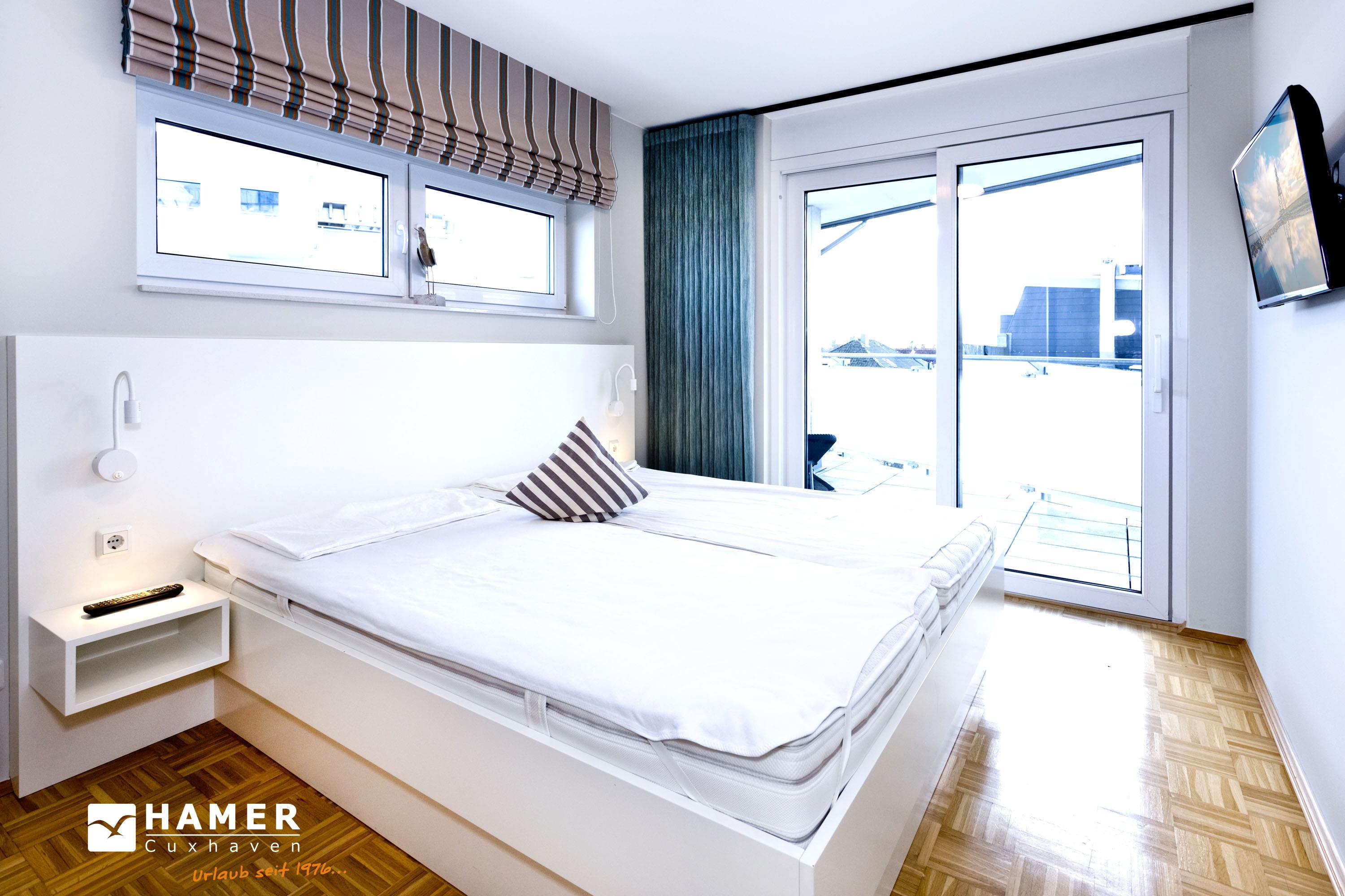 Luxus-Seesicht-Wohnung in der 3.Etage auf 120m² bis 5 Pers.. Hier haben Sie den Traumseeblick auf die vorbeiziehenden Schiffe. 2 Schlafzimmer jeweils mit Doppelbetten +TV, 1 Schlafzimmer mit Einzelbett (2,10m), alle Schlafzimmer mit Außenjalousien, 1xDu/Wc mit Fön, 1xBad/Wc, Ankleideraum, großes Wohnzimmer mit TV (lässt sich im Fernsehschrank ein -und ausfahren), Radio, kostenloses Internet (W-LAN) offene u. vollständige Küche, 1 Balkon (nord) mit Blick auf die Elbe, 1 Balkon (süd) auch mit Seesicht!, alle Räume mit hochwertigem Parkett ausgestattet. Fußbodenheizung. Zur Wohnung gehört eine eigene Garage am Haus (Höhe ca. 2m). Nichtraucher, keine Haustiere.
