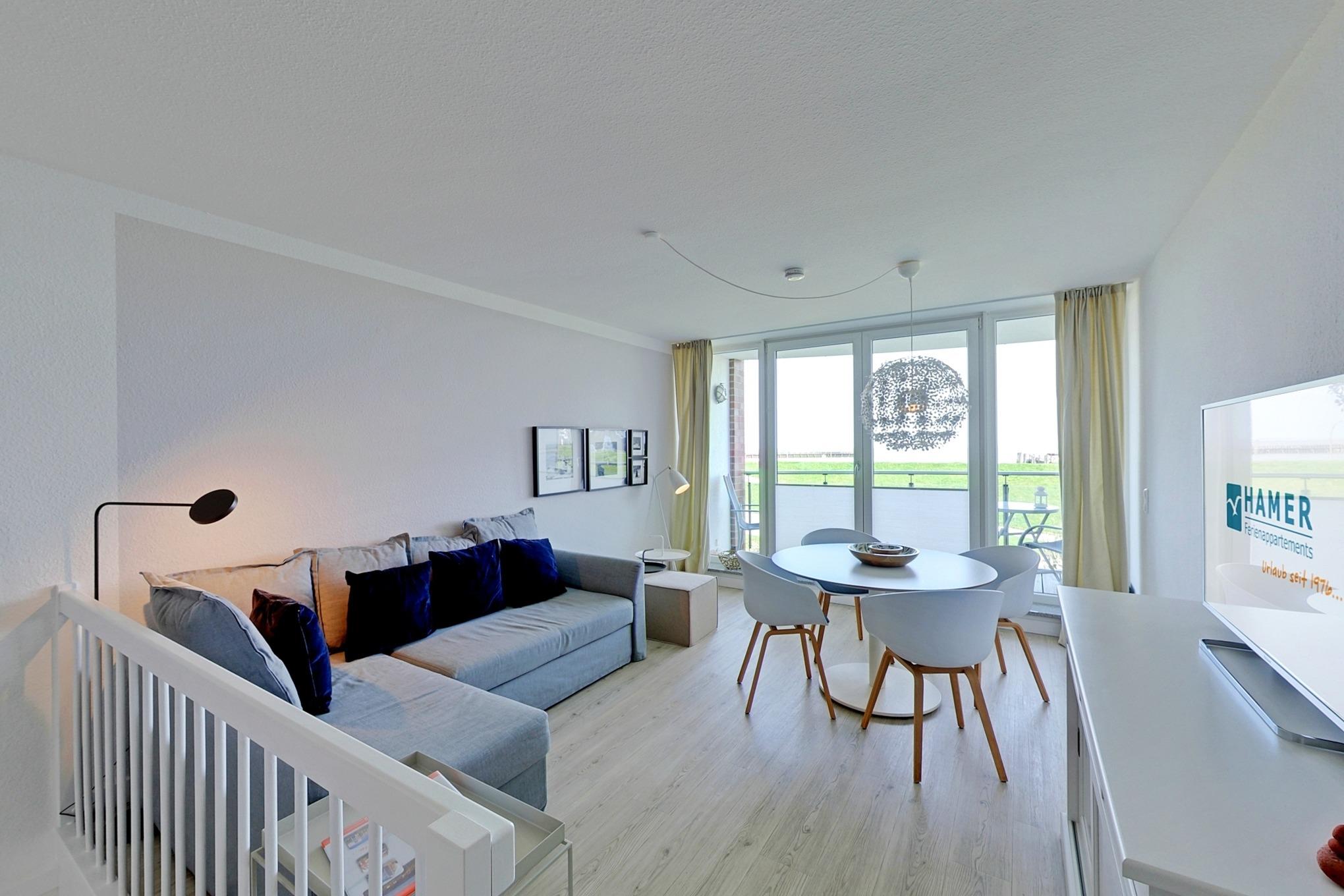 Schöne neu renovierte 2-Raum Wohnung über zwei Etagen auf ca. 60m². Das Schlafzimmer im EG mit Doppelbett Kabel-TV. Du/Wc. Im 1. OG befindet sich das Wohn-/Schlafzimmer mit Querschläfer, Kabel-TV, Bose-Soundlink. Küchenzeile mit Vollausstattung (Geschirrsp. Mikrow. etc.) Balkon zur Wasserseite mit dem einmaligen Blick auf die Elbmündung. Die Wohnung verfügt über Fußbodenheizung, kostenfreies W-Lan und ist allergikergerecht ausgestattet. Tiefgaragenstellplatz #2 (Durchfahrtshöhe 1,90m), Keine Haustiere erlaubt. Nichtraucher