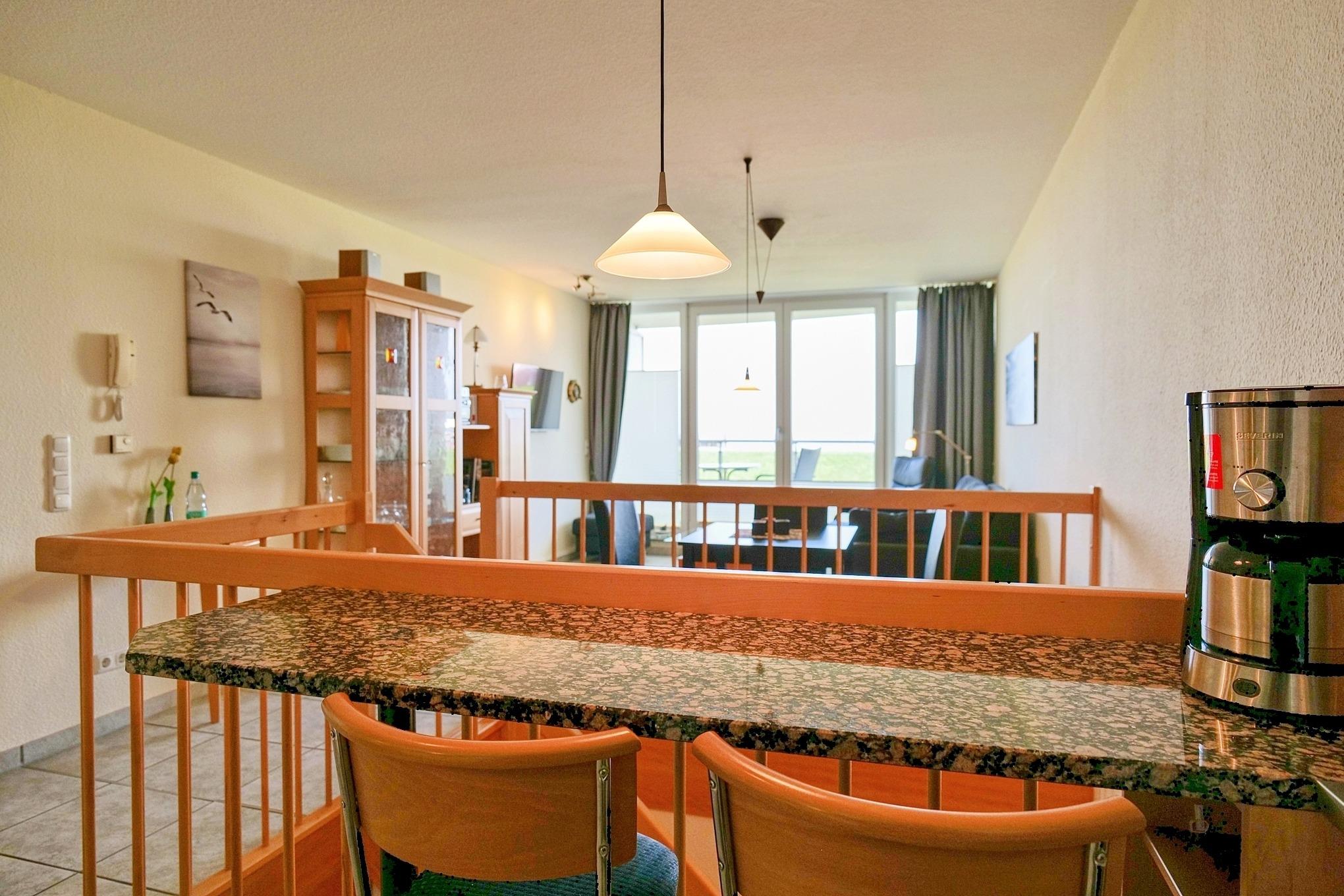 Schöne 2-Raum Wohnung über zwei Etagen auf ca. 60m² für 2 Personen. Das Schlafzimmer im EG mit Doppelbett Kabel-TV. Du/WC. Im 1. OG befindet sich das Wohnzimmer mit Kabel-TV und offener Küchenzeile mit Vollausstattung (Geschirrsp. Mikrow, Back,) Balkon zur Wasserseite mit dem einmaligen Blick auf die Elbmündung. W-Lan kostenfrei. Die Wohnung ist komplett gefliest, verfügt über Fußbodenheizung und ist allergikergerecht ausgestattet. Tiefgaragenstellplatz #3, Keine Haustiere erlaubt. Nichtraucher