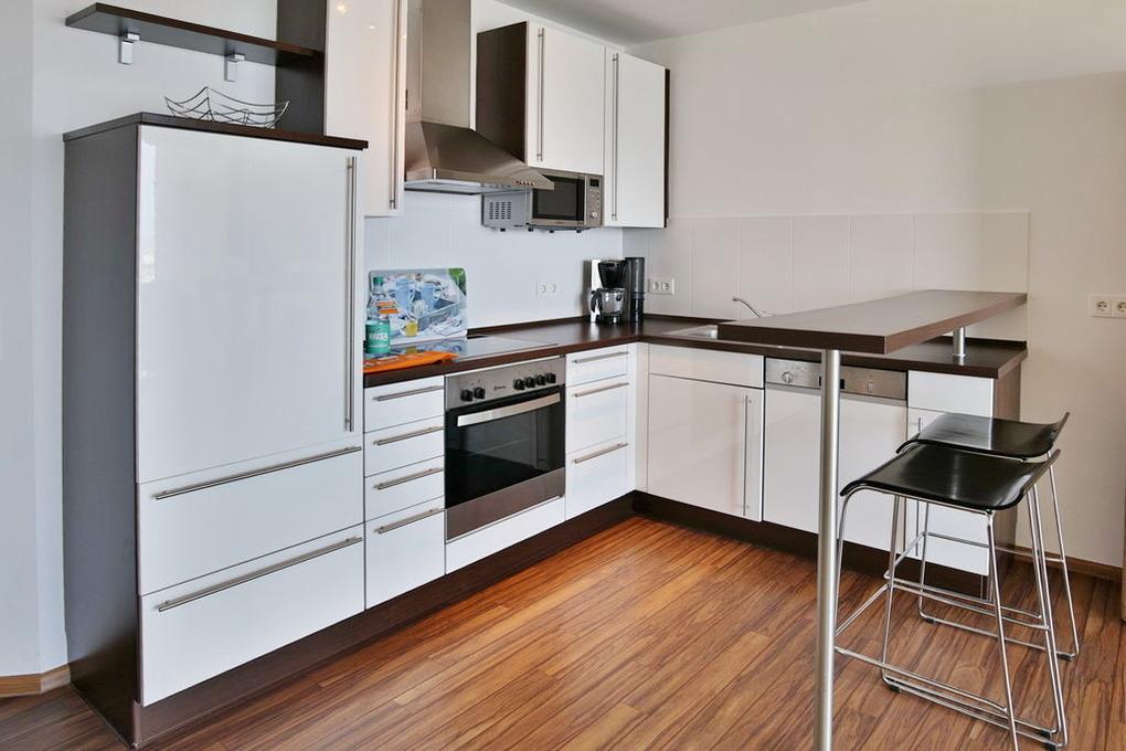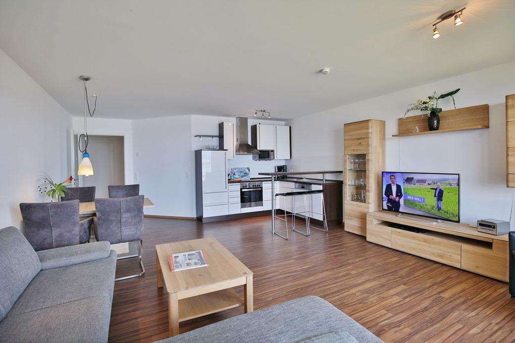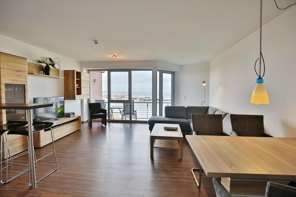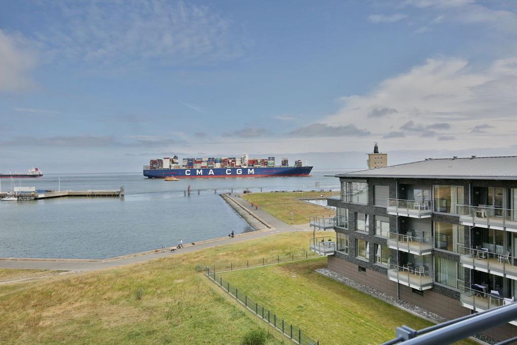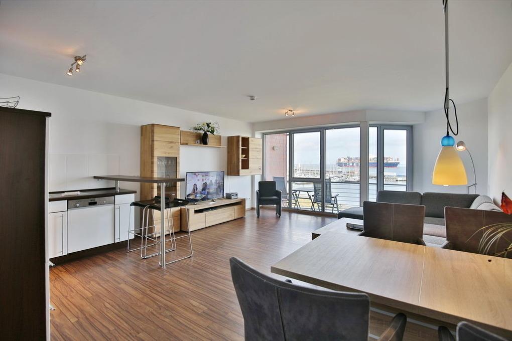 102m² Wohnung in der 3.Etage. Hier haben Sie die Traumseesicht auf den Weltschifffahrtsweg und Yachthafen. 1 Schlafzimmer mit Doppelbett, 1 Schlafzimmer mit 2 Einzelbetten, beide Schlafzimmer mit Rollladen, 1 Bad/Du/Wc und 1 Gäste-Wc, großes Wohnzimmer mit komplett ausgestatteter Küchenzeile, 2 große Balkone (nord+süd). Zur Wohnung gehört ein reservierter Pkw-Stellplatz am Haus. Nichtraucher, keine Haustiere erlaubt. Fahrräder können auch bequem und sicher im ebenerdigen Fahrradraum des Nachbargebäudes abstellt werden (separater Schlüssel).