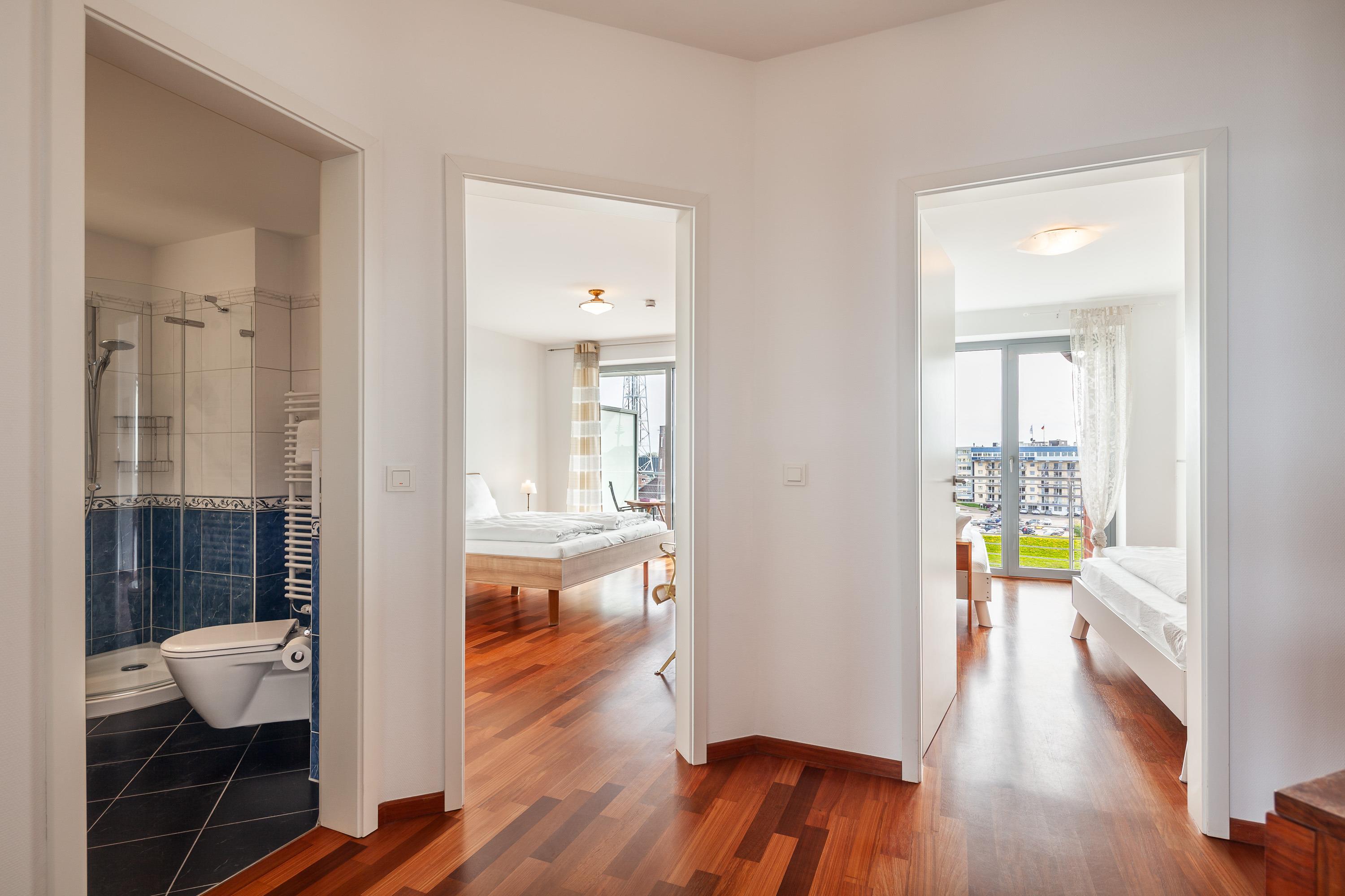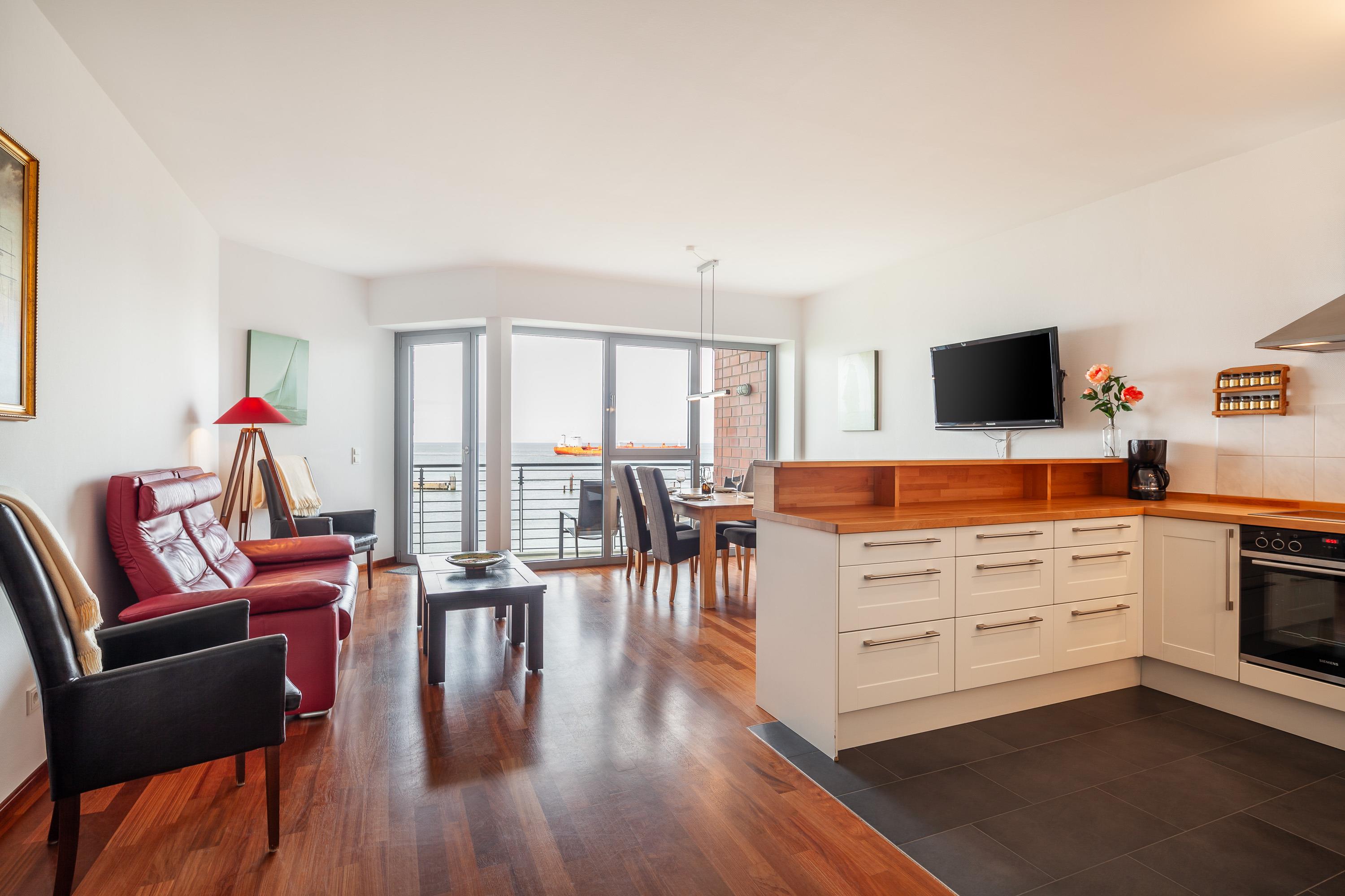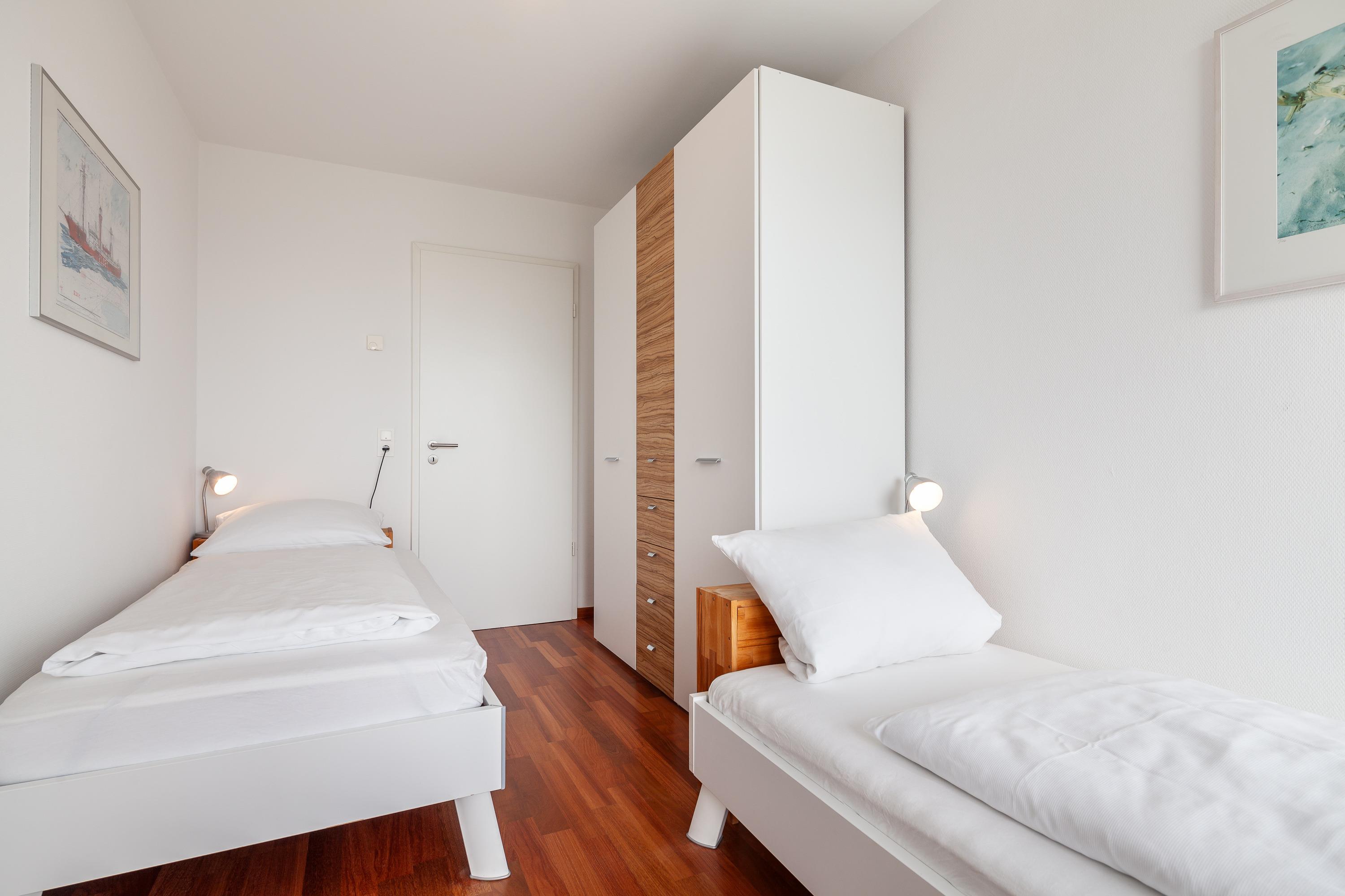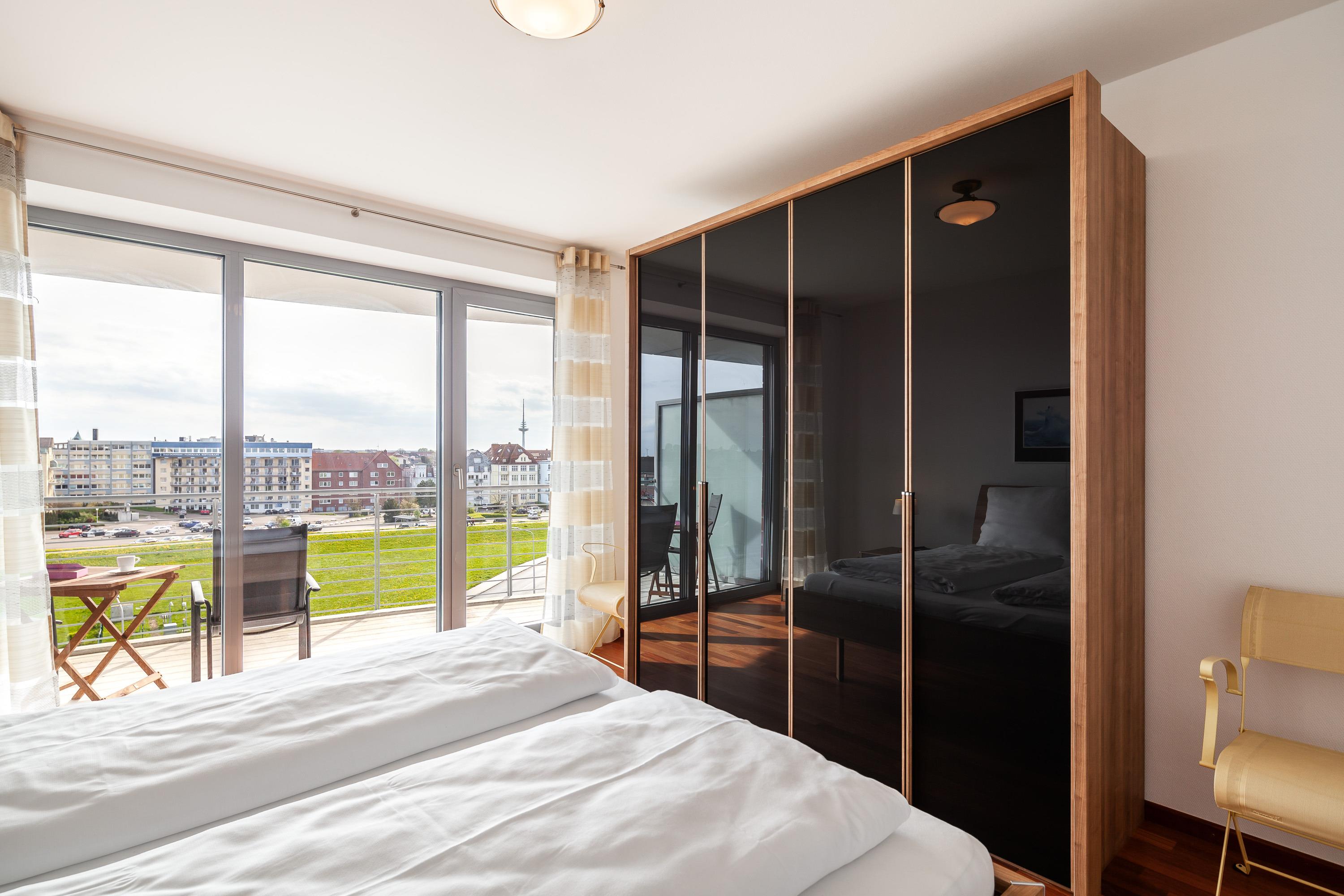 Sehr geschmackvolle 3-Raum-Wohnung in der 4. Etage mit dem atemberaubenden Blick auf die Elbmündung. Großes Wohnzimmer mit offener, voll ausgestatteter Küche, Esstisch, Balkon zur Seeseite, 1 Schlafzimmer mit Doppelbett, 1 Schlafzimmer mit zwei Einzelbetten, beide Schlafzimmer haben Zugang zum sonnigen Südbalkon mit Strandkorb. 1 Bad/Du/Wc, 1 Du/Wc, reservierter Pkw-Stellplatz auf dem Außengelände, Nichtraucher, keine Haustiere.