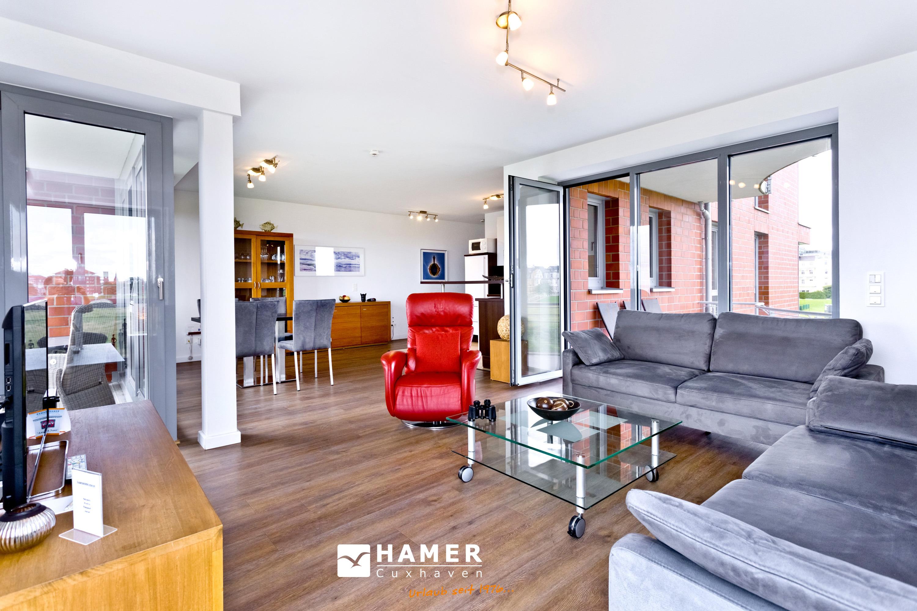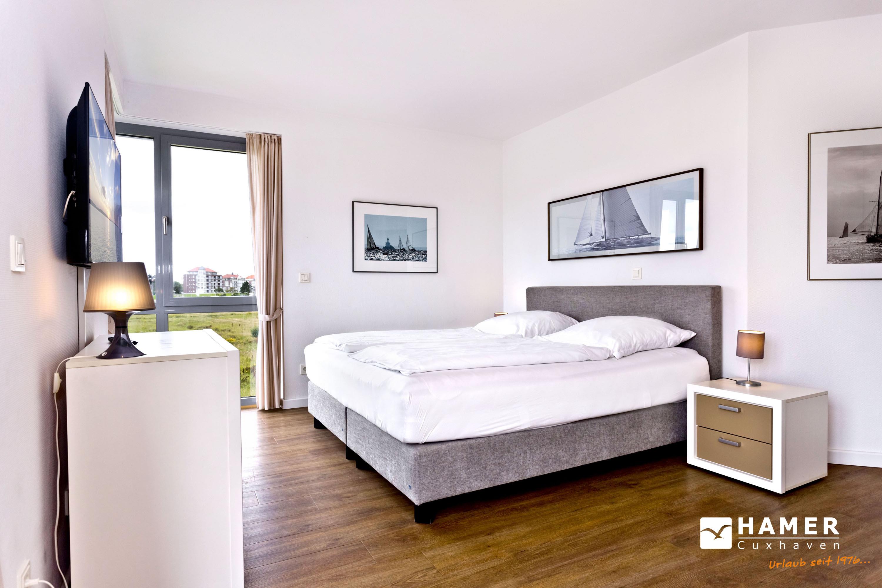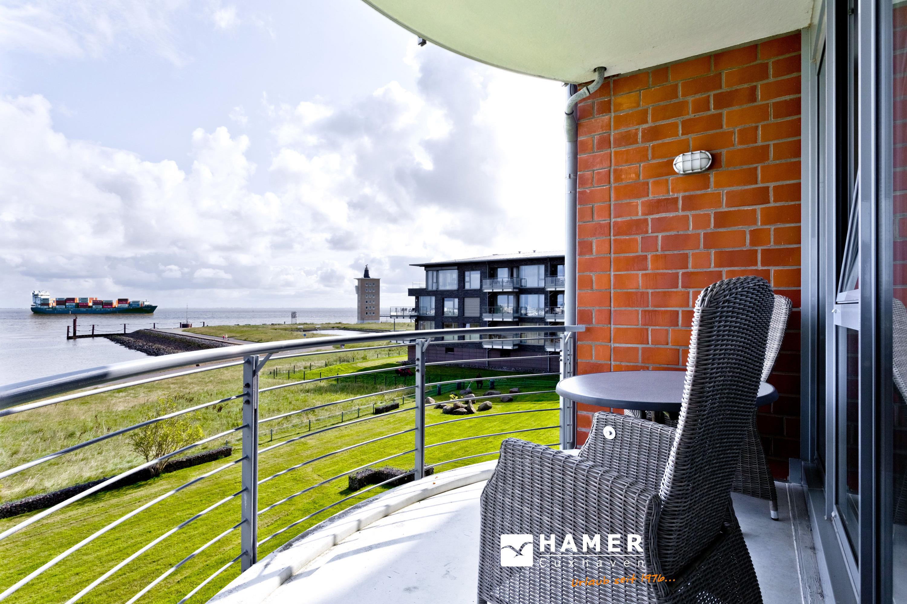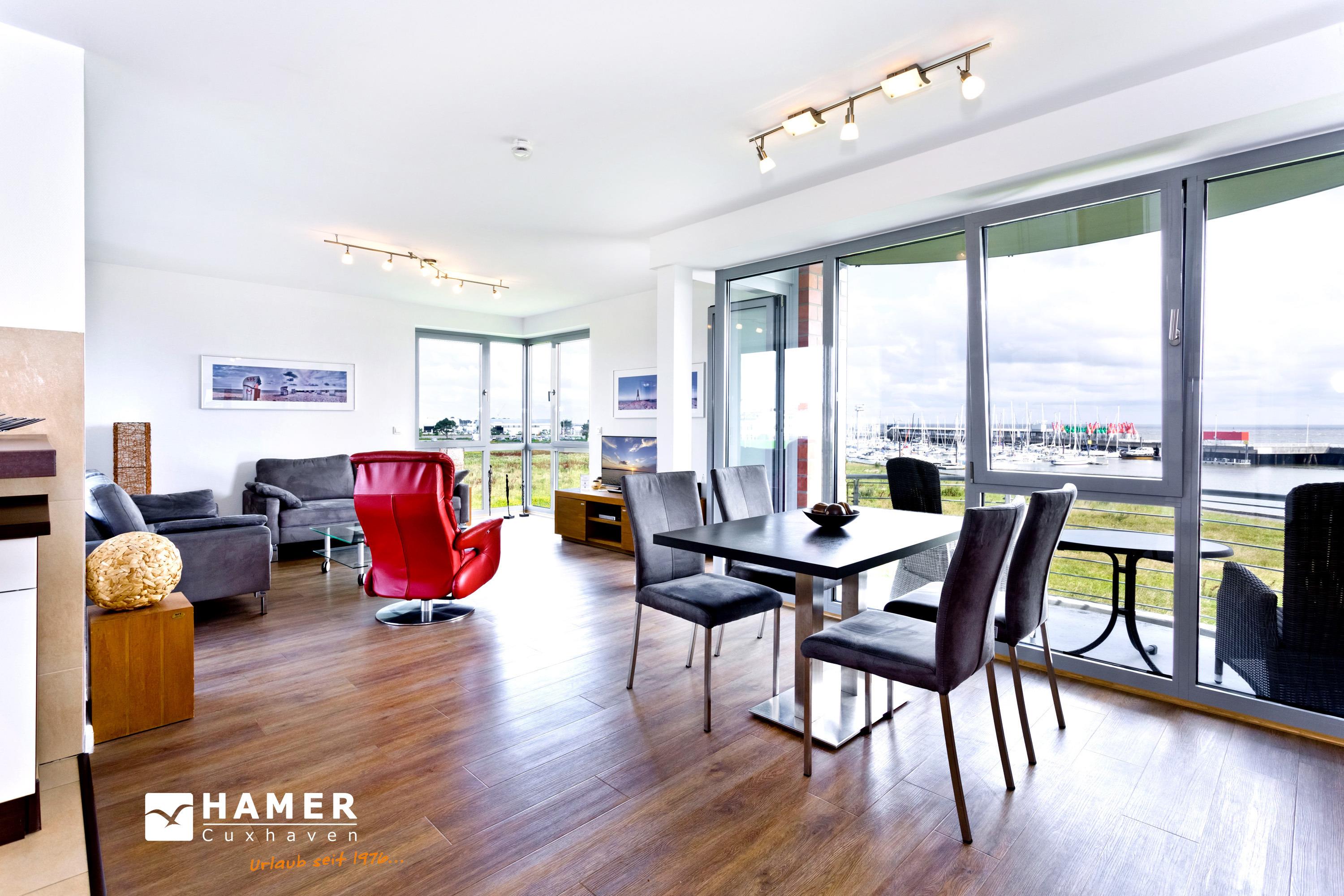 Aus allen drei Räumen dieser 105m² Wohnung in der 1.Etage haben Sie die Traumseesicht auf den Weltschifffahrtsweg. 2 Schlafzimmer jeweils mit Doppelbett (Boxspringbett), Bad/Du/Wc, Gäste-WC, großes Wohnzimmer mit komplett ausgestatteter Küchenzeile, 2xKabel/TV/DVD, 2 Balkone (nord+süd) mit Balkonmöbeln und Sonnenschirm (saisonabhängig). Alle Räume sind hochwertig gestaltet und verfügen über Rollladen. Wama i.d. Whg. Zur Wohnung gehört ein nummerierter Stellplatz auf dem Außengelände. Nichtraucher und keine Haustiere.