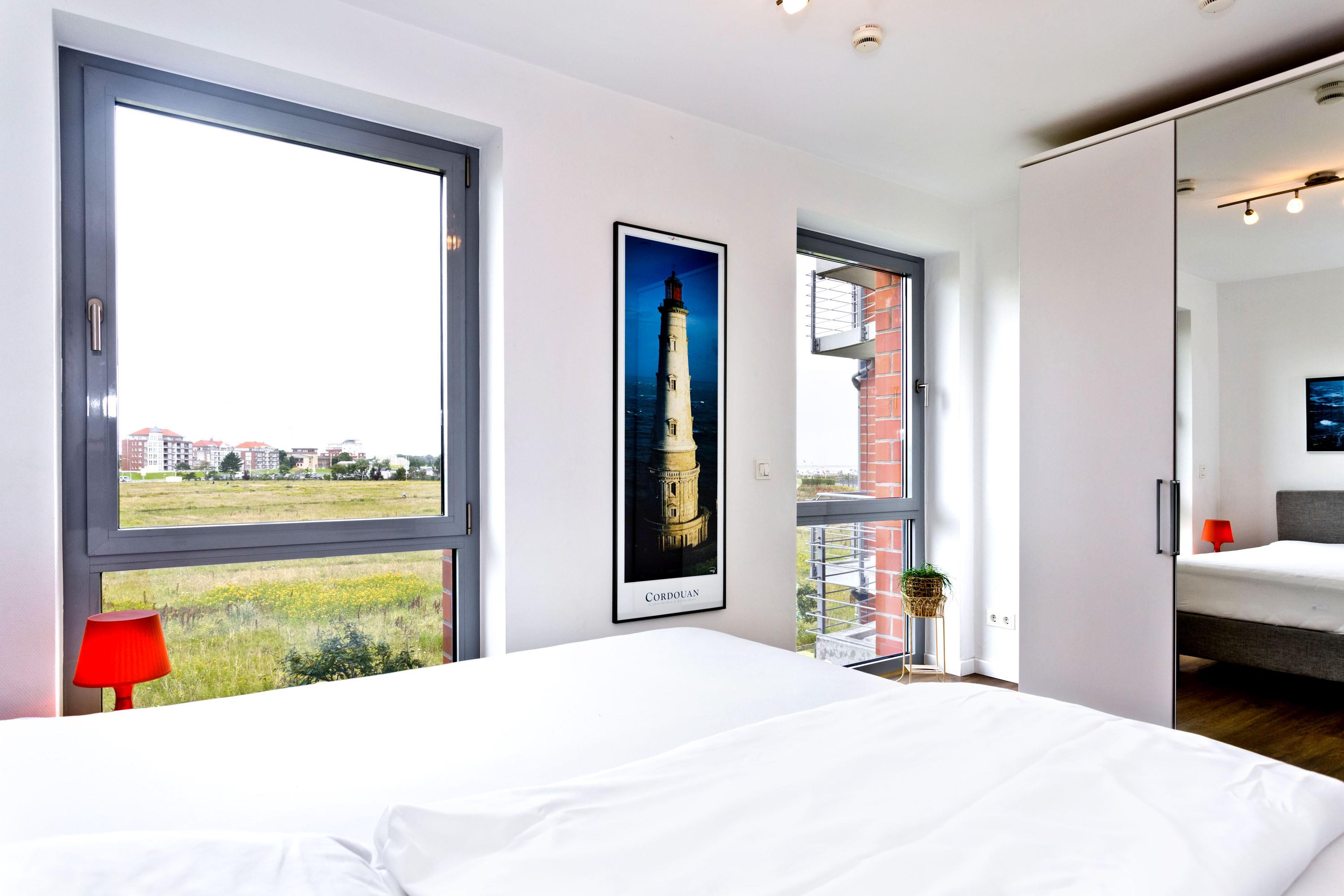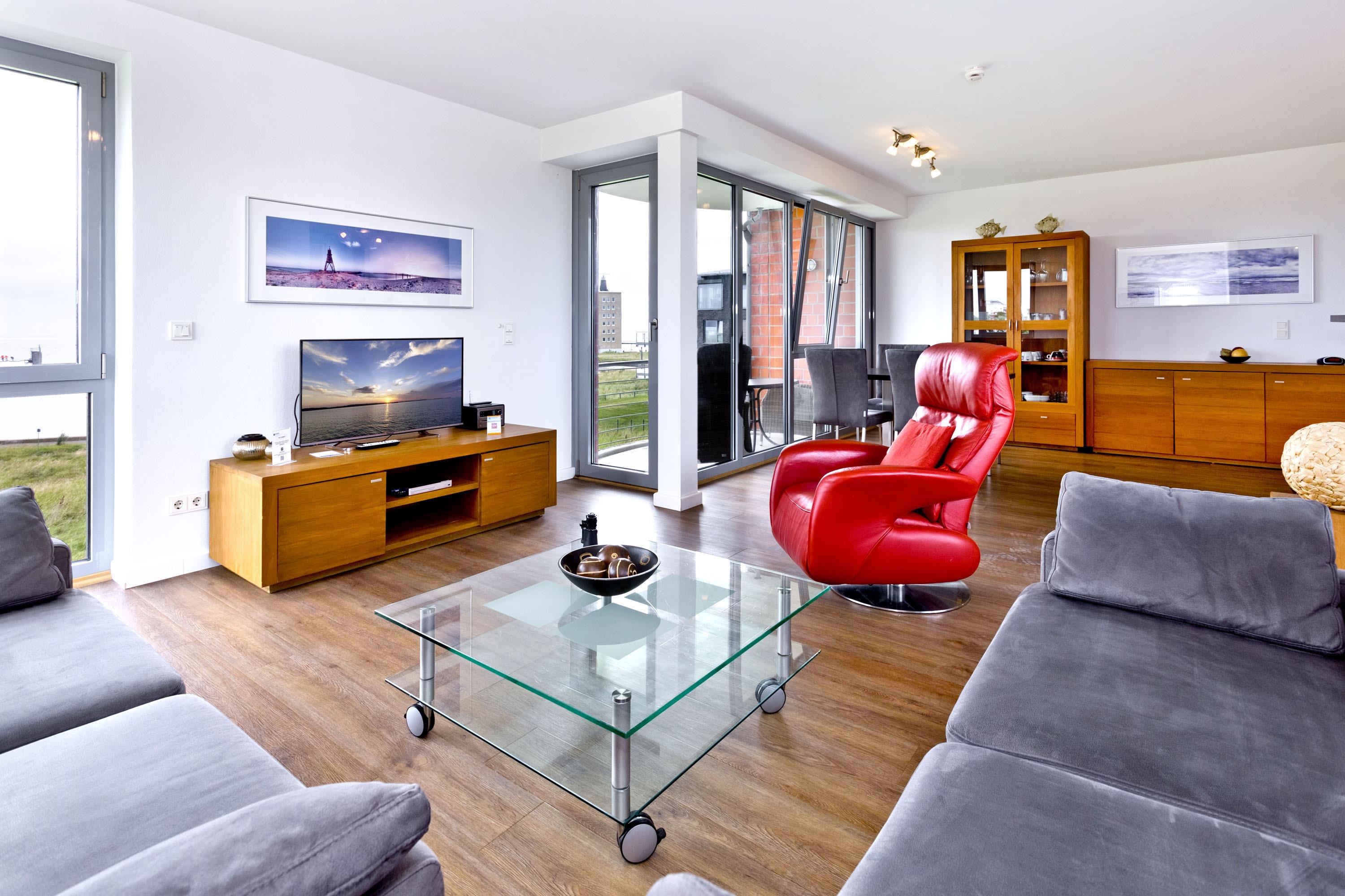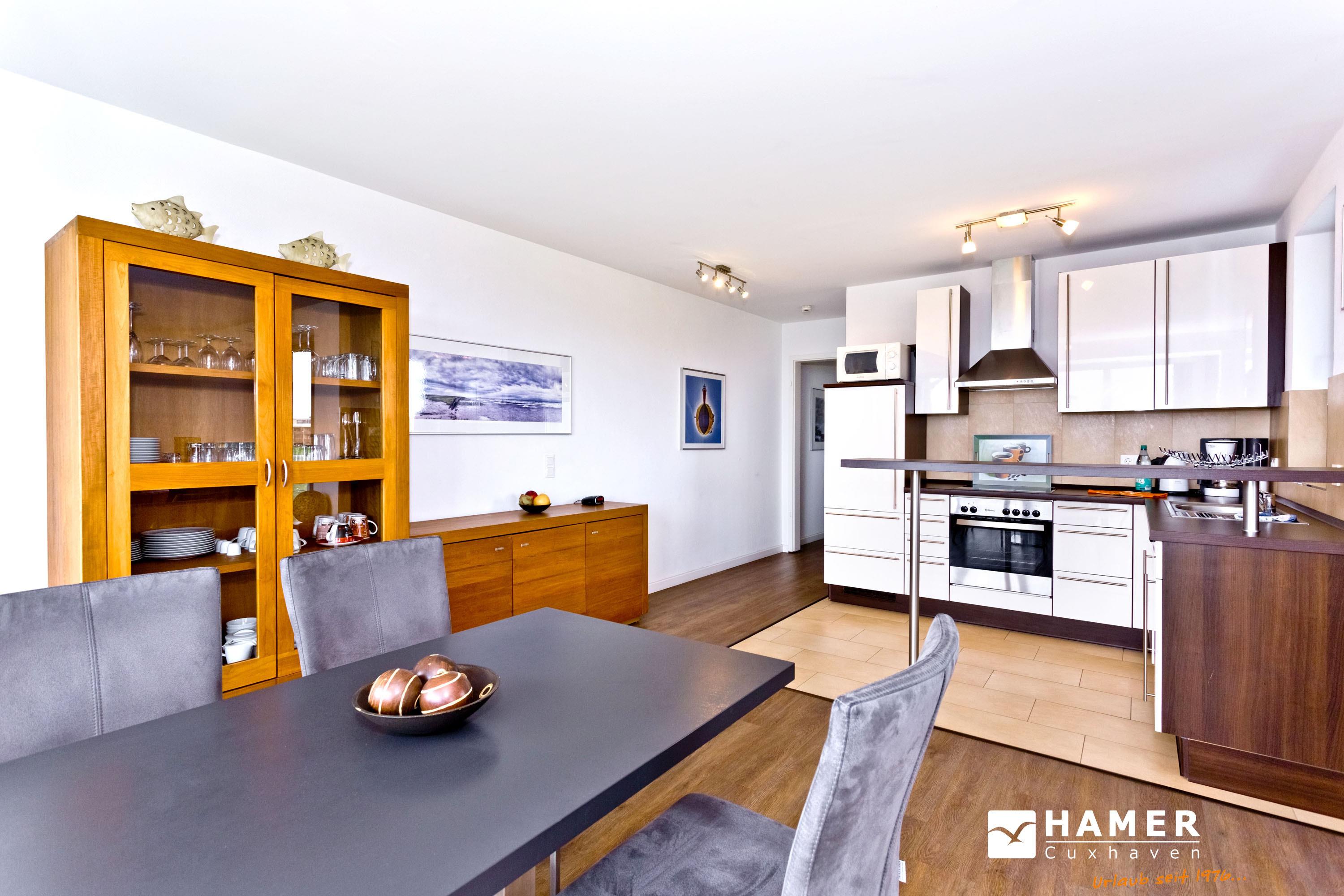 Aus allen drei Räumen dieser 105m² Wohnung in der 1.Etage haben Sie die Traumseesicht auf den Weltschifffahrtsweg. 2 Schlafzimmer jeweils mit Doppelbett (Boxspringbett), Bad/Du/Wc, Gäste-WC, großes Wohnzimmer mit komplett ausgestatteter Küchenzeile, 2xKabel/TV/DVD, 2 Balkone (nord+süd) mit Balkonmöbeln und Sonnenschirm (saisonabhängig). Alle Räume sind hochwertig gestaltet und verfügen über Rollladen. Wama i.d. Whg. Zur Wohnung gehört ein nummerierter Stellplatz auf dem Außengelände. Nichtraucher und keine Haustiere.