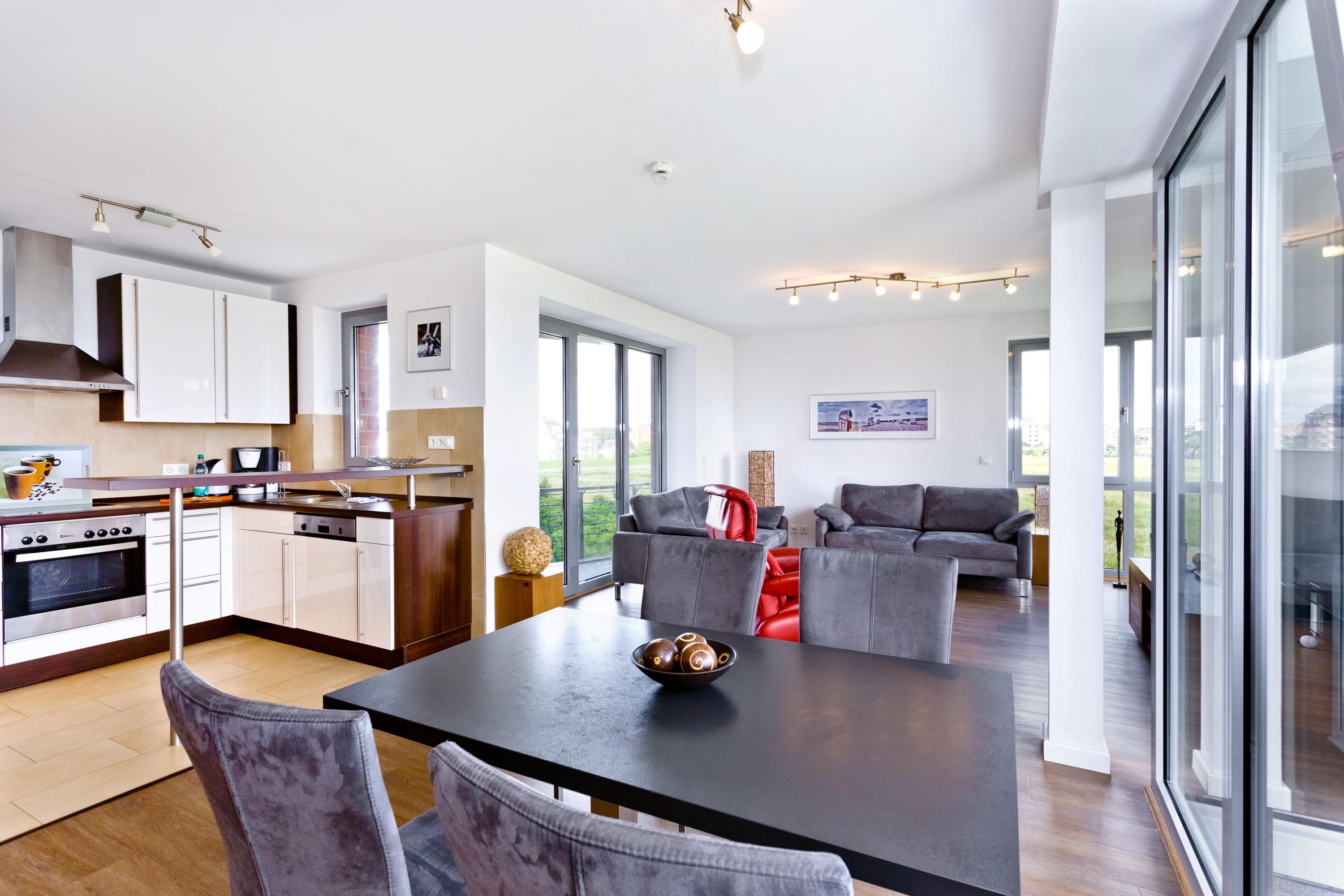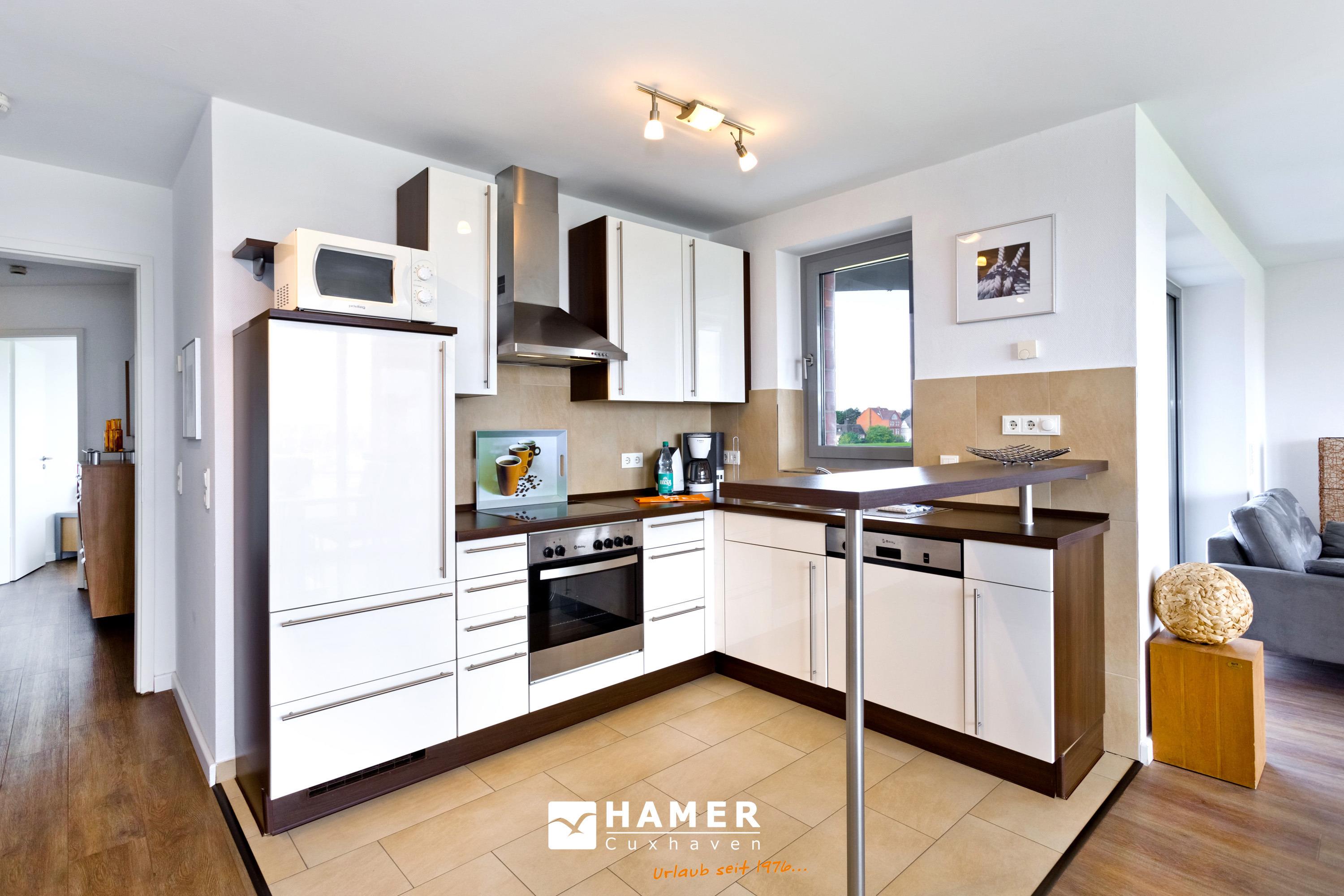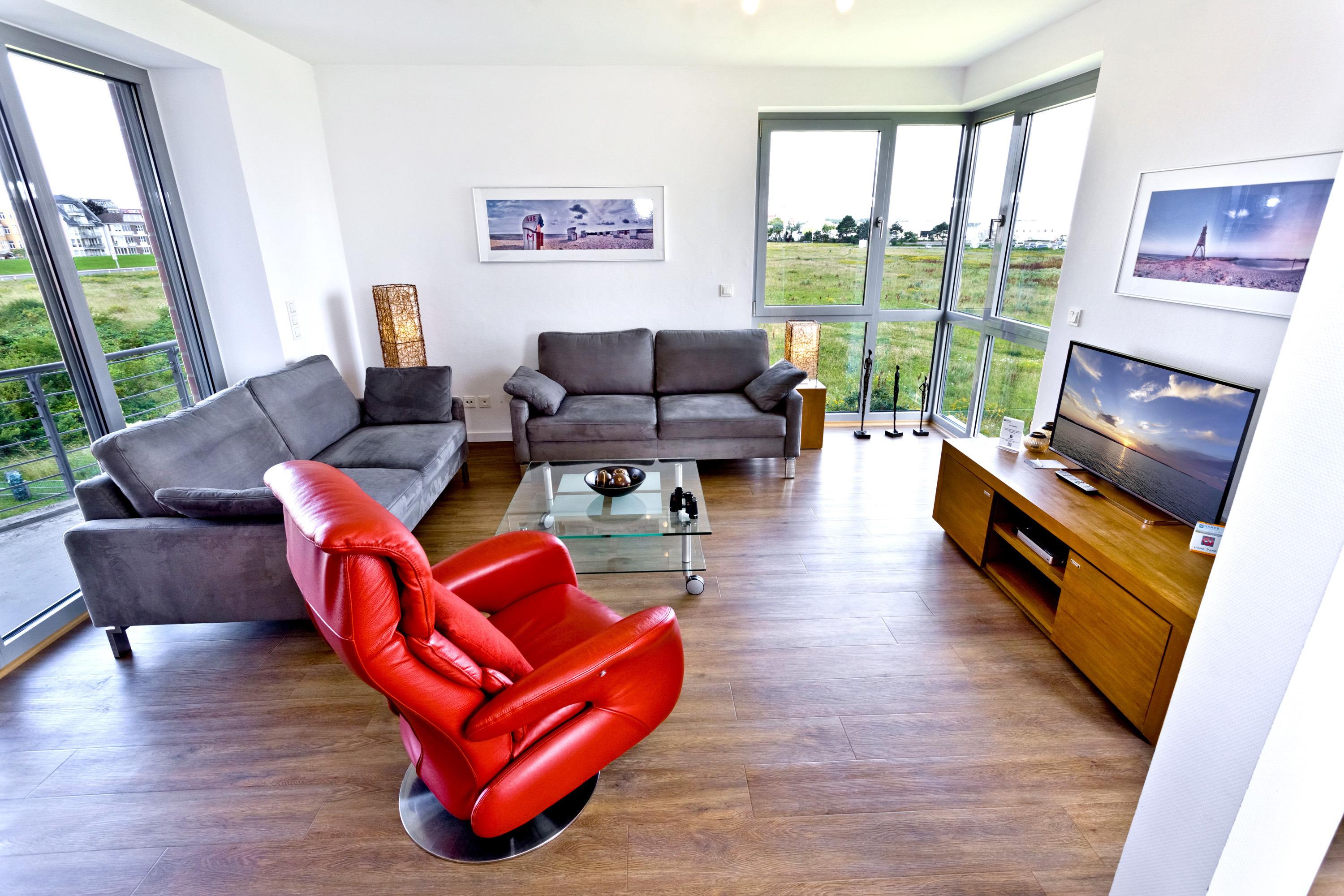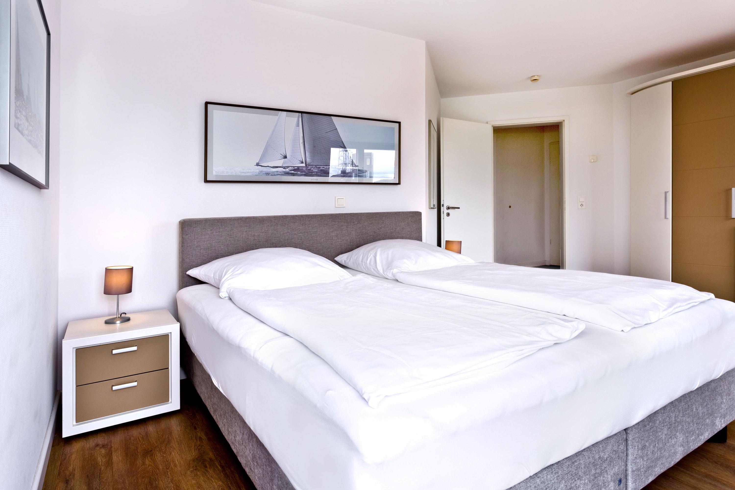 Aus allen drei Räumen dieser 105m² Wohnung in der 1.Etage haben Sie die Traumseesicht auf den Weltschifffahrtsweg. 2 Schlafzimmer jeweils mit Doppelbett (Boxspringbett), Bad/Du/Wc, Gäste-WC, großes Wohnzimmer mit komplett ausgestatteter Küchenzeile, 2xKabel/TV/DVD, 2 Balkone (nord+süd) mit Balkonmöbeln und Sonnenschirm (saisonabhängig). Alle Räume sind hochwertig gestaltet und verfügen über Rollladen. Wama i.d. Whg. Zur Wohnung gehört ein nummerierter Stellplatz auf dem Außengelände. Nichtraucher und keine Haustiere.