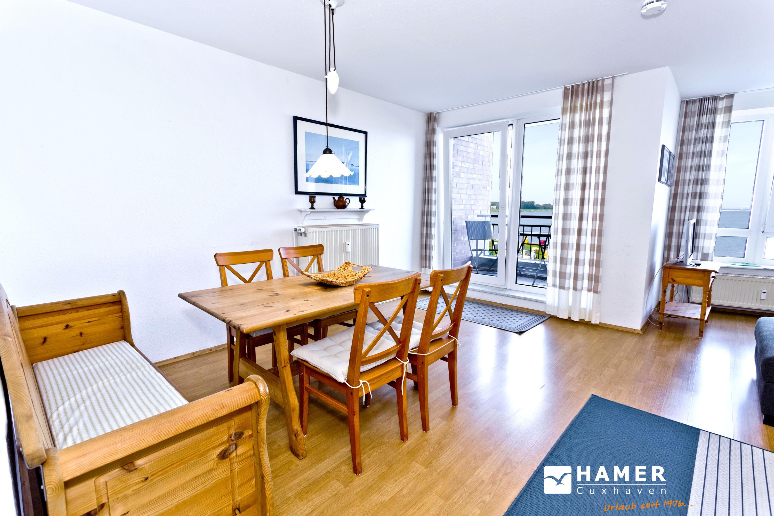 Großzügige 2-Raum-Wohnung für 2 Personen auf der 1. Etage (mit Aufzug) mit voller Seesicht bis hin zur Kugelbake. Wohnzimmer mit großzügigem Sofa, Kabel-TV, Radio, und Essplatz. Separate Küche inkl. Geschirrspüler, kleiner überdachter Balkon zur See (Nordseite), großes Schlafzimmer, Bad/Dusche/WC, kostenfreies W-lan, Stellplatz #13 auf dem Außengelände. Nichtraucher und keine Haustiere.