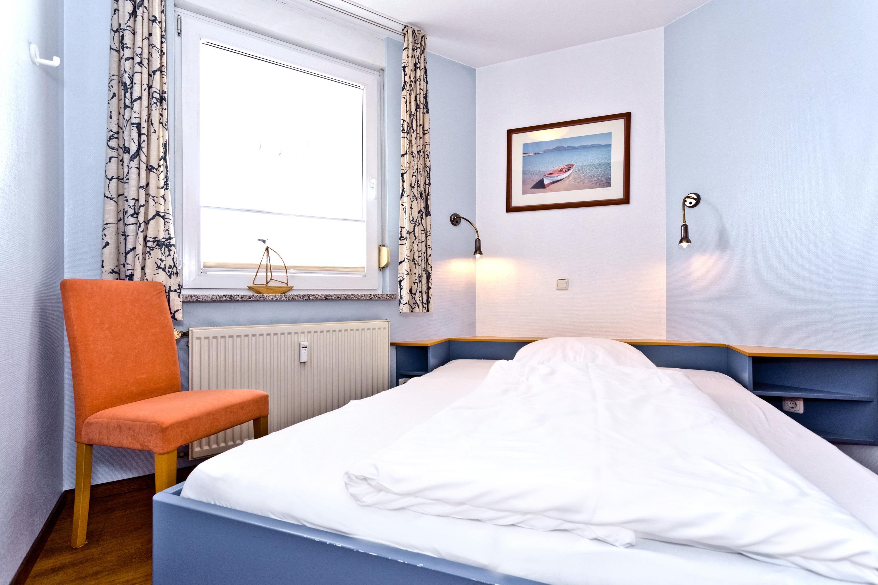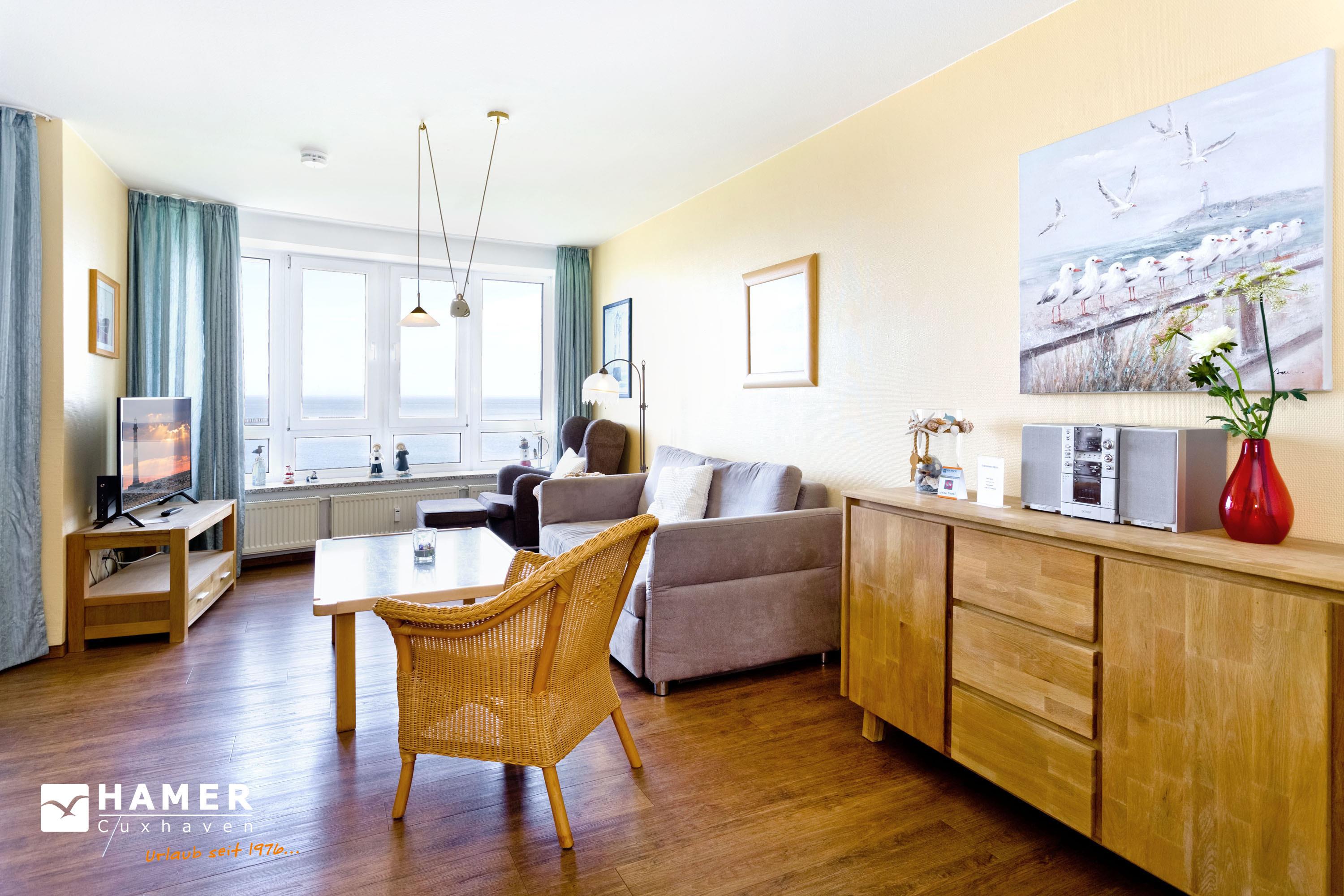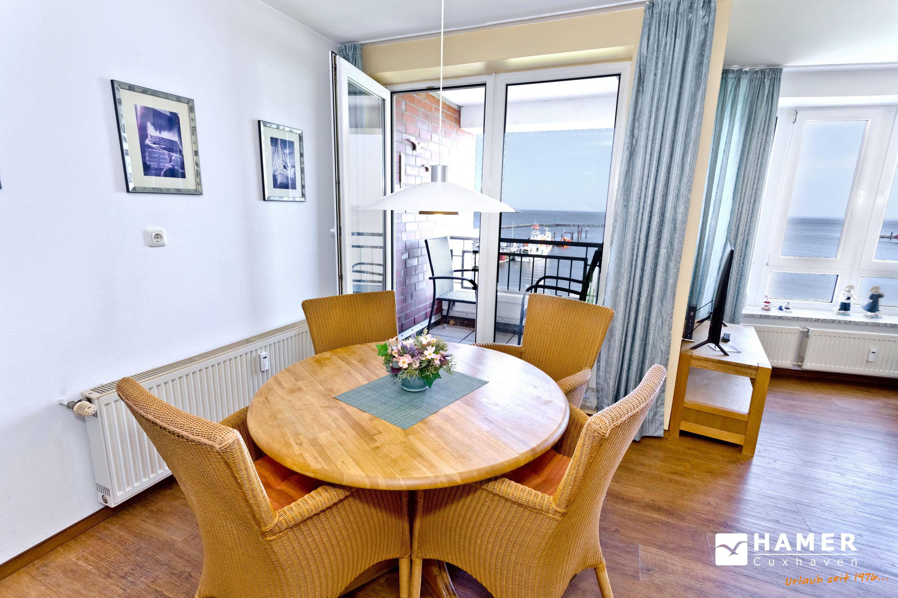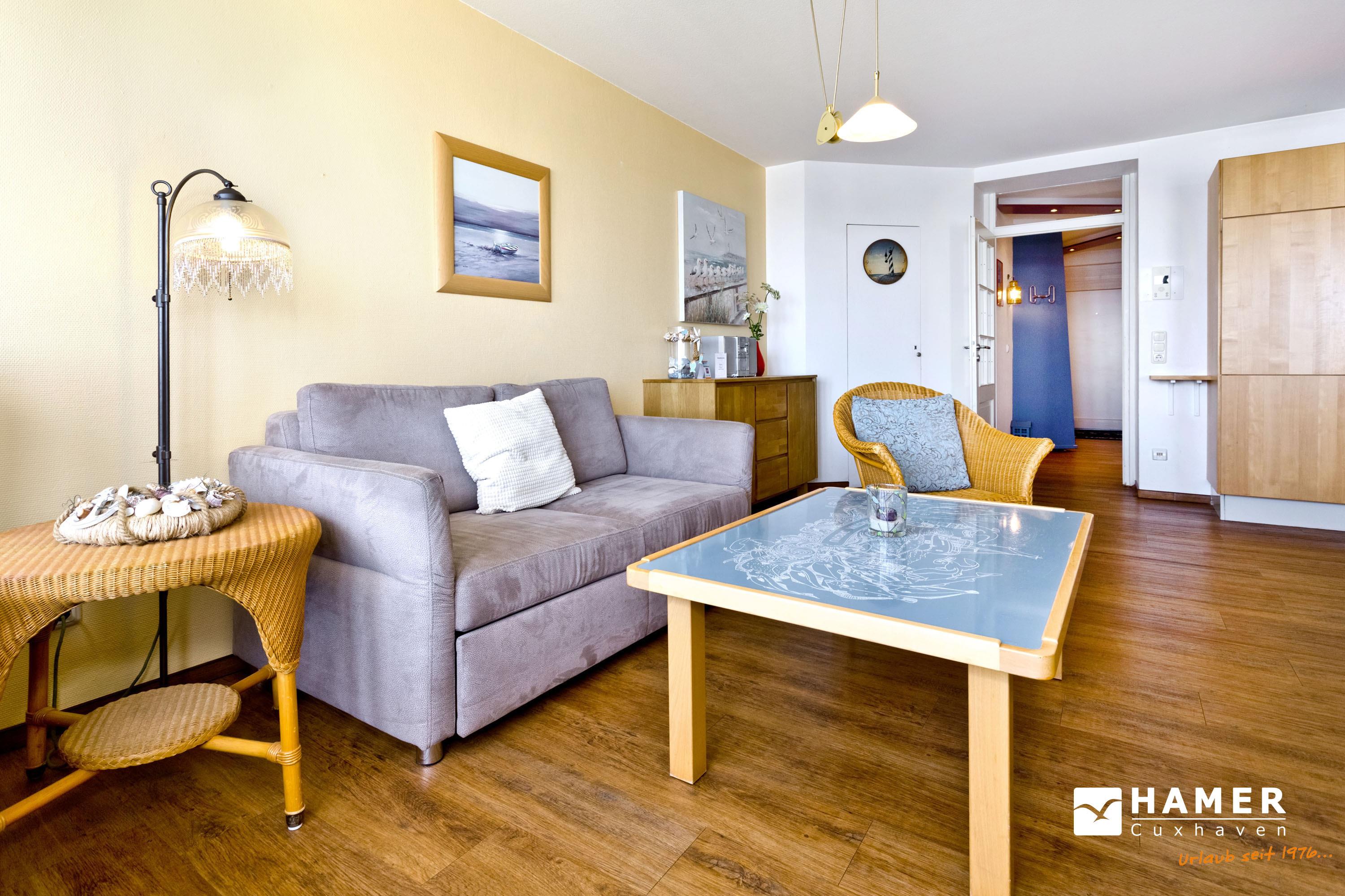 Schöne 2-Raum-Ferienwohnung für 2 Personen über ca. 50m² mit Sicht auf die Elbmündung. 3.Etage mit Aufzug, Schlafzimmer mit Doppelbett (2x75x190) und Rollladen, komplette Küchenzeile (Geschirrspüler, Mikrowelle etc.) Wohnzimmer mit Sofa, Kabel-TV, kostenfreies W-LAN, Esstisch, kleiner Balkon zur Seeseite (nord), nummerierter Pkw-Stellplatz #36 am Haus.