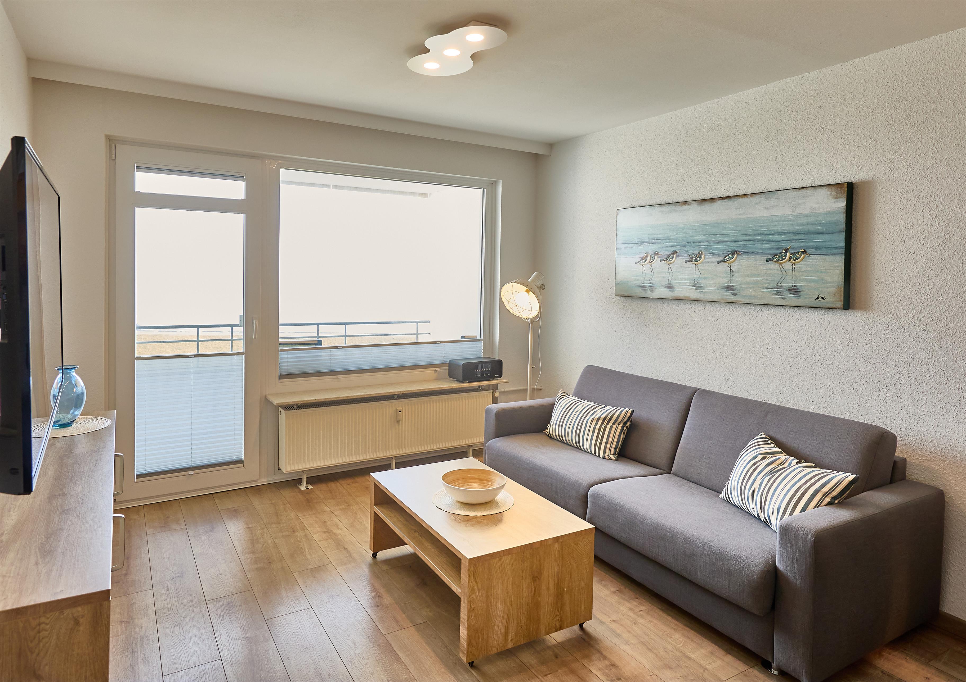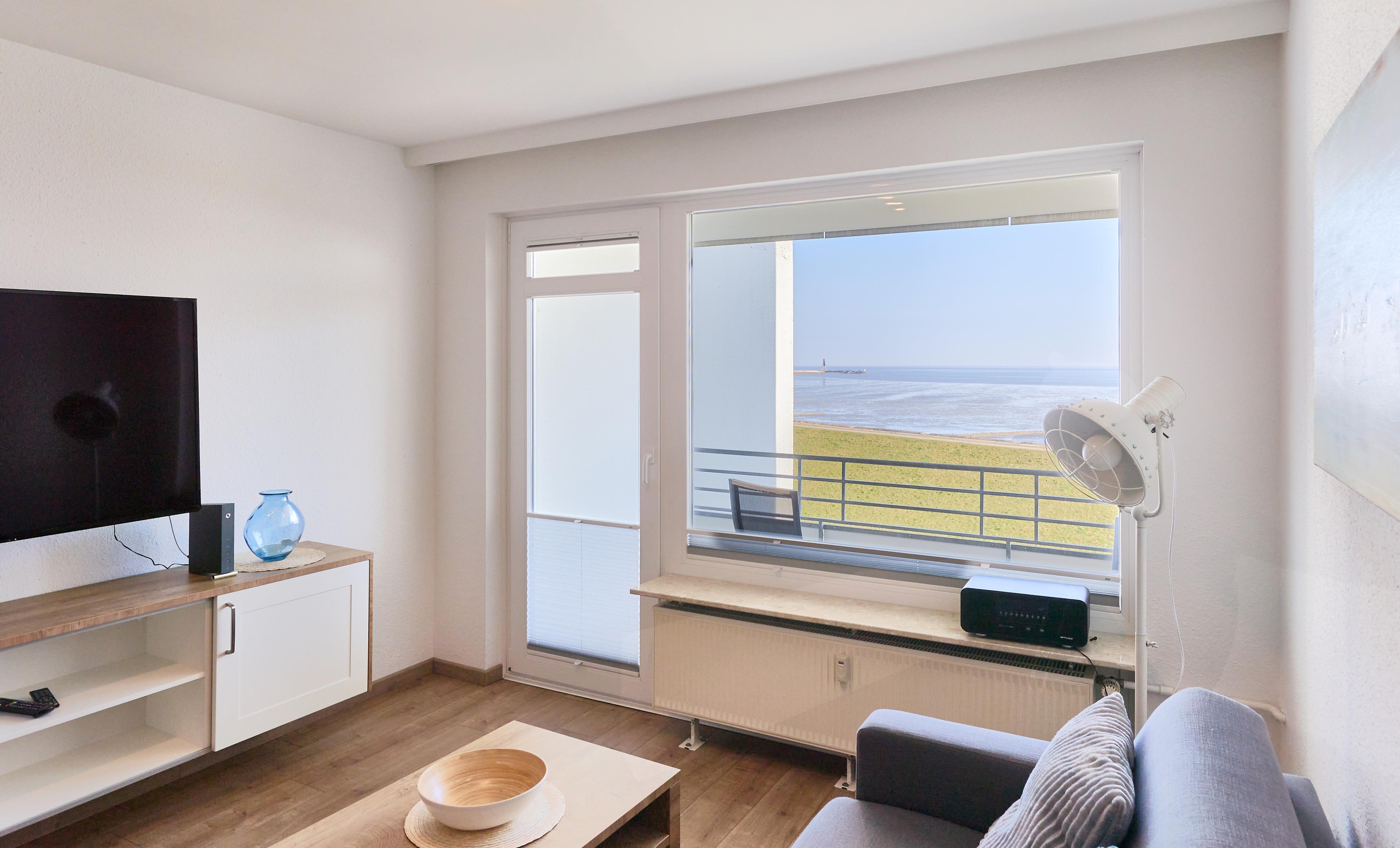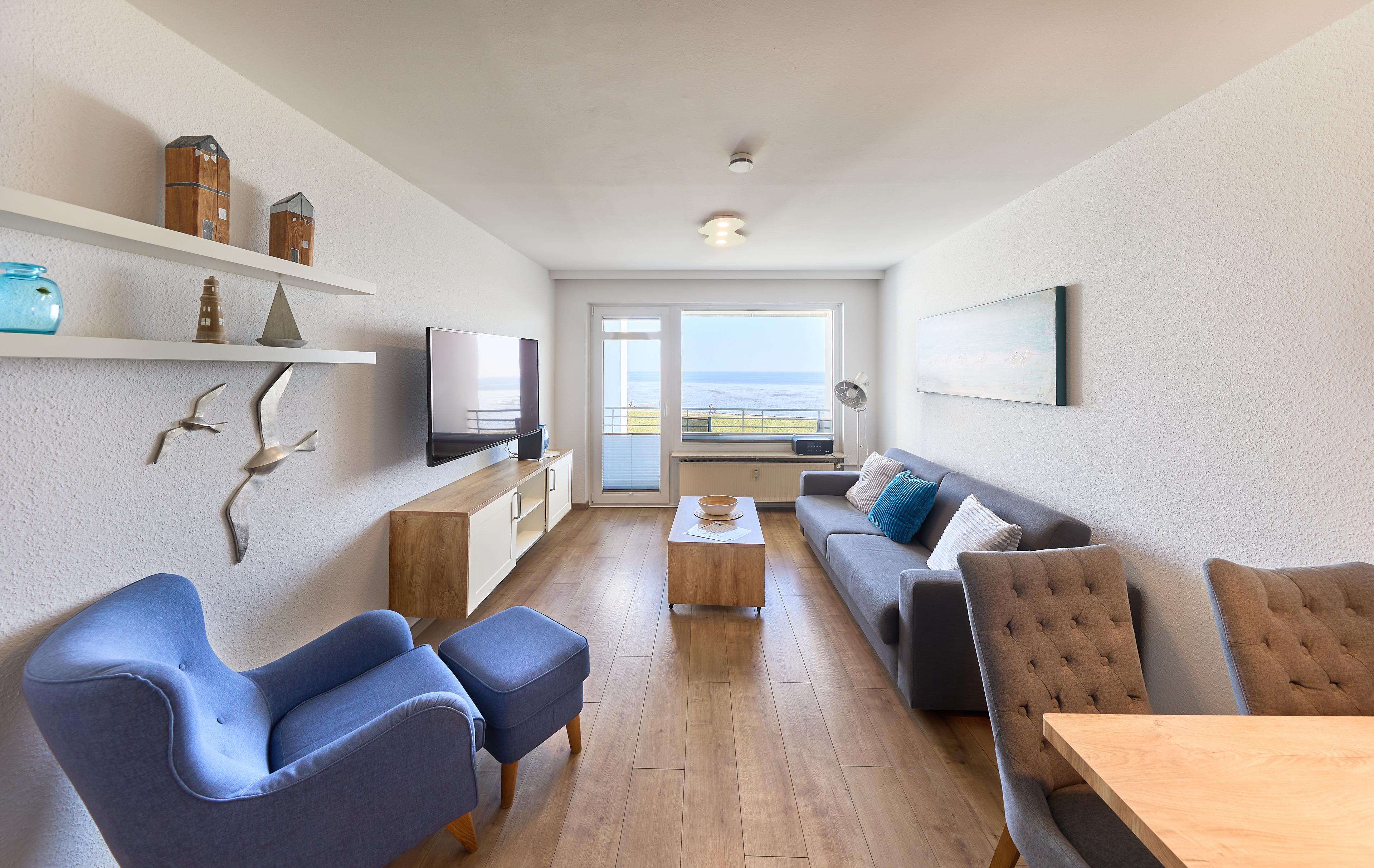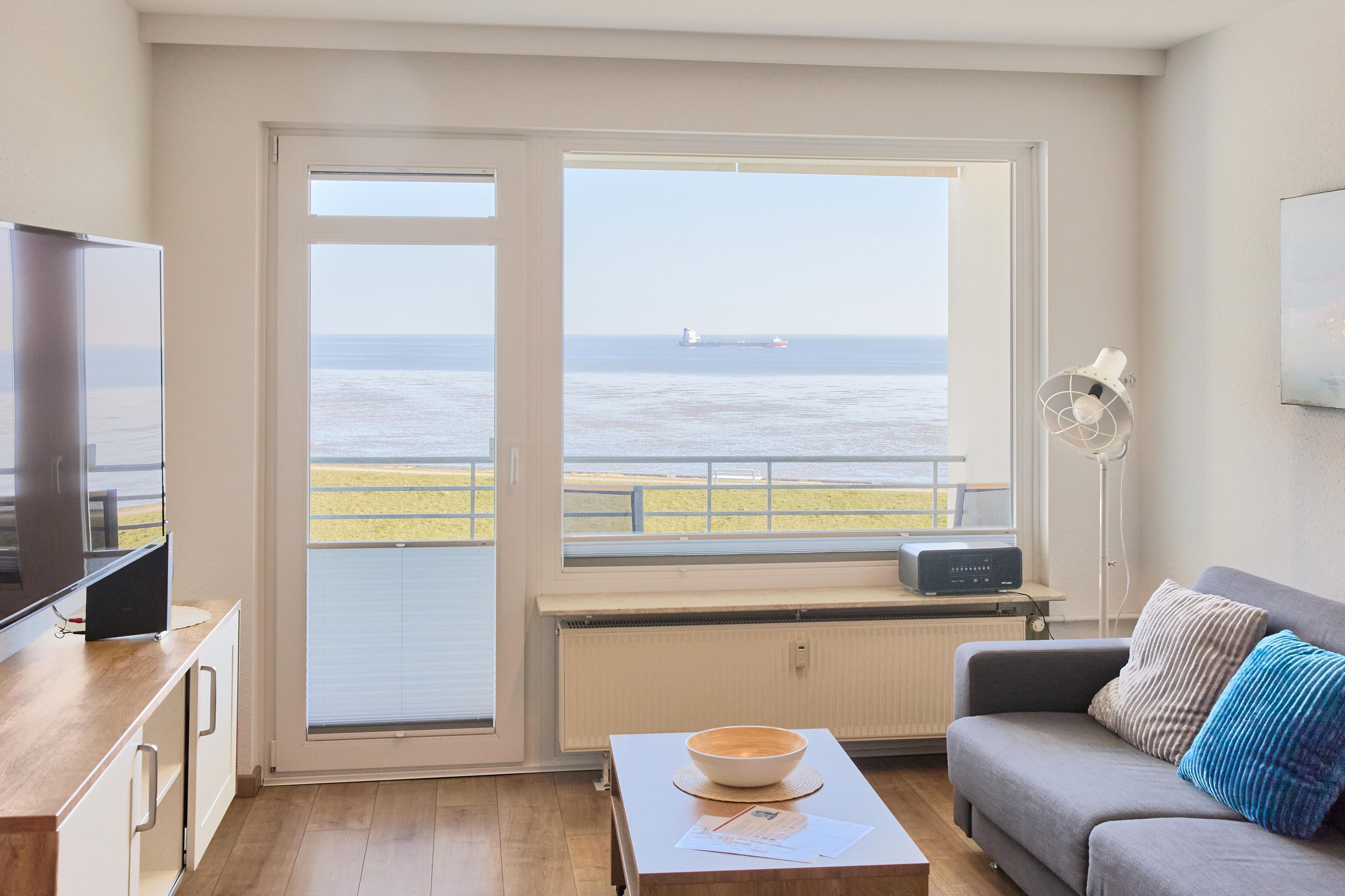 Der Wohnbereich ist einladend gestaltet und bietet viele gemütliche Momente – ob bei einem Buch, bei TV-Abenden oder beim Beobachten des Schiffsverkehrs.