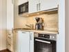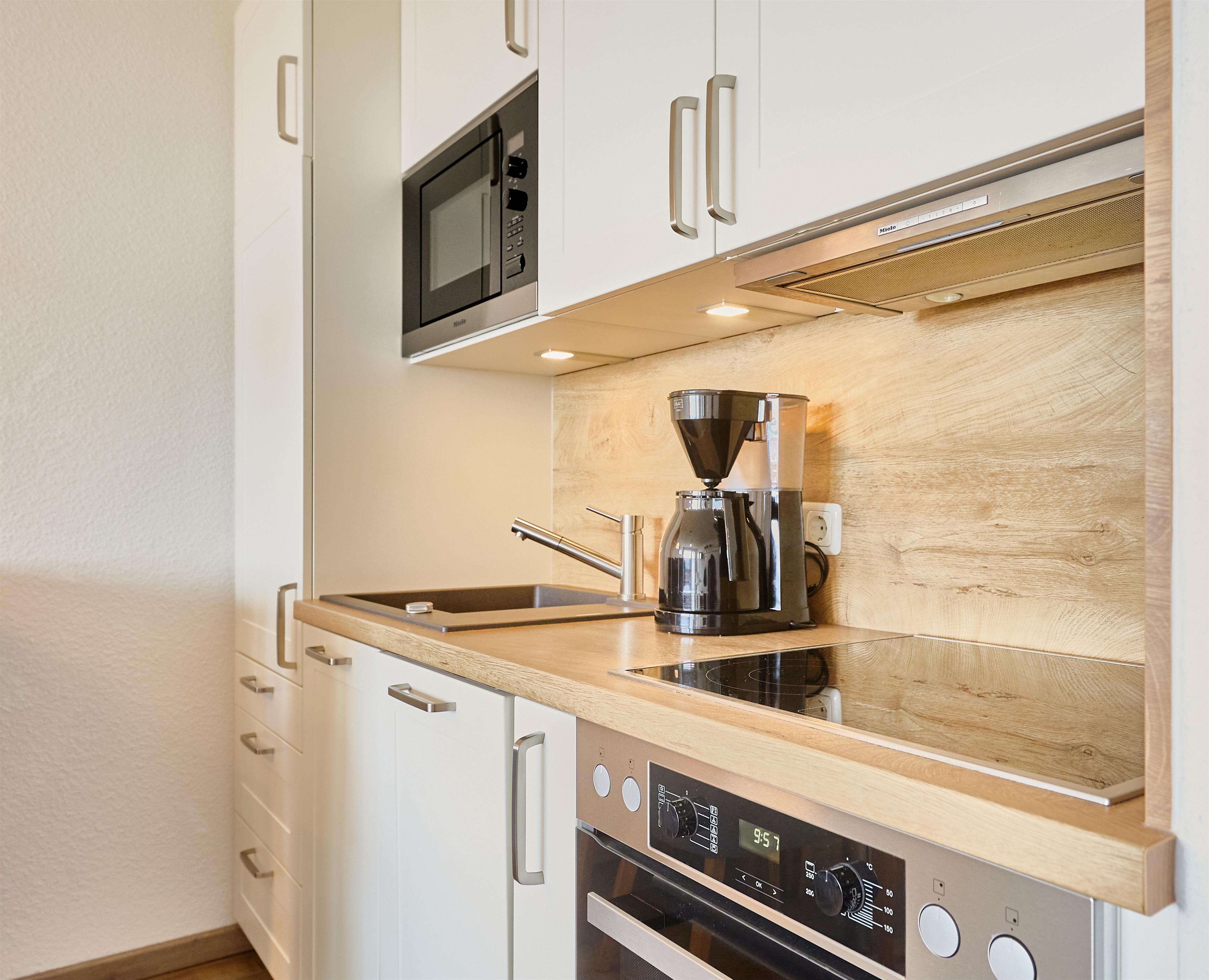Die Küche ist vollständig eingerichtet und bietet alles für die Selbstverpflegung. Der Essbereich grenzt direkt an und eignet sich für gemeinsame Mahlzeiten.