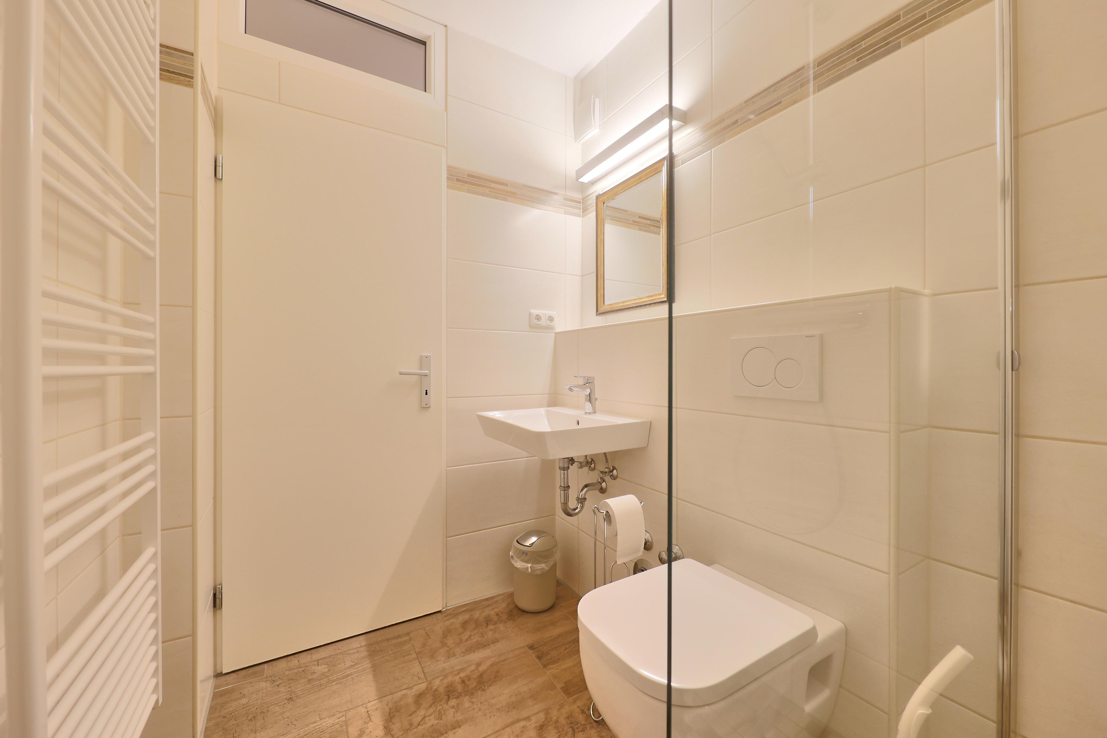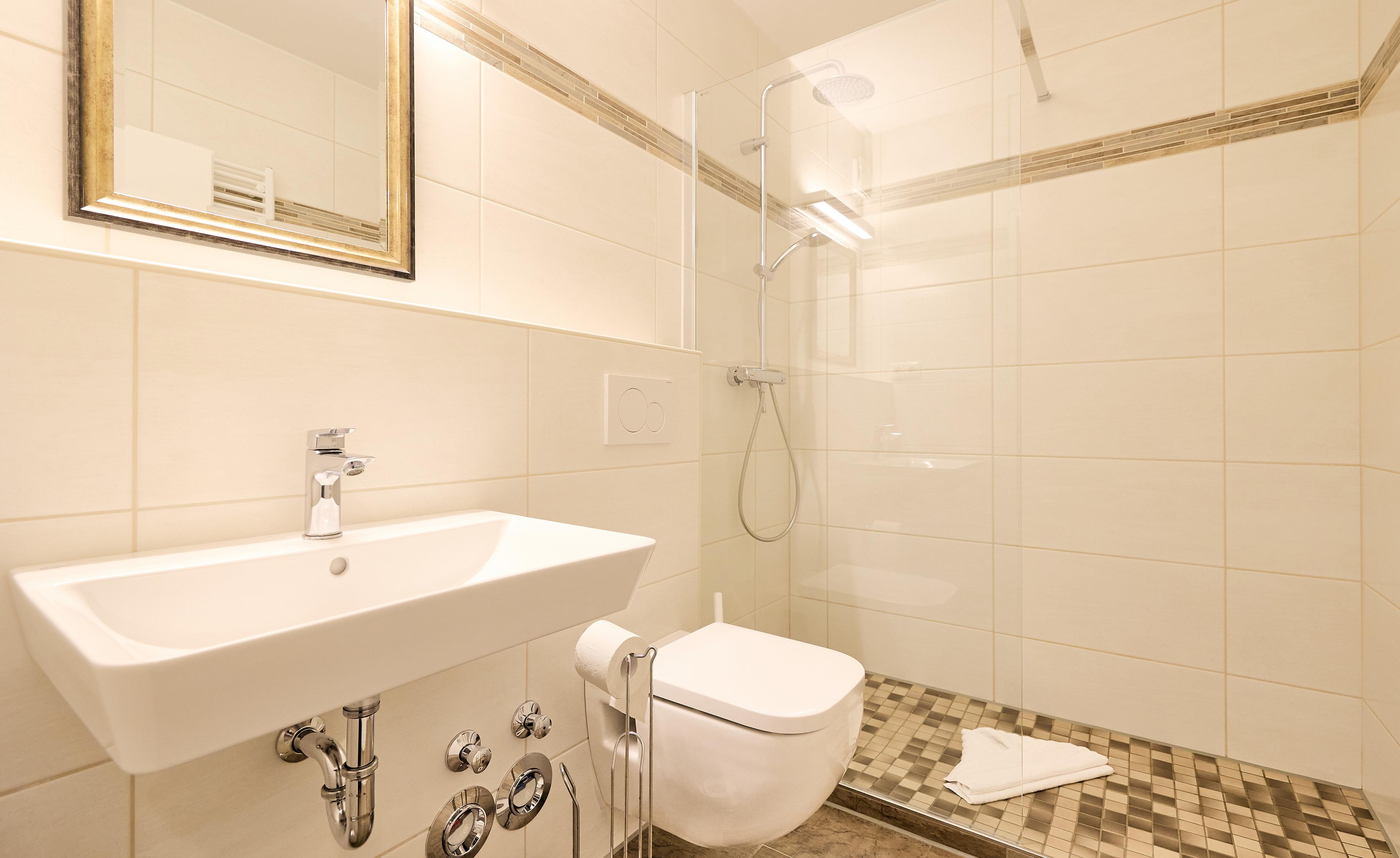 Das Badezimmer ist praktisch ausgestattet und sorgt mit einer fast ebenerdigen Dusche für guten Komfort.