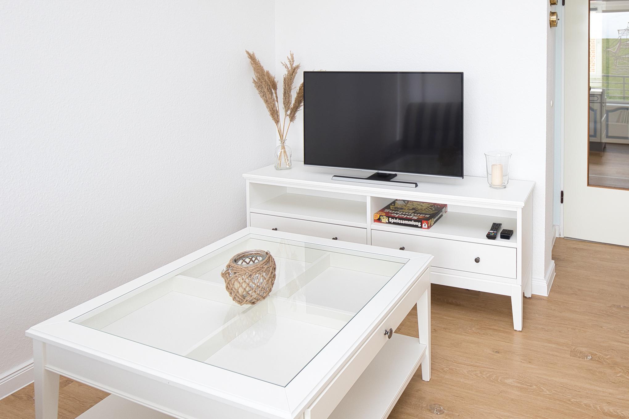 Die Ferienwohnung empfangt Sie in der Diele, großzügig mit Garderobe und dem Zugang zur Küche, zum Duschbad und zum Wohnbereich. Eine Waschmaschine, Kühlschrank mit Gefrierfach befinden sich direkt in der mit vielen Ablagen gut ausgestatteten Küche. Der Essbereich, der sich im Wohnzimmer befindet, bietet auch für ein Frühstücksbrunch genügend Platz am Tisch und wenn es das Wetter zulässt wird am Abend der Wein auf dem Balkon ausgeschenkt. Auch wenn Sie hier keine Seesicht genießen, die direkte Deichnähe lässt Sie entspannen. Wenige Schritte und Sie sind auf der der Deichkrone und haben das Wasser zum greifen nahe. Das Bojenbad in der Grimmershörnbucht ist nur wenige Meter entfernt.