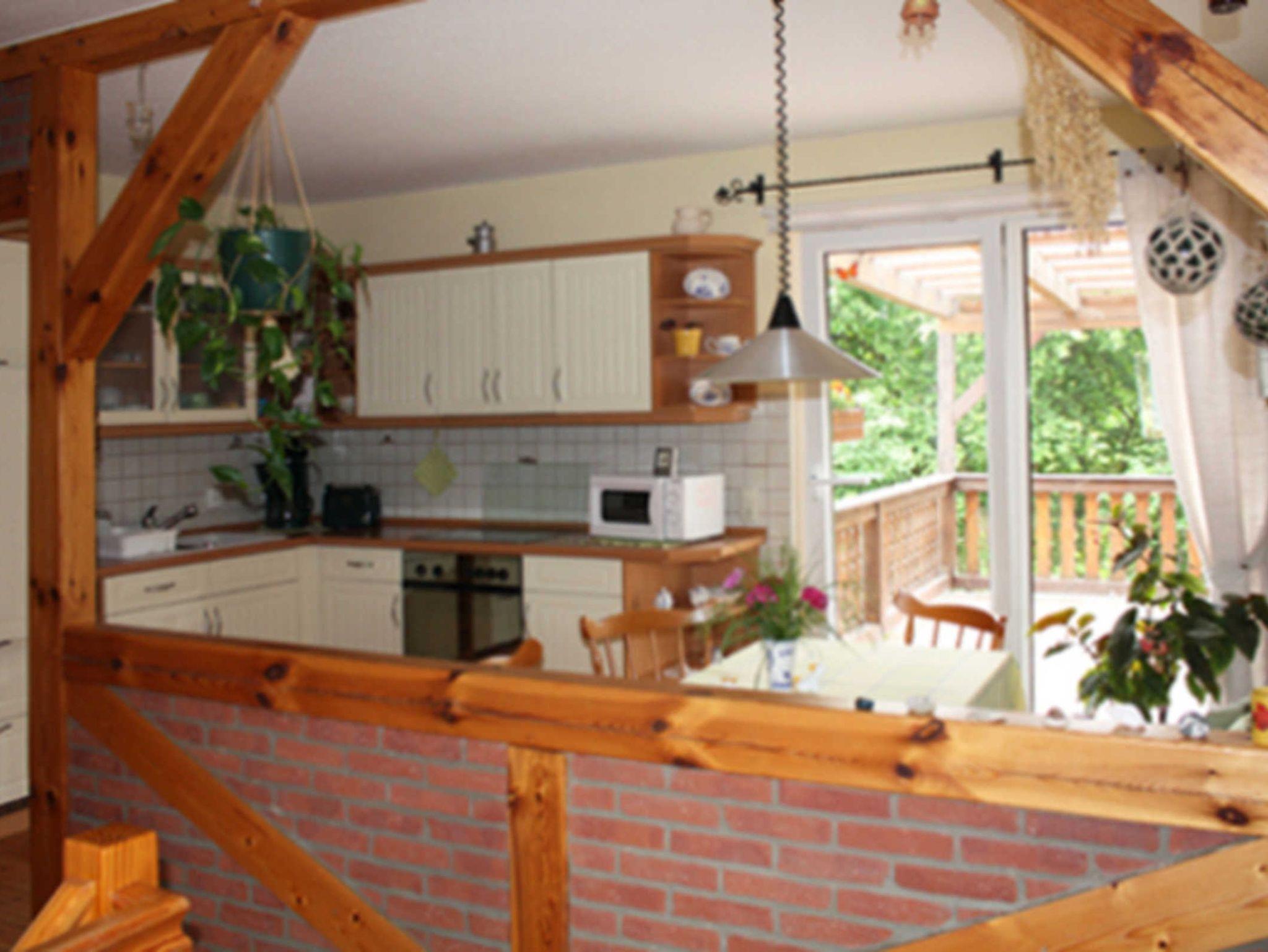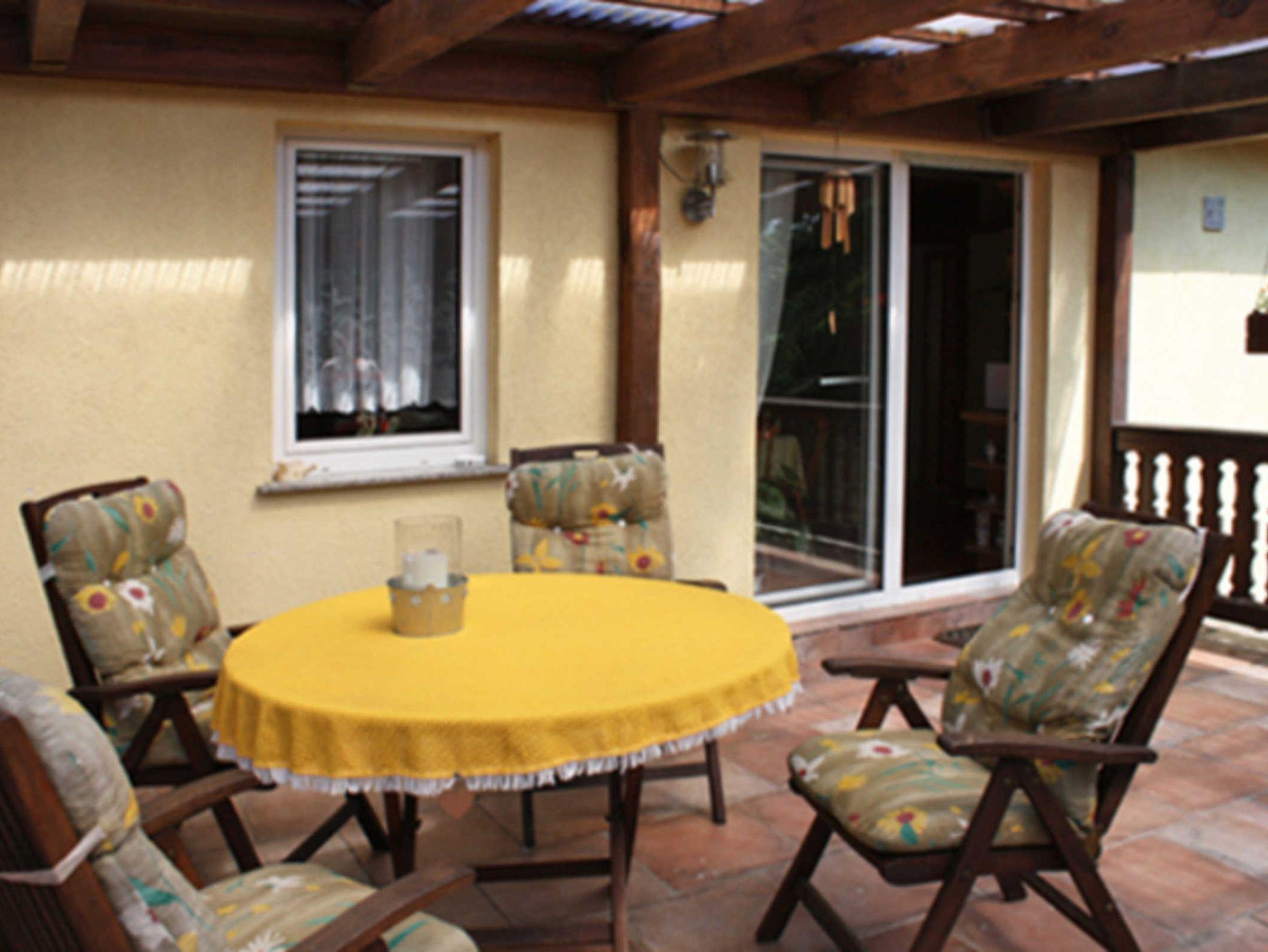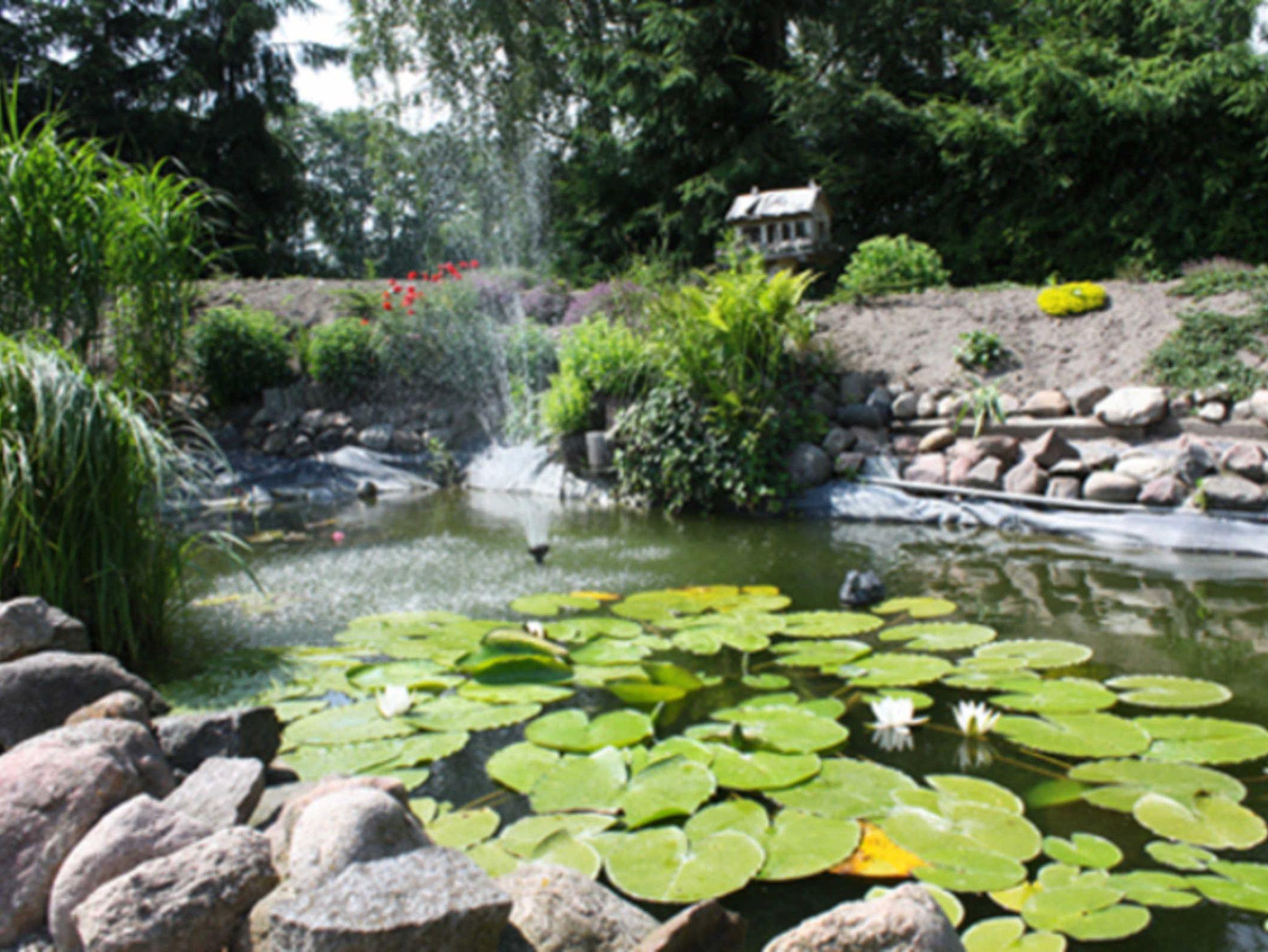 Die Ferienwohnung hat einen separaten Eingang ( ca 78 m²groß ). Die Terrasse mit Blick in den Garten ist komplett überdacht .Man schaut direkt in den Garten mit angelegtem Teich.