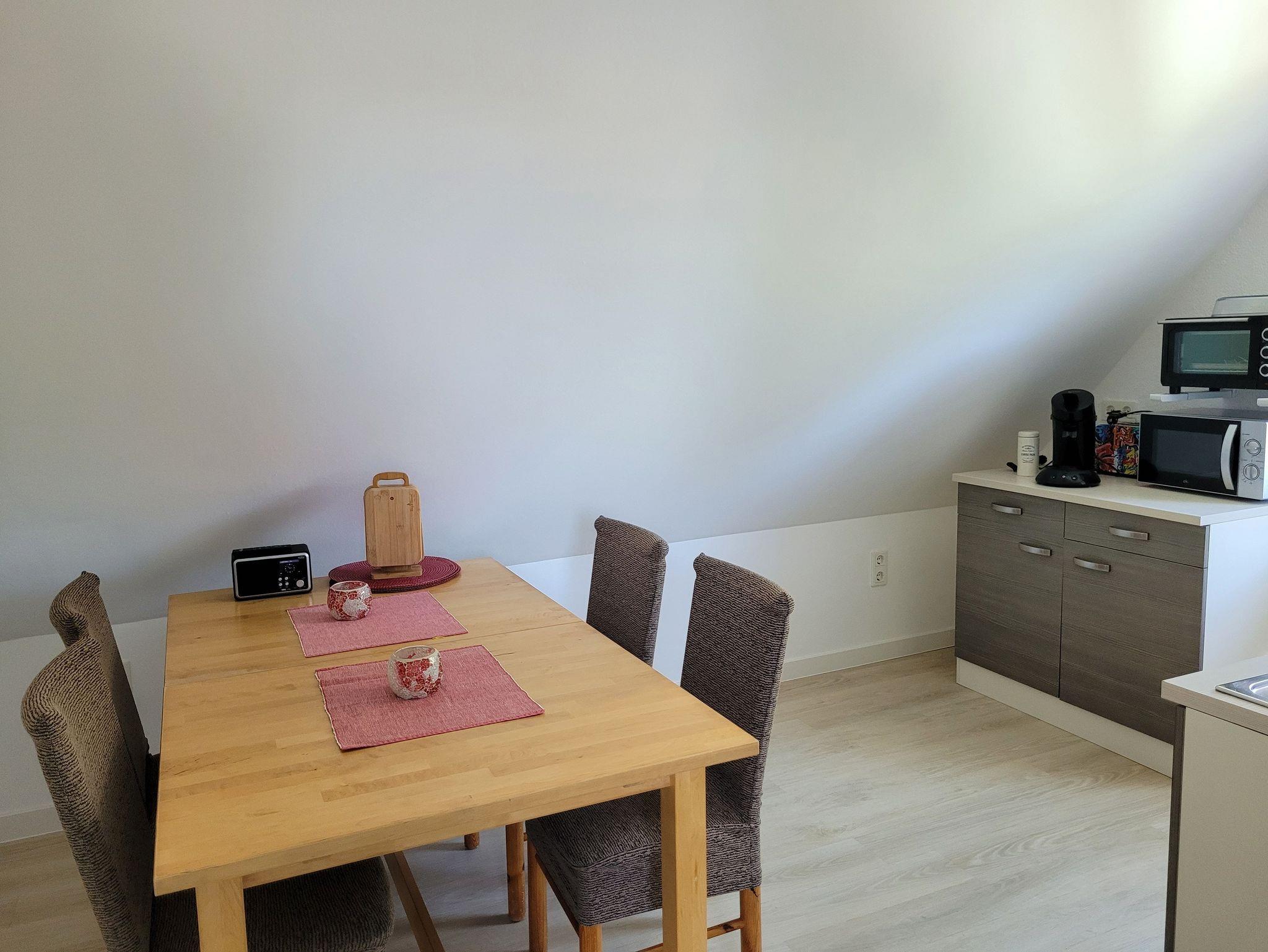 Die offen gestaltete separate Küche ist vollständig ausgestattet und bietet alles, was Sie für Ihren Aufenthalt benötigen ? inklusive Kühlschrank, 2-Platten-Ceranherd, Toaster, Minibackofen, Mikrowelle, Senseo-Kaffeemaschine (Pad) und Esstisch für gemeinsame Mahlzeiten.