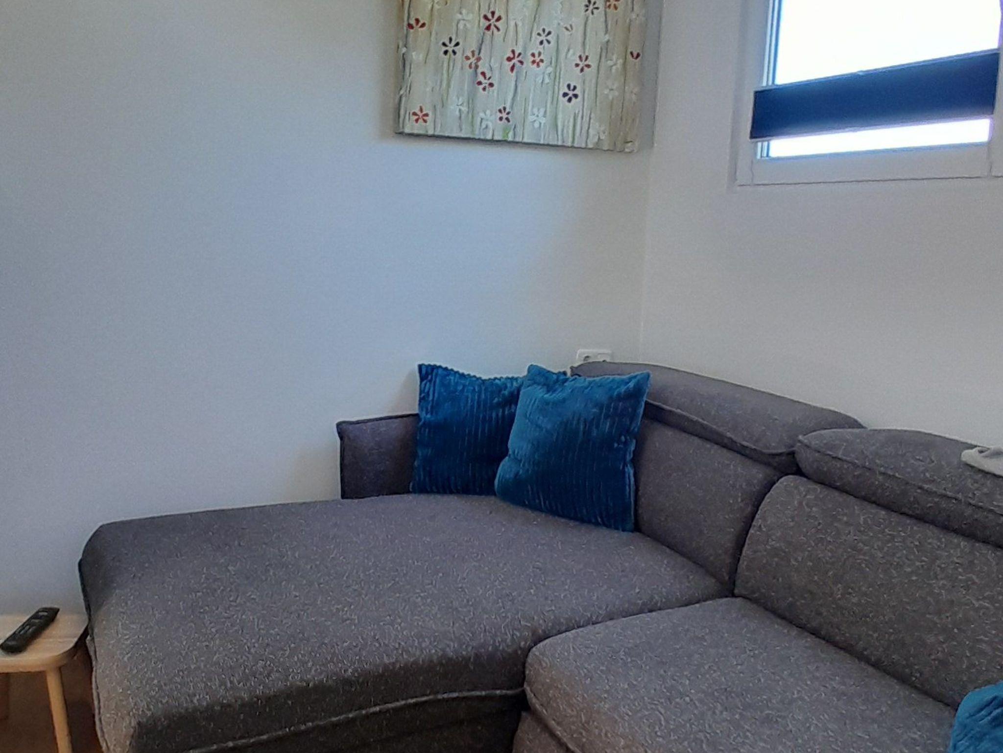 Ein Wohnzimmer mit ausziehbarer Schlafcouch, welche Platz für gemütliche Abende bietet. Lesen, träumen, spielen. Der Fernseher wird mit Internet TV betrieben, WLAN ist im Tiny ebenfalls verfügbar.