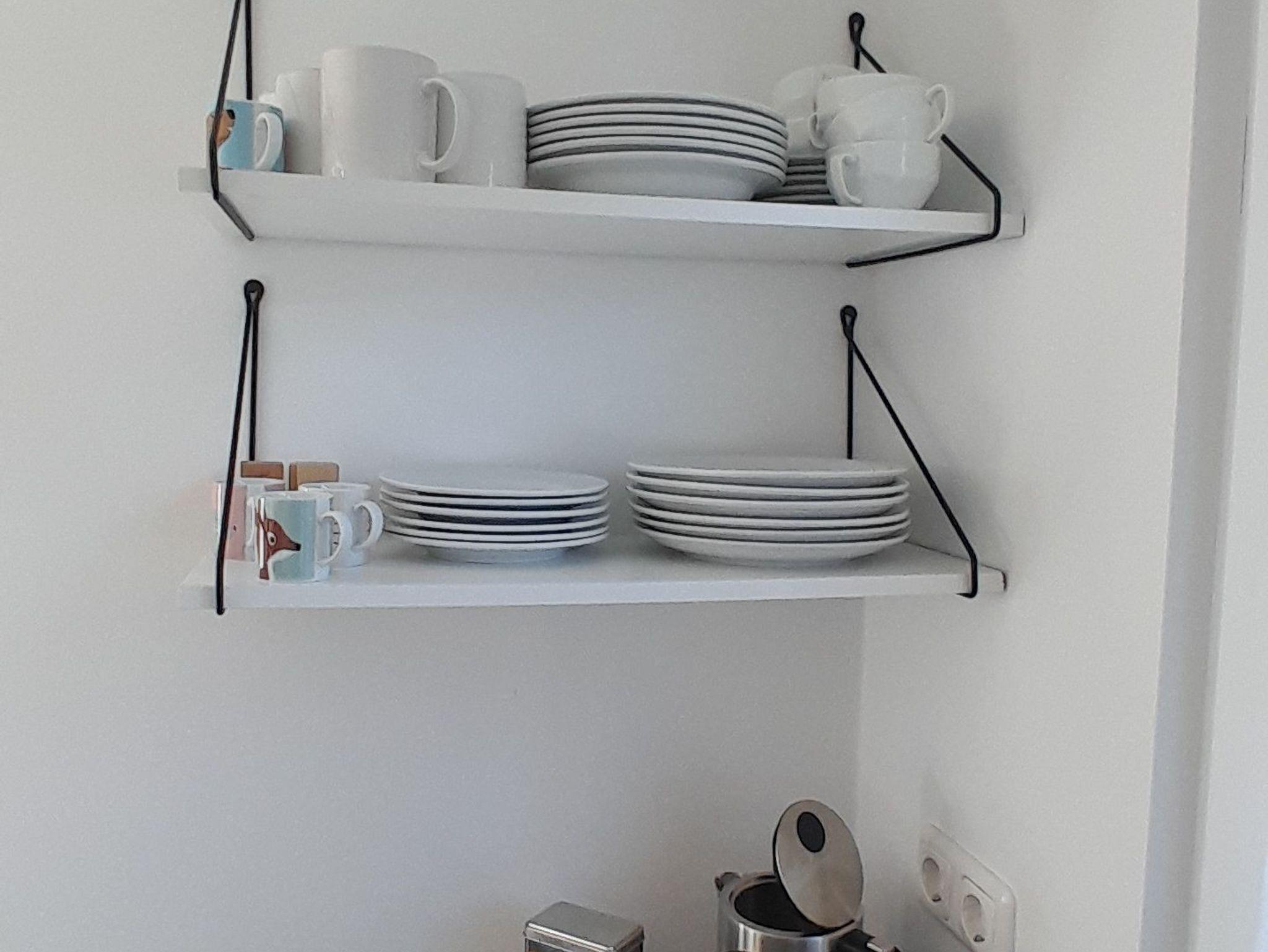 In der Küche finden Sie einen Airfryer, Wasserkocher sowie einen kleinen Kaffeekocher.