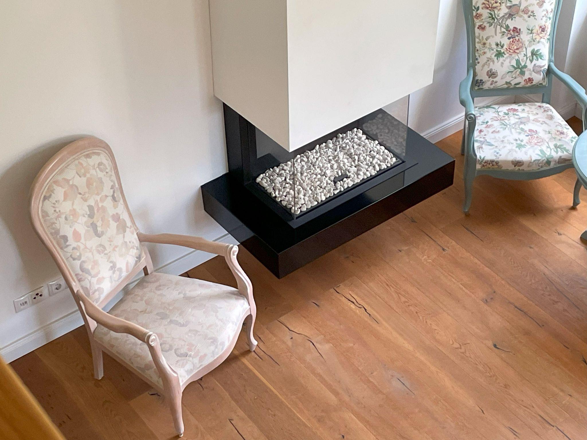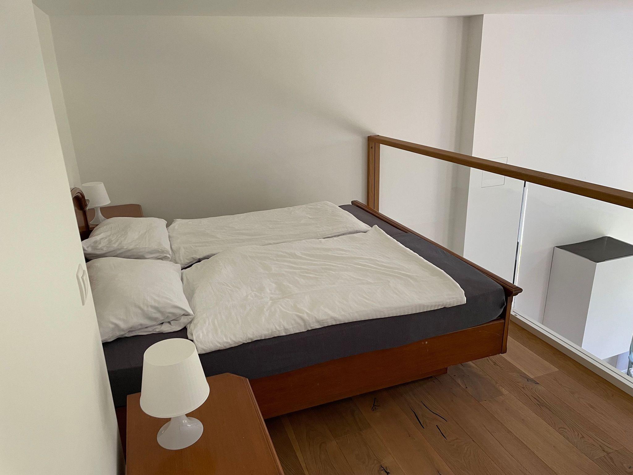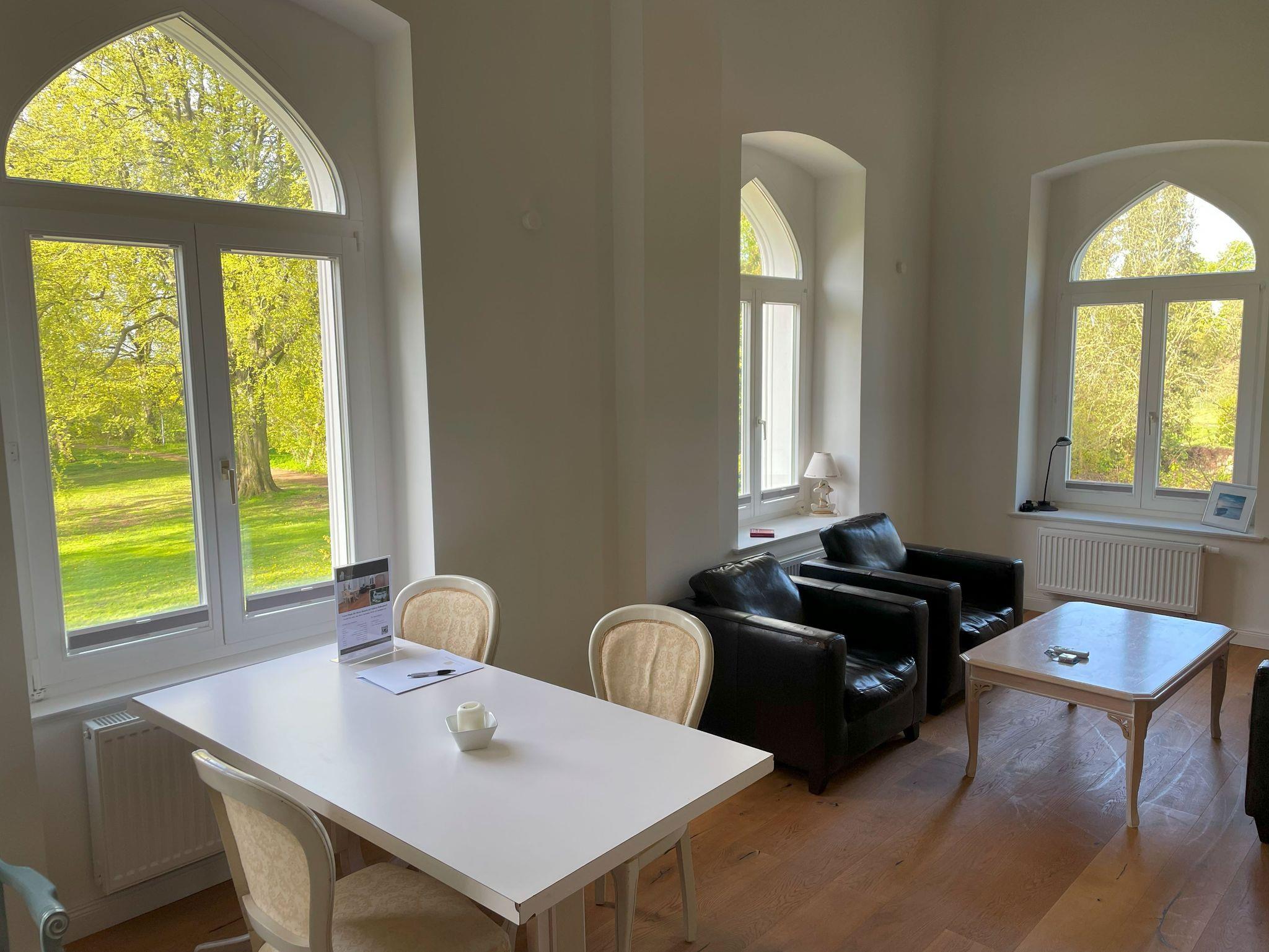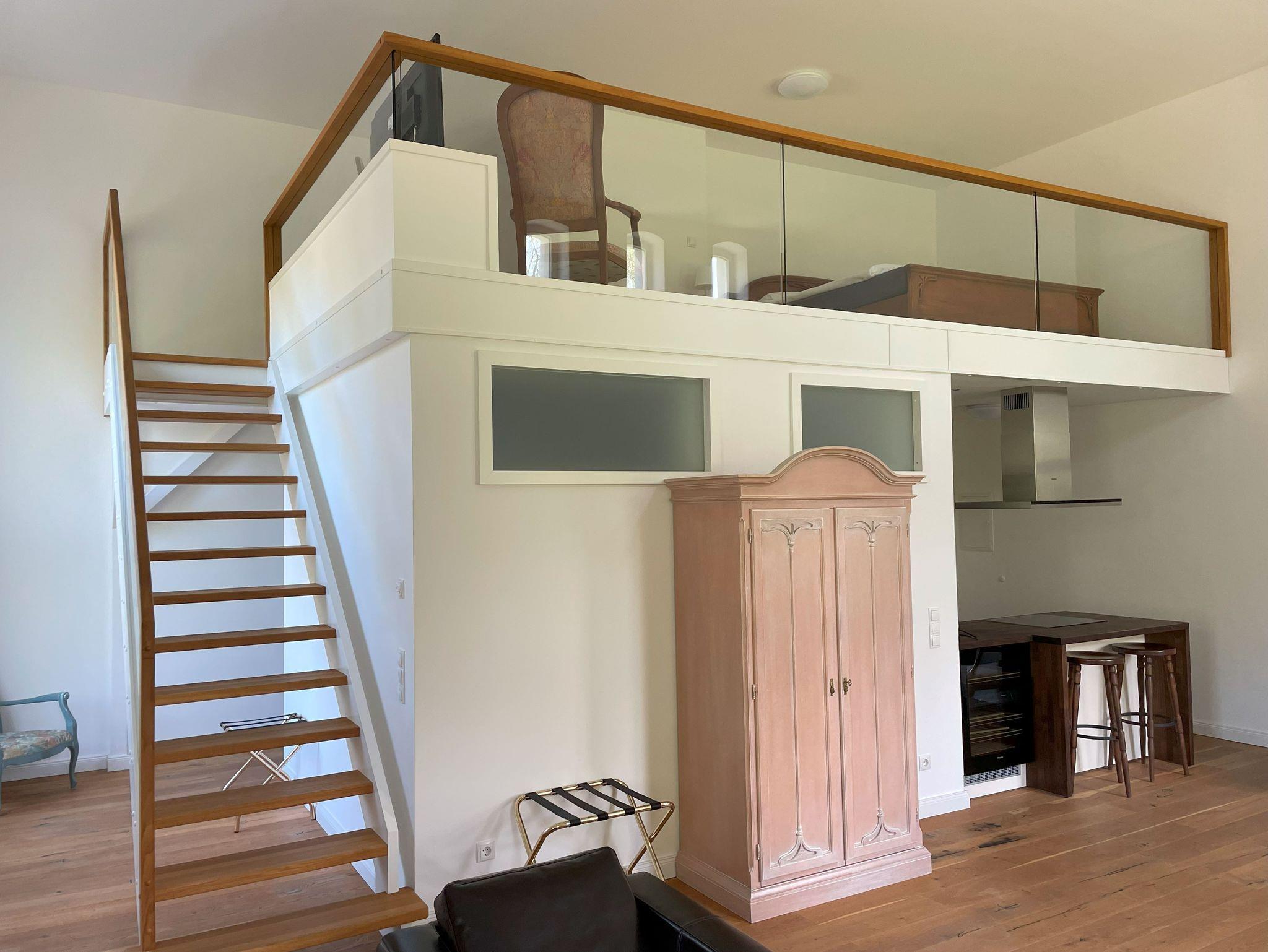 Das Galery-Apartment mit Blick in den Schlosspark Richtung Süden und Westen ist für 2 Gäste ausgelegt und kann bis 4 Gäste mit 2 Zustellbetten aufgebettet werden. Es befindet sich für gemütliche Stunden ein Kamin und in der offenen Küche ein Weinkühlschrank. Die Treppe zum Doppelbett (1,80 m Breite) auf der Galery ist normal breit und auch nicht steil. Das Badezimmer ist geräumig mit ebenerdiger Dusche.