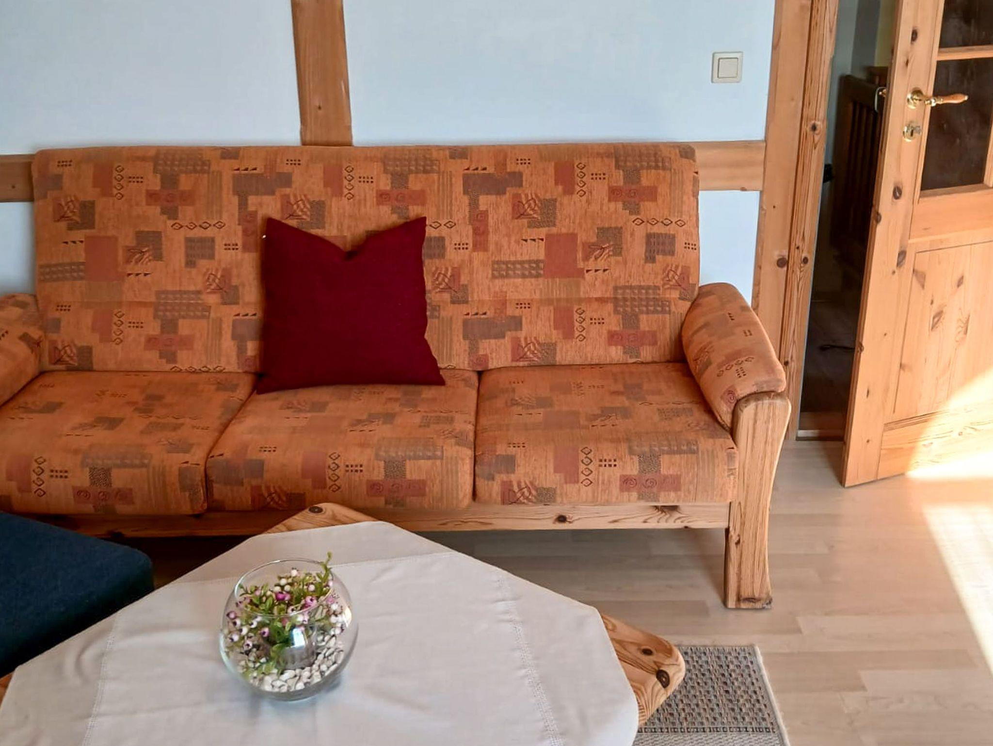 Die 40m² große Ferienwohnung befindet sich im Obergeschoss des alten Bauernhauses. Sie verfügt über einen separaten Eingang im Erdgeschoss und ist über eine schmale Treppe erreichbar.