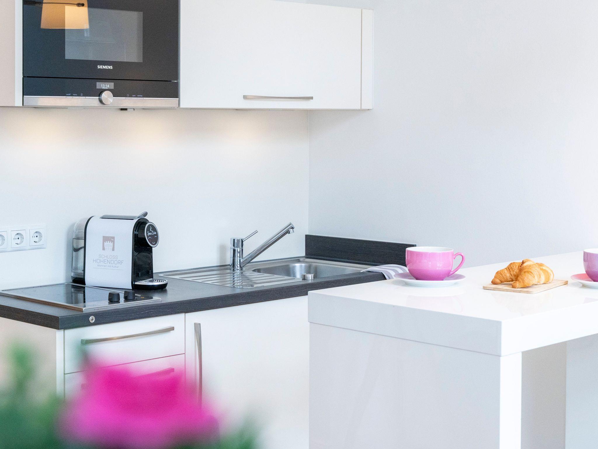 Alle Wohnungen sind ausgestattet mit einer modernen Küchenzeile, einem Kühlschrank und einer Backofen-/Mikrowellen-Kombination. In Anlehnung an das Gesamtkonzept der Kontraste ist das klassische Schloss innen hochmodern eingerichtet. So gibt es auch für Feriengäste sowohl modern, als auch klassisch ausgestattete Apartments.