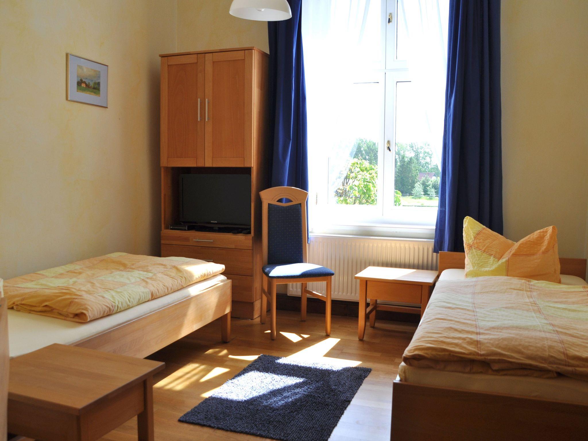 Als preiswerte Alternative eignet sich bestens unser Gästezimmer mit zwei Einzelbetten, Bad mit Dusche und Föhn, Sat-TV, aber ohne Kochmöglichkeit und ohne Esstisch. Gesamt-Wohnfläche: 18 m².