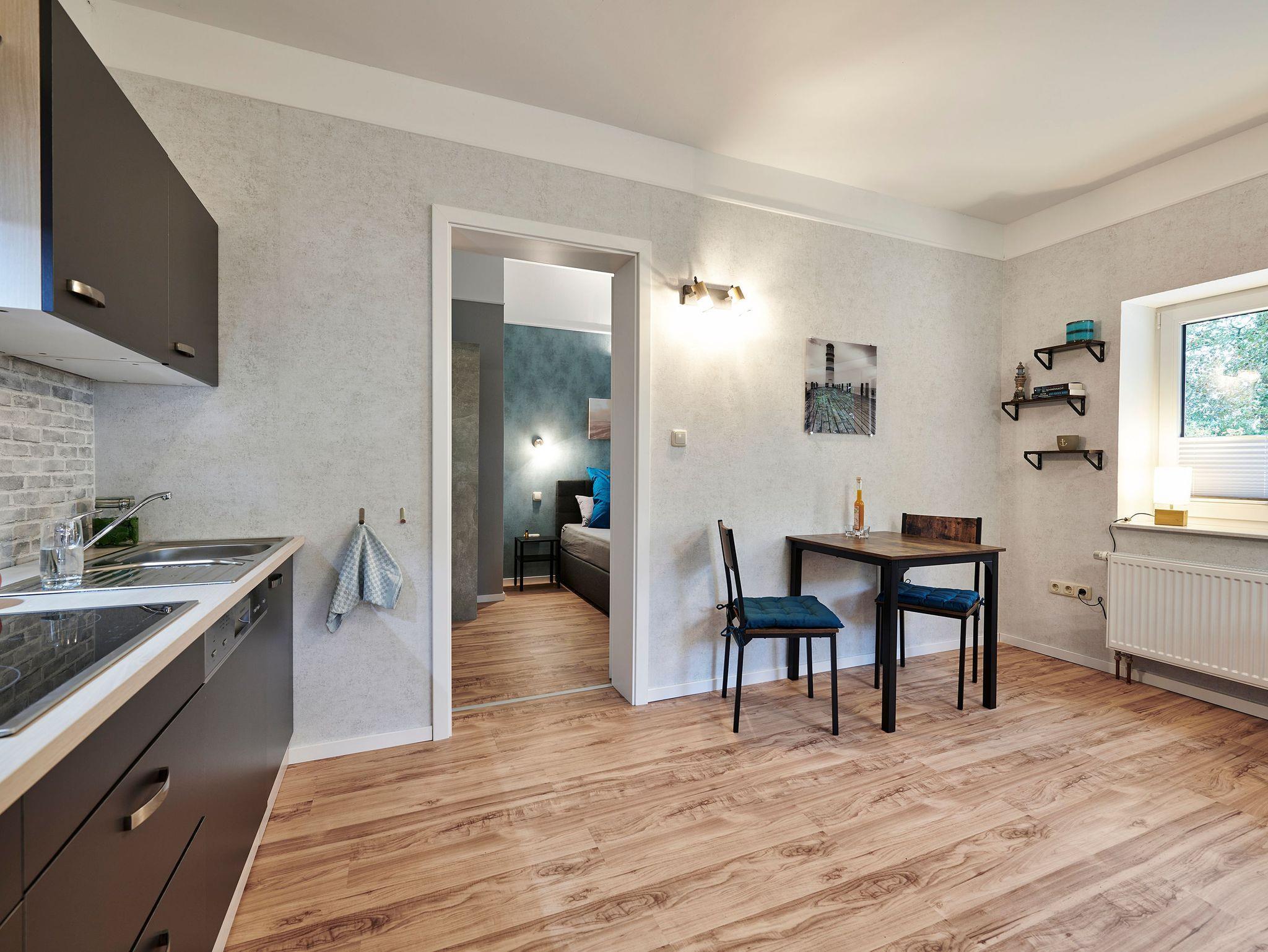 Ferienwohnung mit Wohn-Essbereich und integrierter Küche, Schlafzimmer, Bad mit Dusche - Aussen-Terrasse.