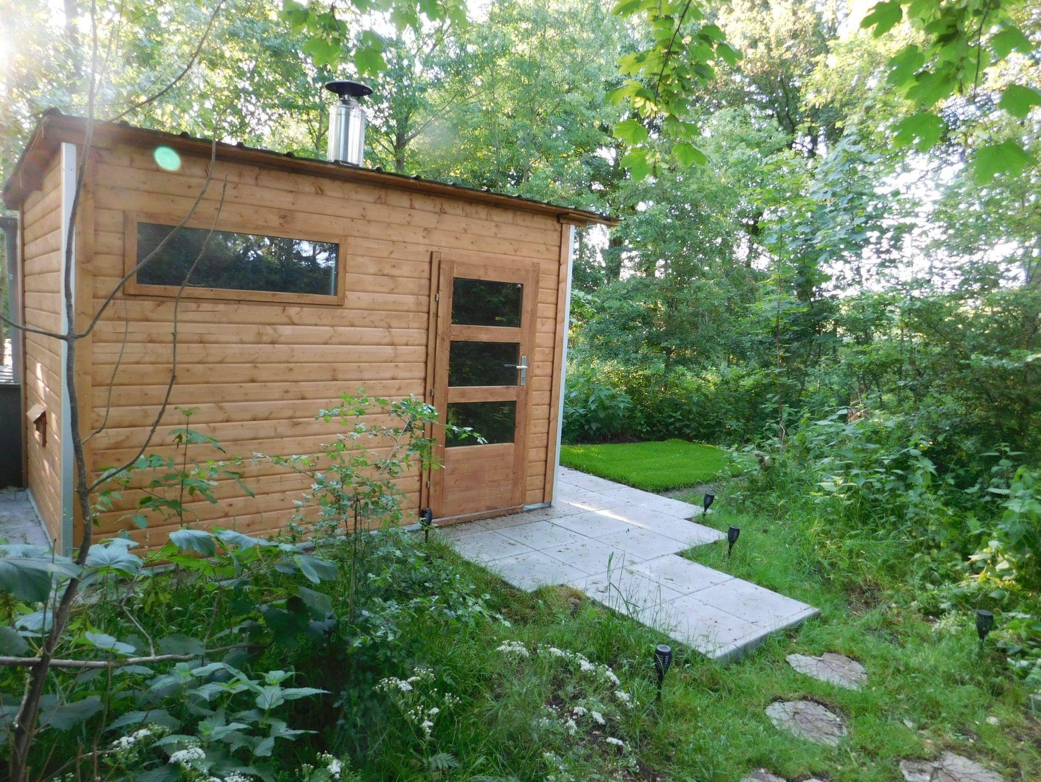 Im Gartenhaus ist eine holzbetriebene Sauna vorhanden.