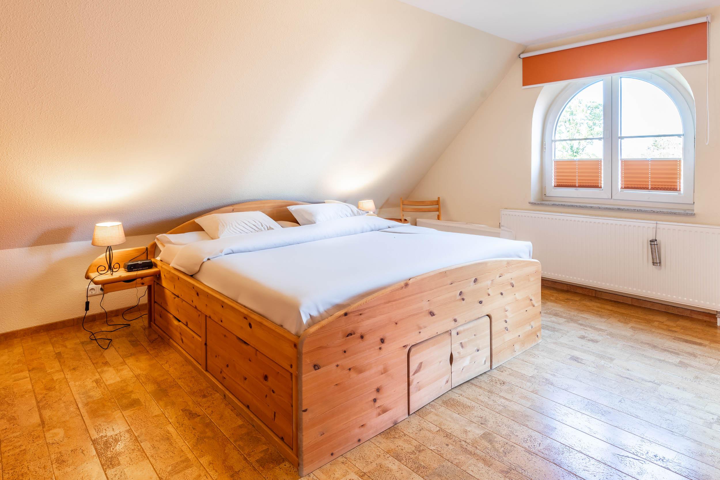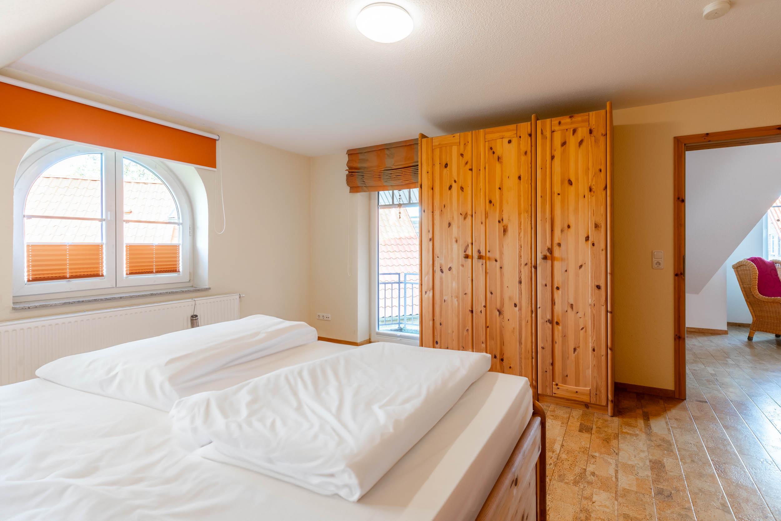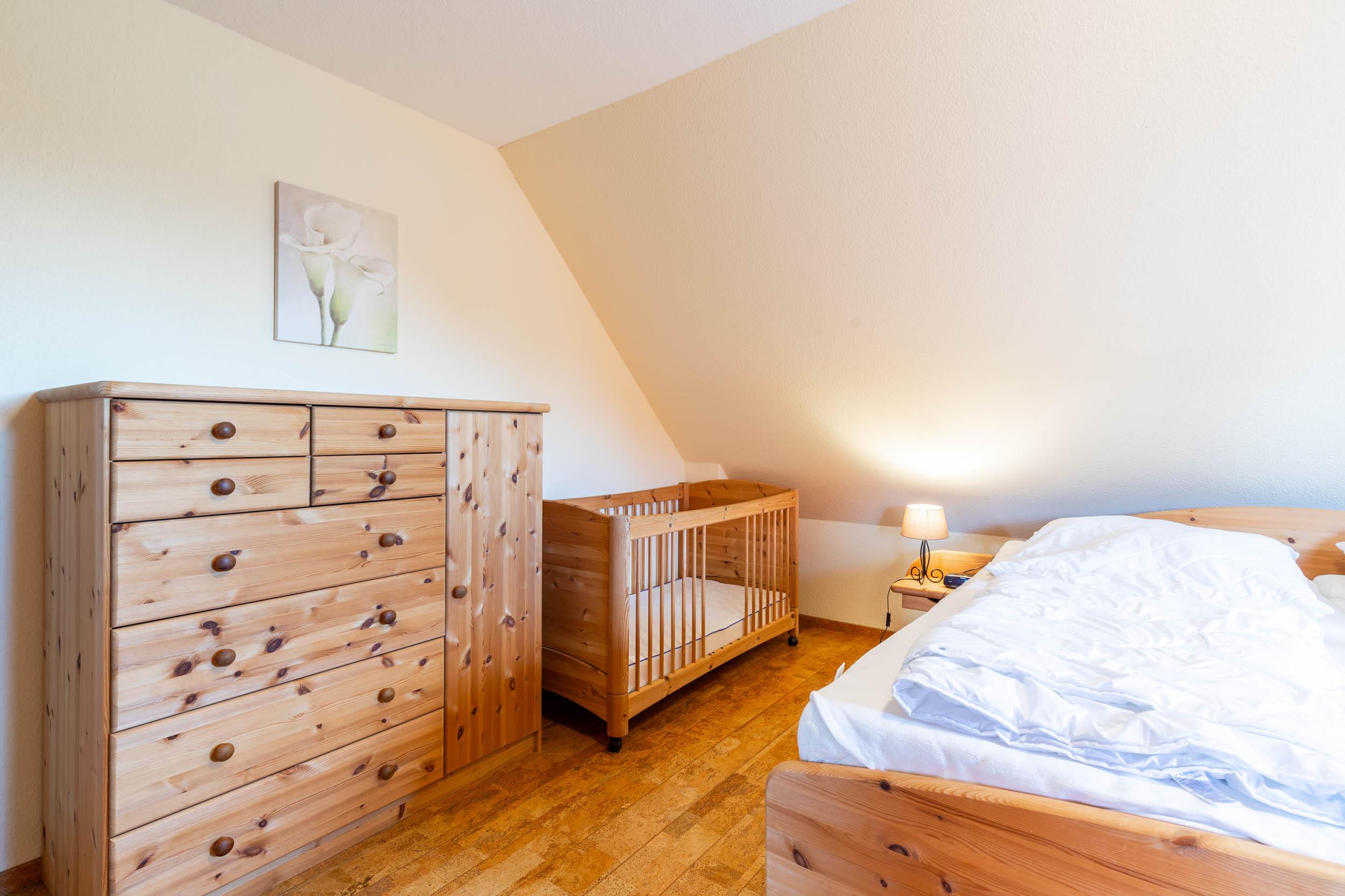 Weiterhin finden Sie auf der oberen Etage zwei separate Schlafräume. Das große Schlafzimmer ist mit einem Doppelbett, einem festen Holzgitterbett, einer Kommode sowie einem Kleiderschrank ausgestattet. Im Gäste-/ Kinderzimmer befinden sich zwei Einzelbetten, ein Kleiderschrank, ein eigenes TV-Gerät und ein DVD-Player.