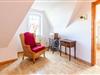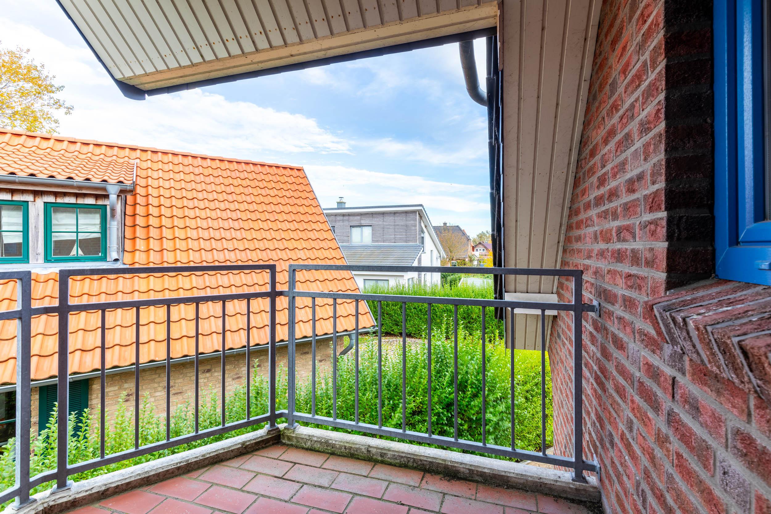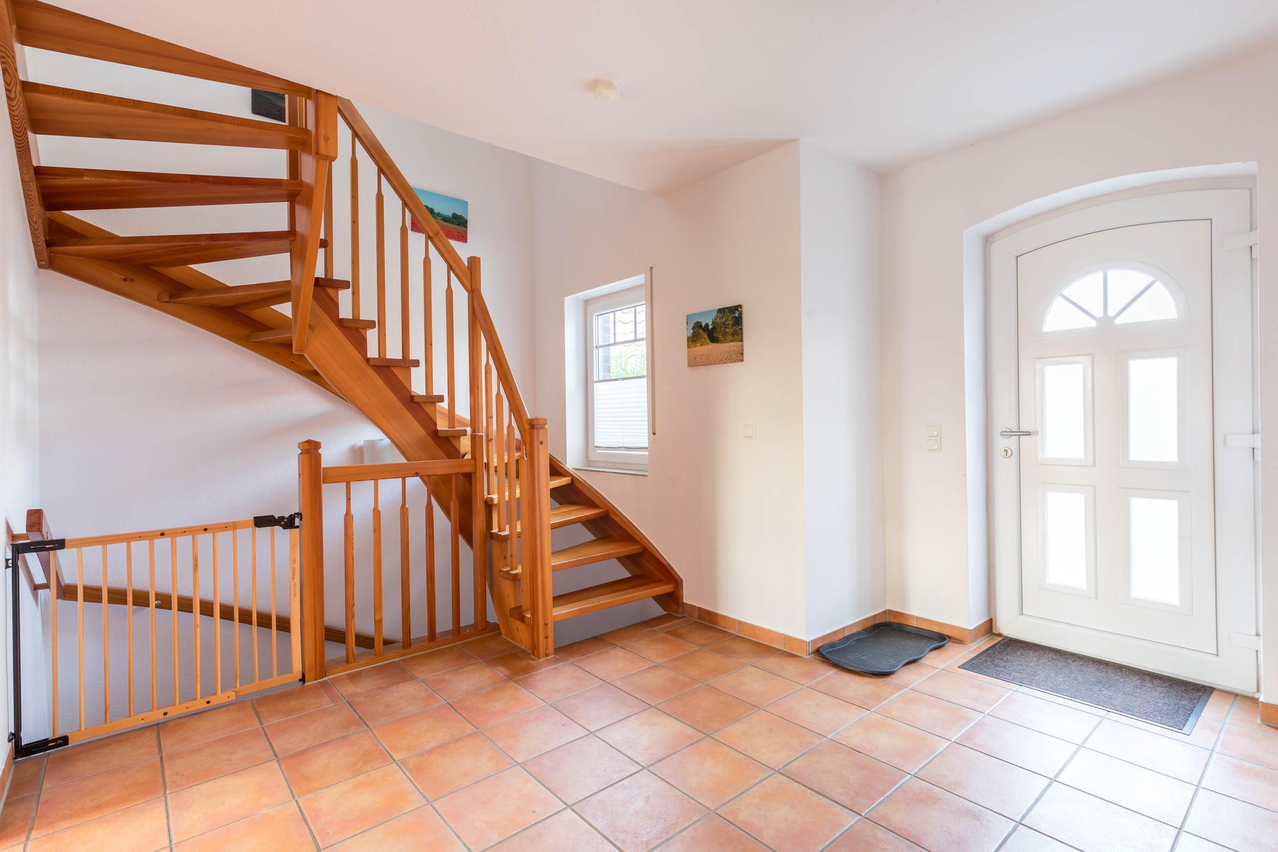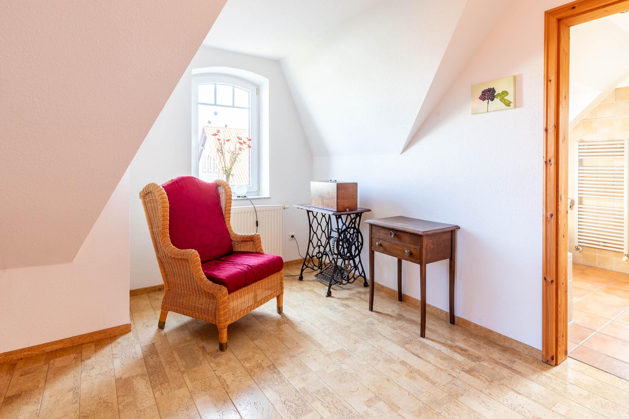Von hier aus führt eine Holztreppe ins 1. Obergeschoss, wo sich im Friesengiebel ein schöner Sessel und eine kleine Kommode befinden - ein kleiner Rückzugsort, wenn man etwas Entspannung und Ruhe sucht. Am oberen Ende der Treppe ist ein Treppenschutzgitter befestigt.