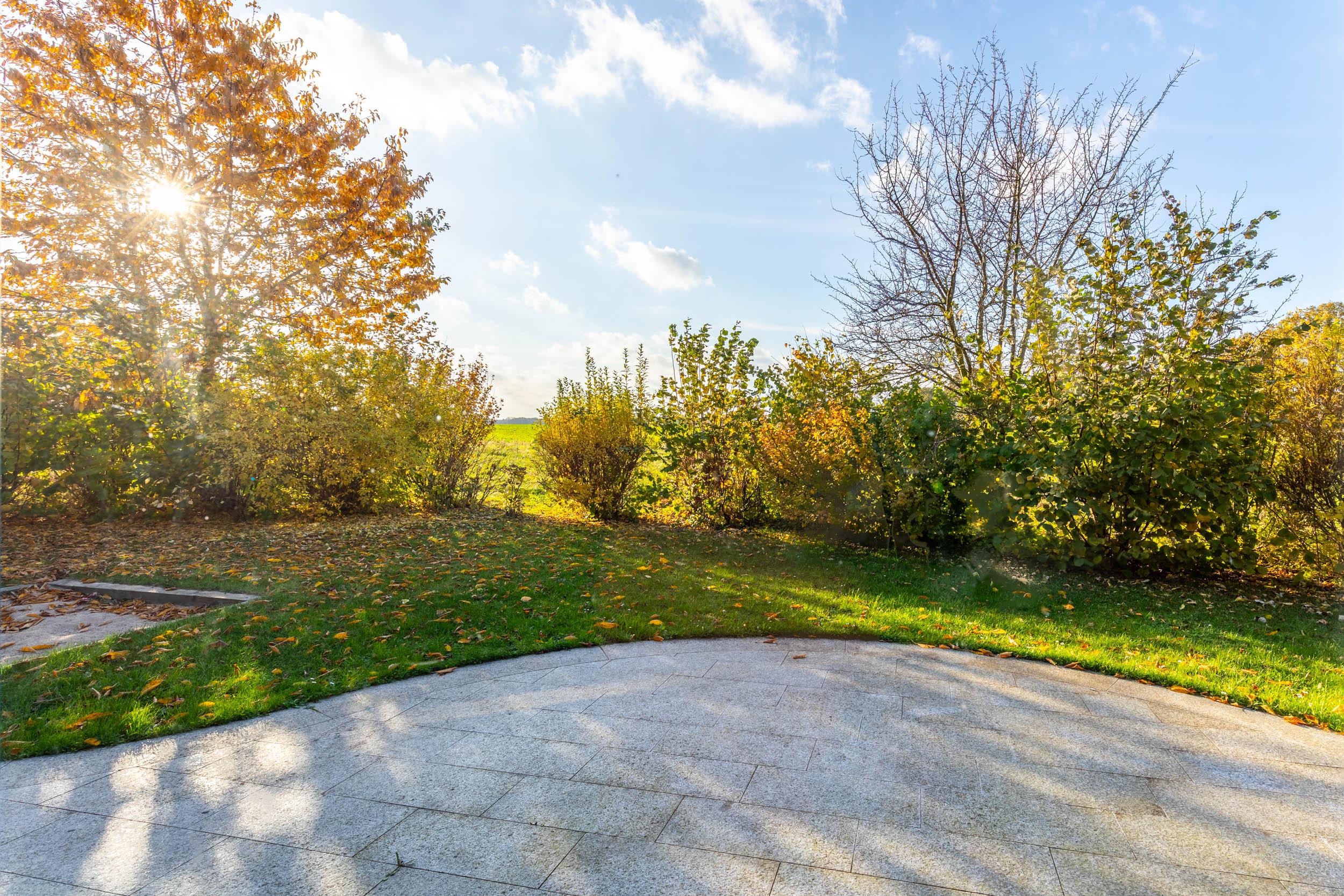 Die schöne möblierte West-Terrasse, die Sie vom Wohnzimmer aus erreichen, bietet einen tollen Blick auf die Felder. Der Garten wartet mit einer Rasenfläche, einer 4 m² großen Sandkiste mit Sandspielzeug für die Kinder und einem Trampolin auf.