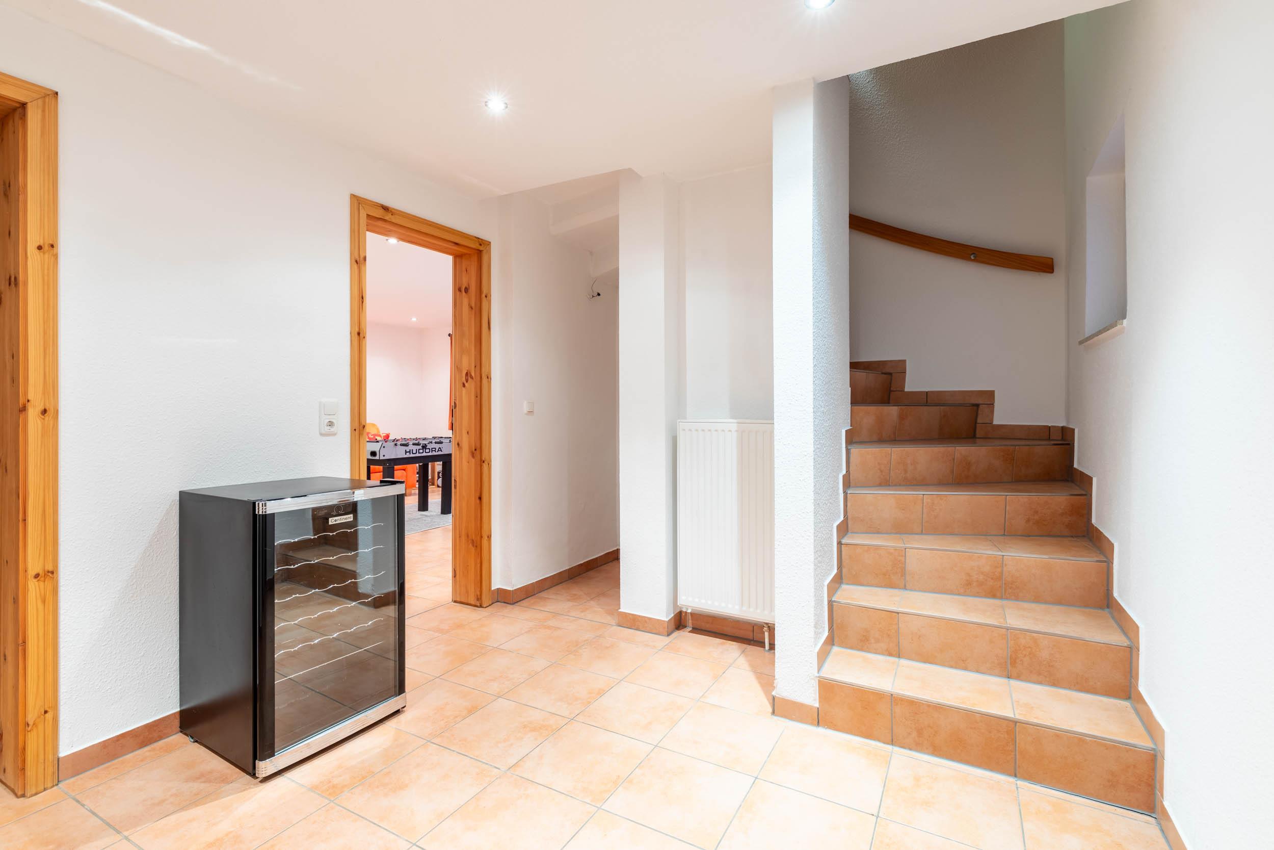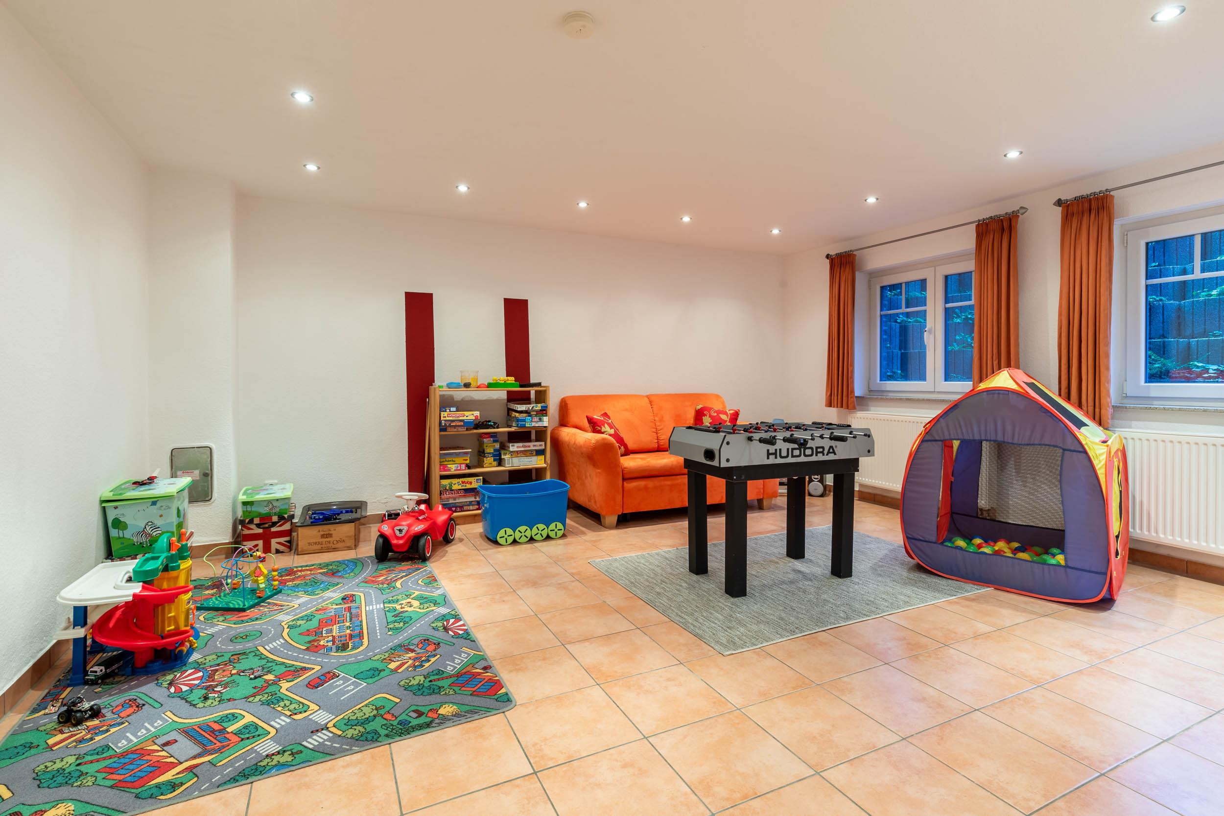 In diesem schmucken Feriendomizil kann auch das Kellergeschoss genutzt werden: Hier erwartet Sie u.a. ein 23 m² großes Spielzimmer, das mit 2 normalen Fenstern mit Rollläden versehen ist. Für den Spielspaß sorgen ein Tischkicker, zwei Matratzen zum ausgiebigen Toben sowie ein Ballhaus.