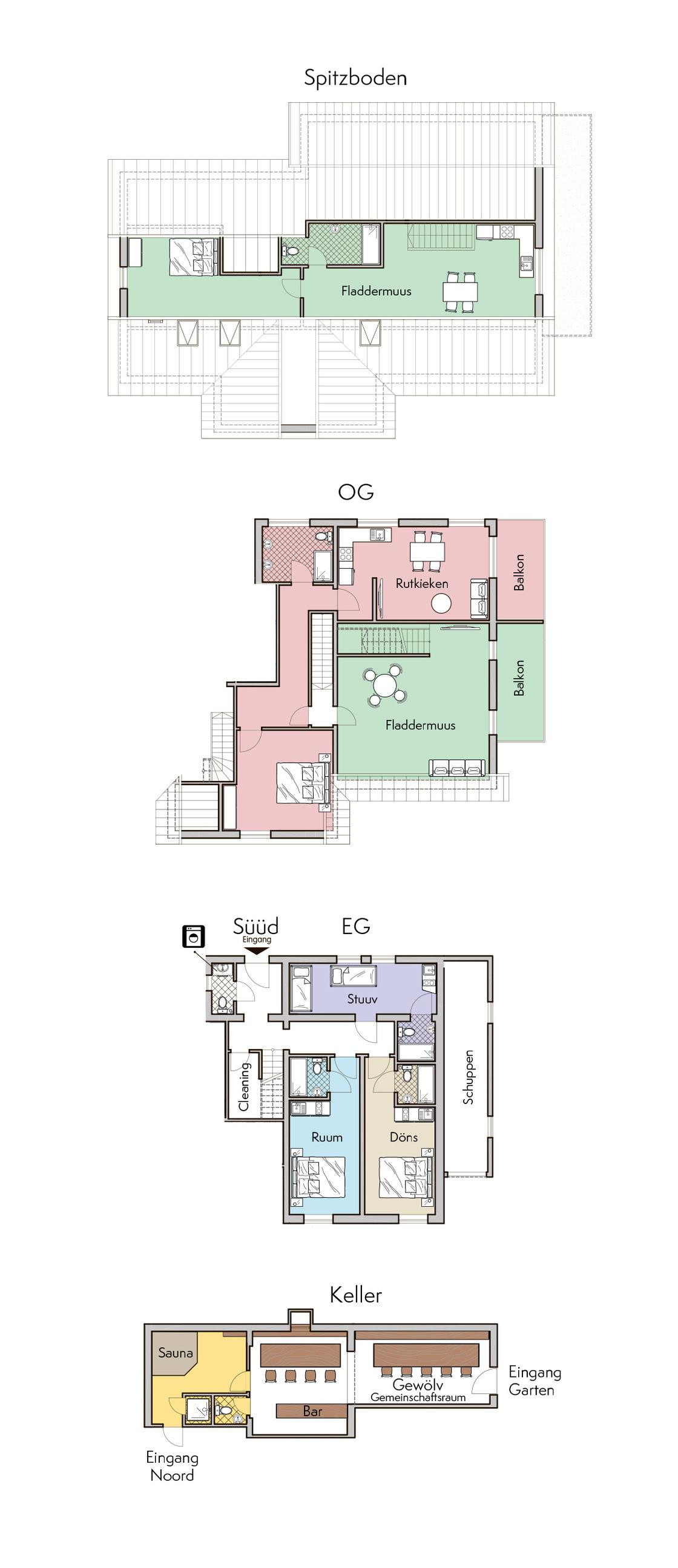 Die Ferienhaushälfte "Süüd" umfasst fünf separate Apartments, die jeweils 1-4 Gäste beherbergen können. So hat jeder seinen Rückzugsort und alle können sich gemeinsam in den zwei großen Apartments oder dem Gemeinschaftsraum treffen. Ein separates WC mit Wäschetrockner rundet die Komplettausstattung ab.