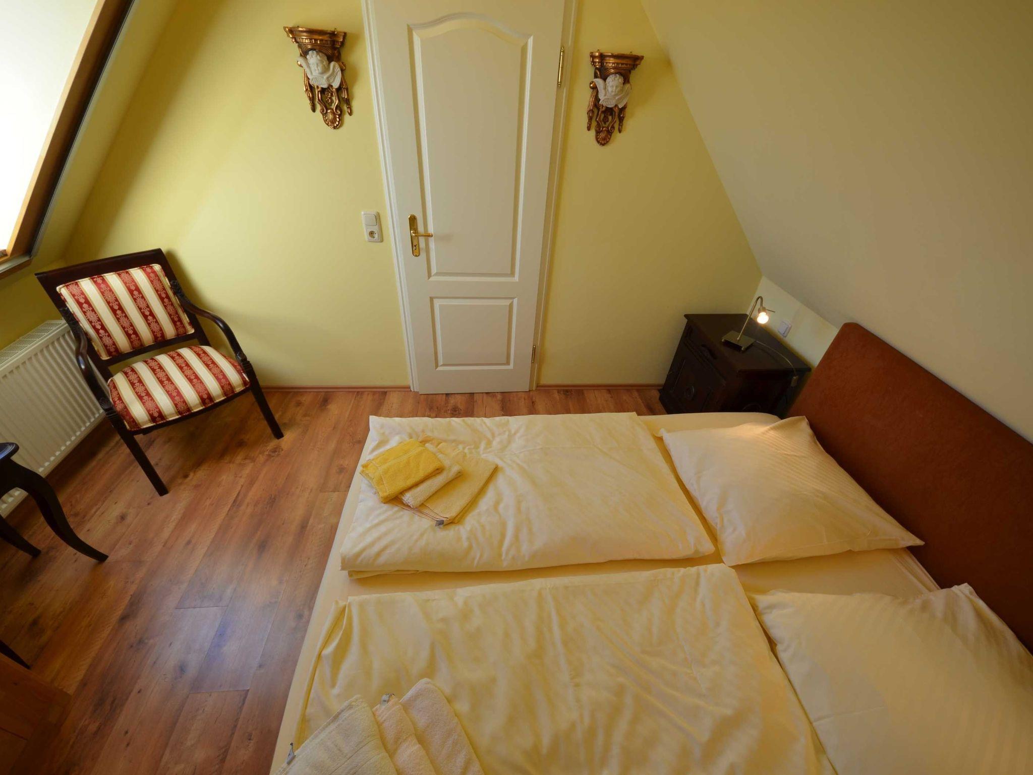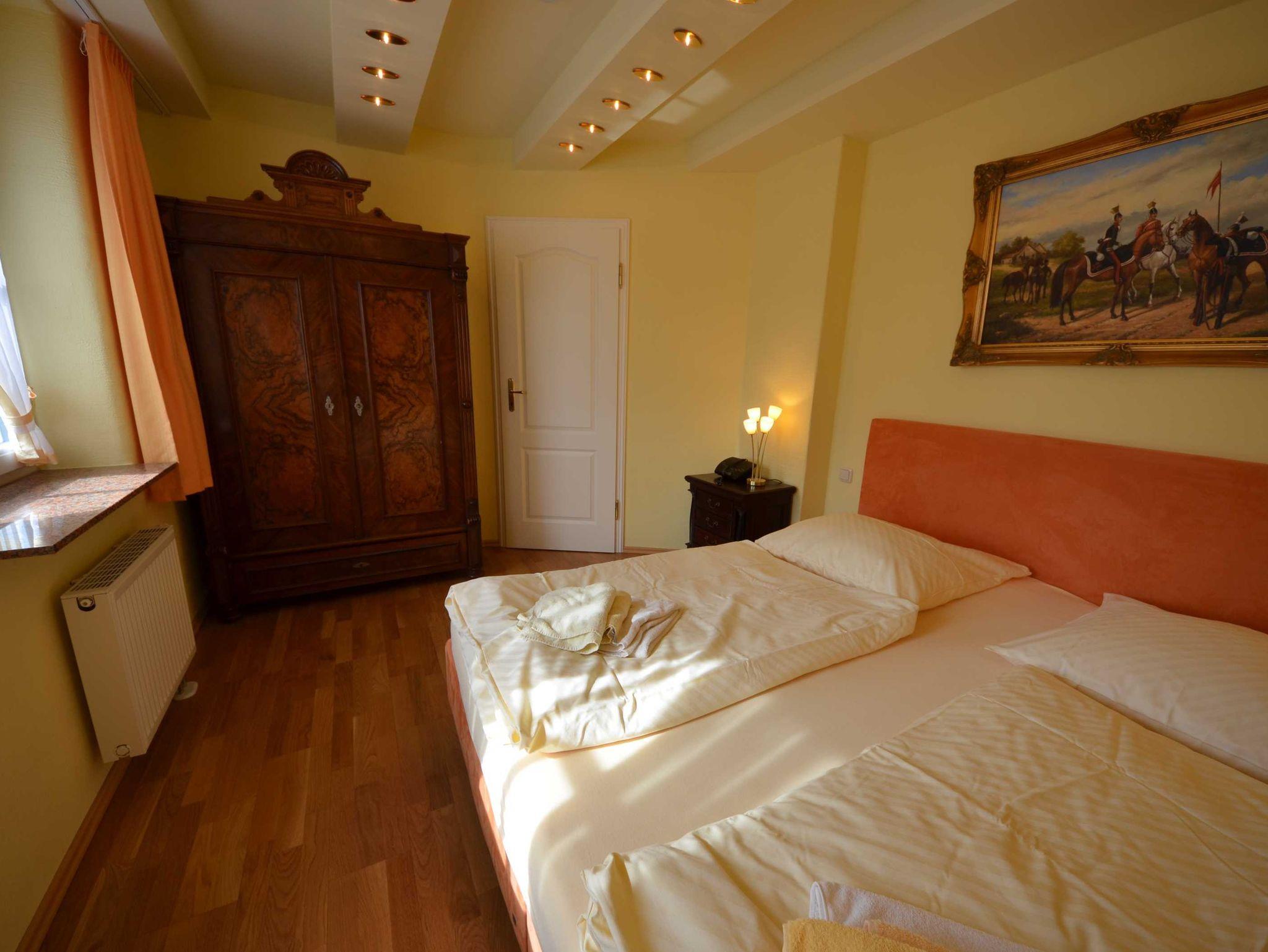 Ein Schlafzimmer mit 1,80 x 2,00 m Bett und zwei Schlafzimmer mit jeweils 1,60 x 2,00 m Bett, Radiowecker, Wände mit Bildern dekoriert, antiker Gründerzeit-Wäsche-/Kleiderschrank, elektrische Rollladen, Fenster mit Mückenschutz. Nach Voranmeldung: ein Babyreisebett (kostenlos) mit Bettwäsche.