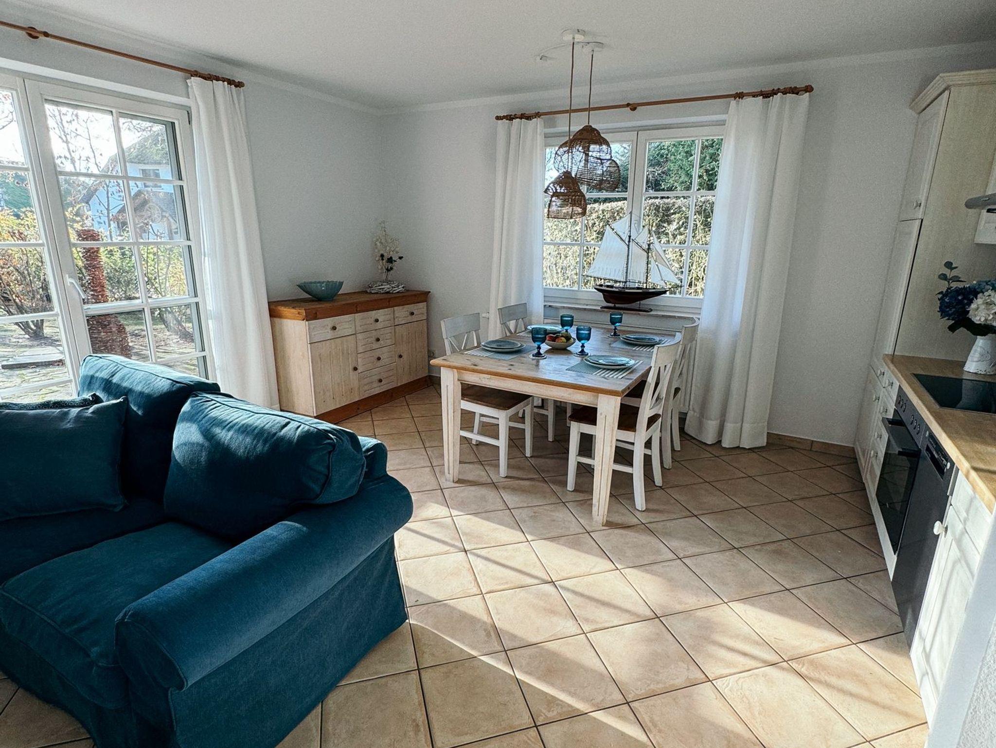 Der große, offene Wohn- Essbereich bietet einen gemütlichen und entspannten Aufenthalt für die ganze Familie. Von hier aus gelangen Sie auf die große Sonnenterrasse ( Süd-West-Ausrichtung ) mit einem wundervollen Blick in den parkartig angelegten Garten. Die Küche ist mit Geschirrspüler, Backofen und Ceranfeld ausgestattet. Ein großer Esstisch bietet Platz für bis zu 6 Personen. Ein SMART-TV , ein Bluetooth Lautsprecher und eine Senseo Kaffeepadmaschine gehören zur Ausstattung. Da das Grillen mit Holzkohle wegen der Brandgefahr nicht gestattet ist, sorgt ein Elektrogrill dennoch für gemütliche Grillabende auf der sonnigen Terrasse.