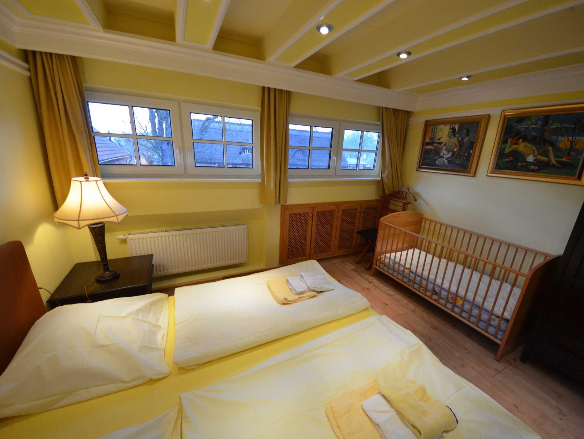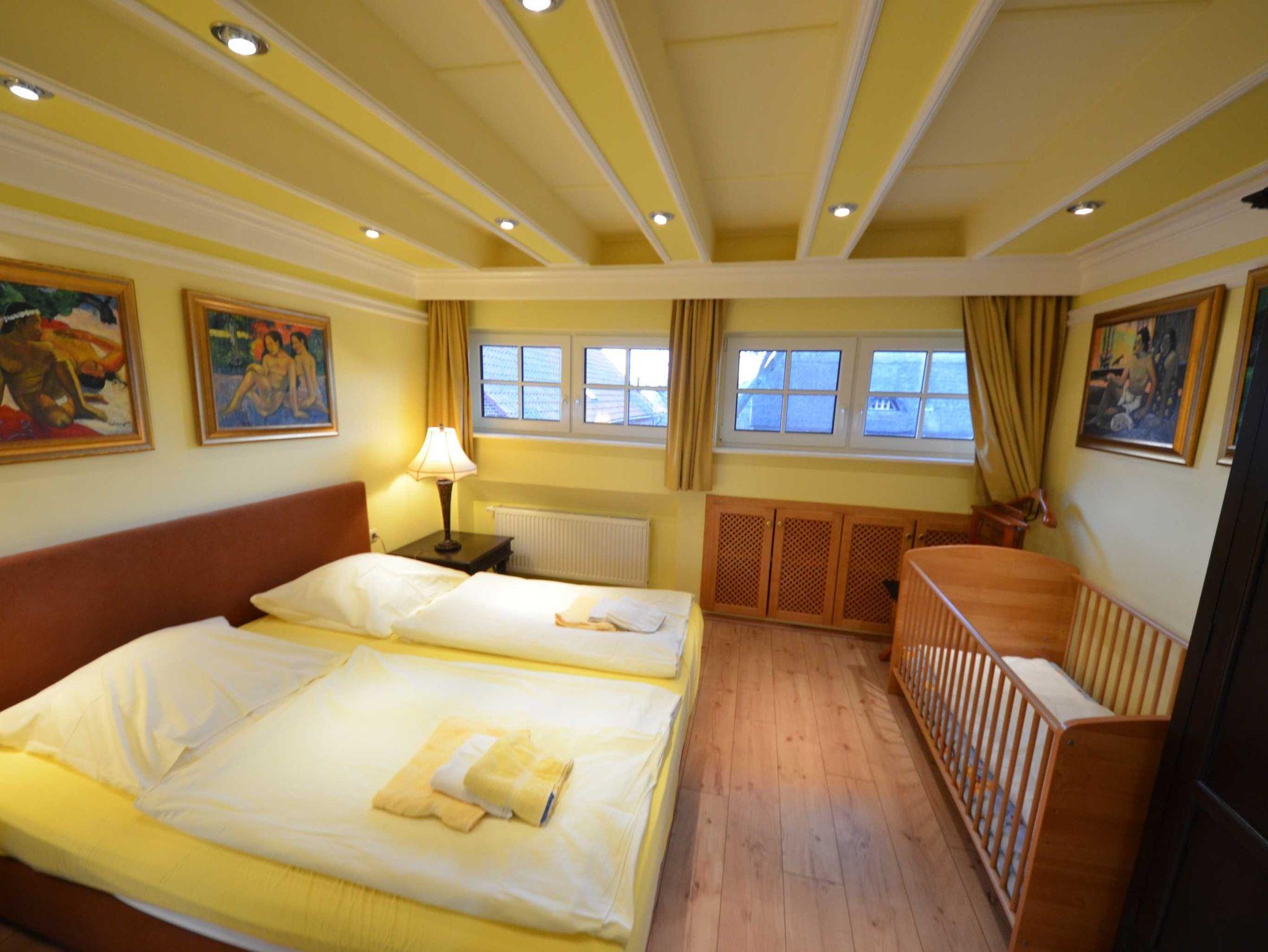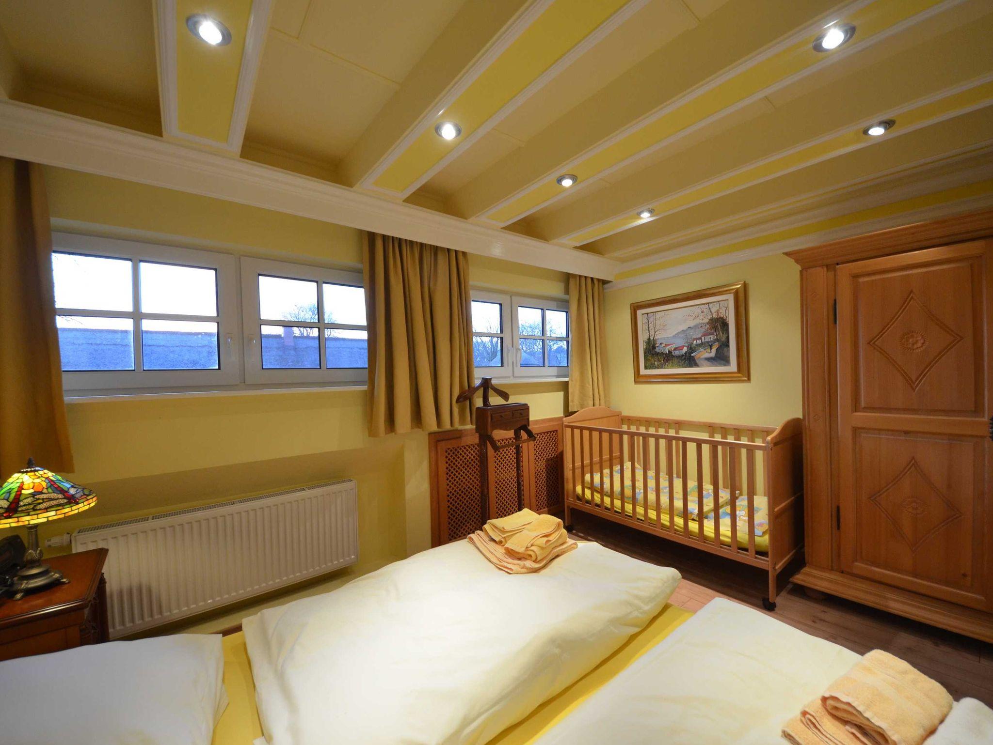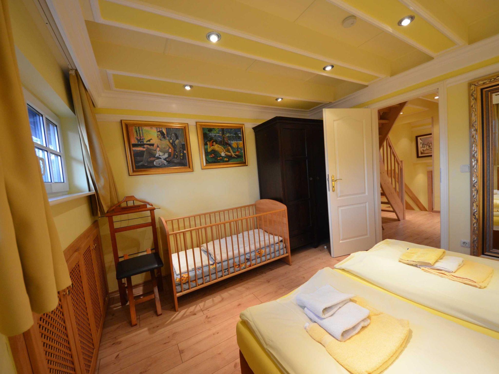 Schlafzimmer ein Babybett 70 x 140 (kostenlos) mit aufgezogener Bettwäsche.