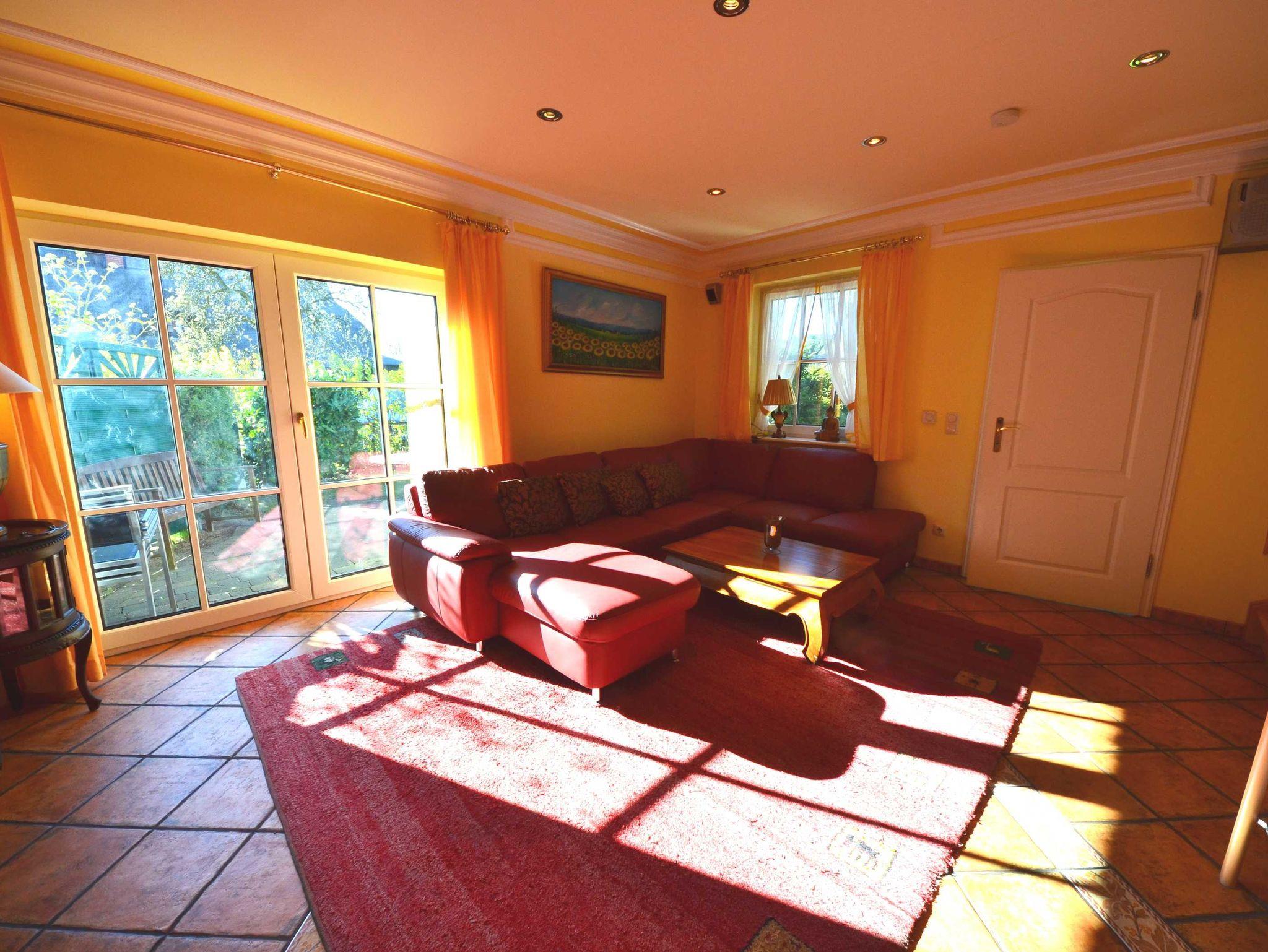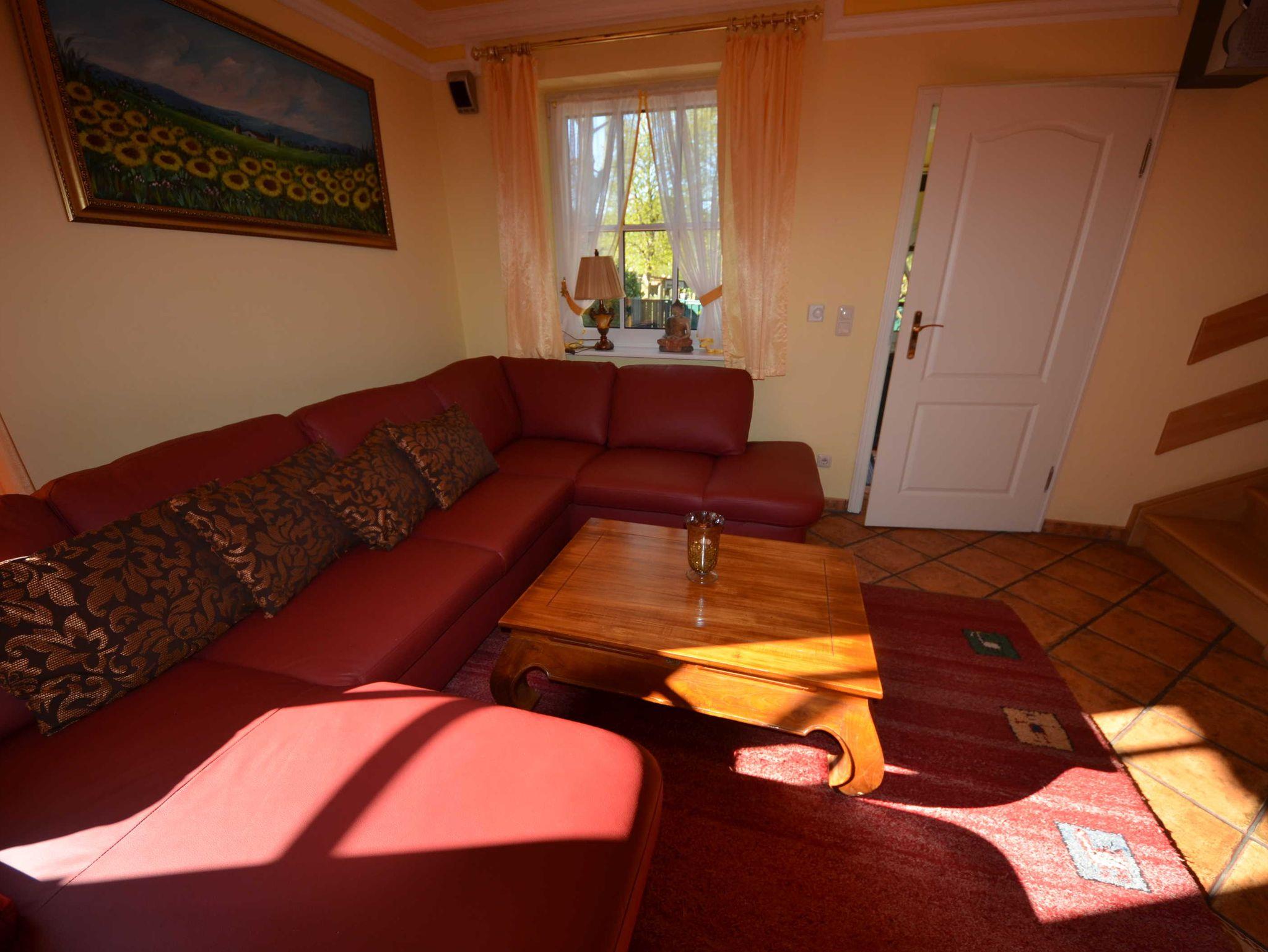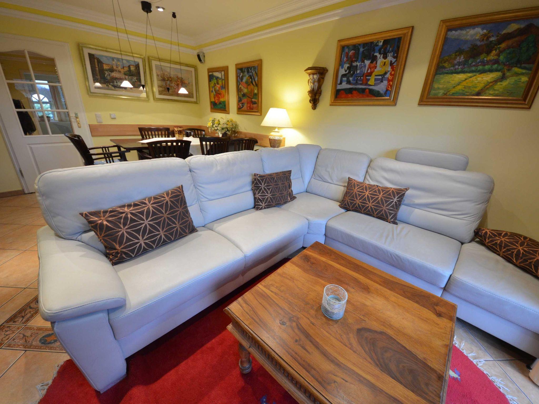 2 Bäder, Fußbodenheizung, schön eingerichtetes Wohn- Esszimmer, Couchgarnitur mit Leder bezogen, Opiumtisch, Speisetafel mit Stühlen, Geschirrschrank, Sat - TV, Telefon, Spiegel pp.