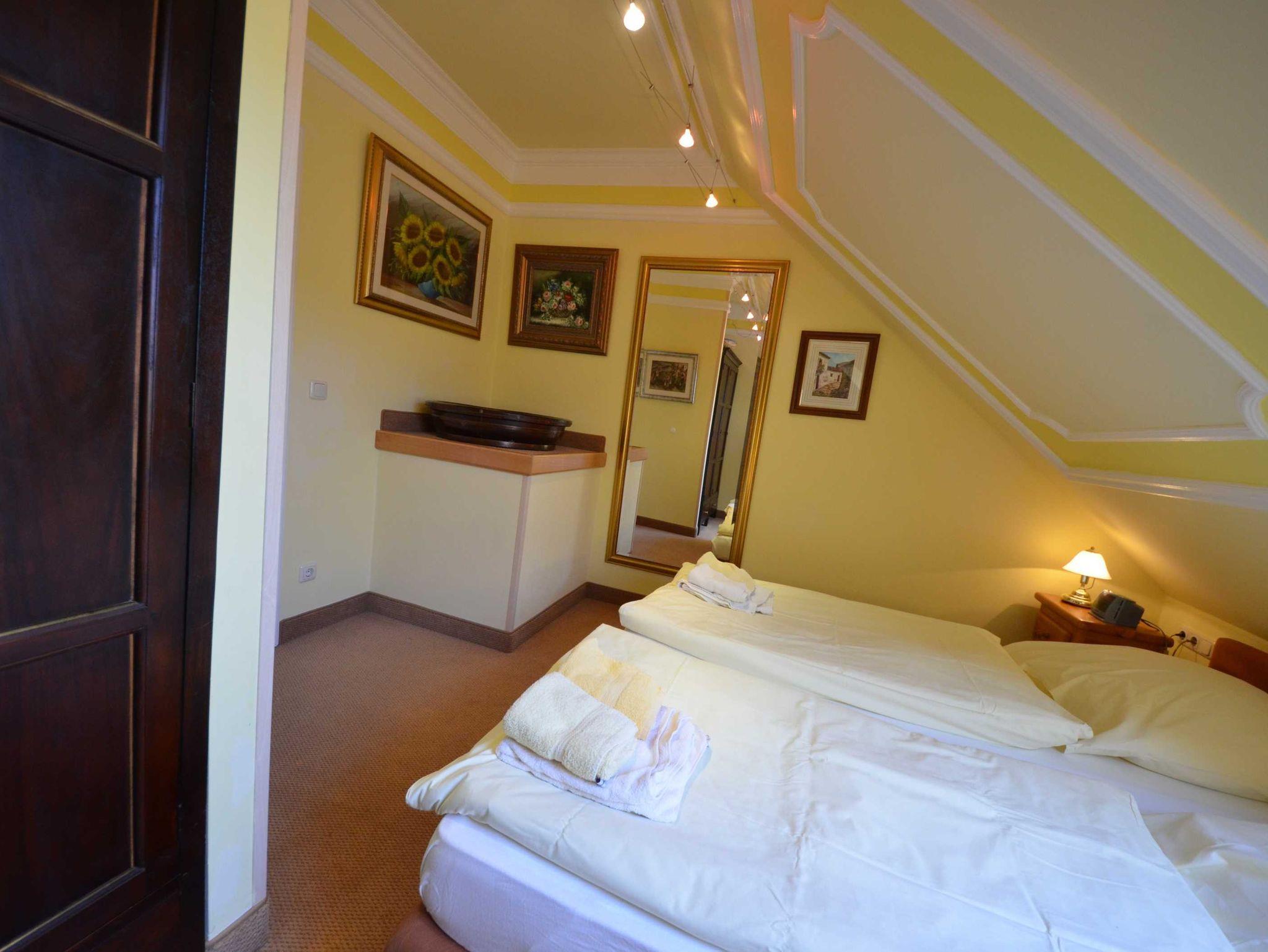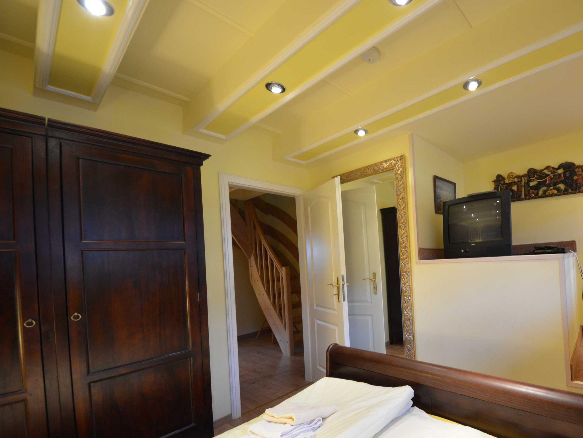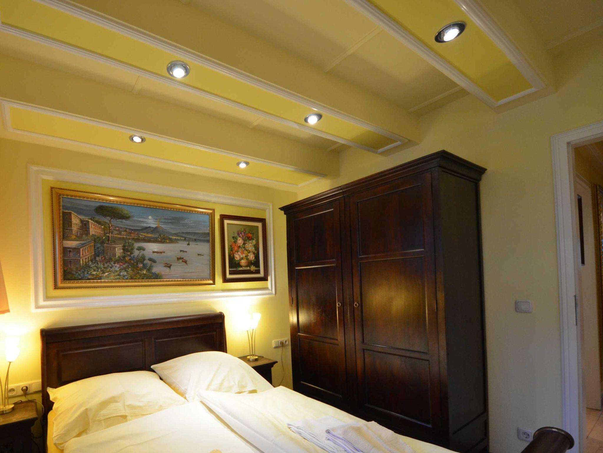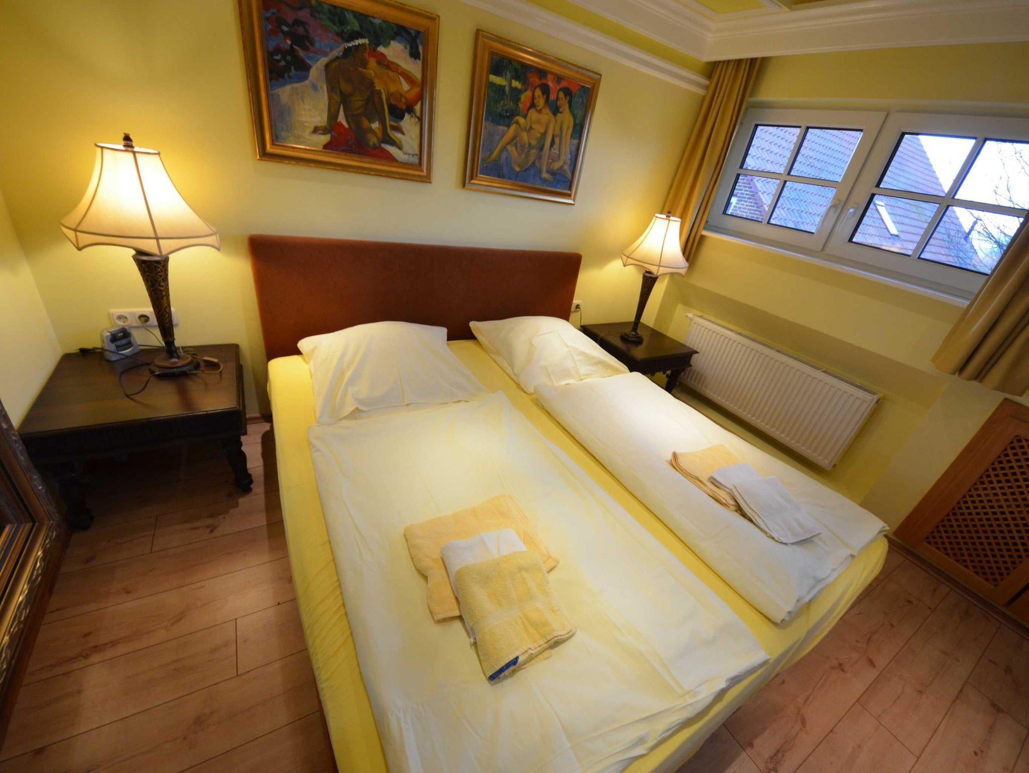 Doppelbetten jeweils 160 x 200 und 180 x 200, mit aufgezogener Bettwäsche. Radiowecker, mit Bildern dekoriert. Große Ganzkörperspiegel. In einem Schlafzimmer gibt es einen 2.TV.