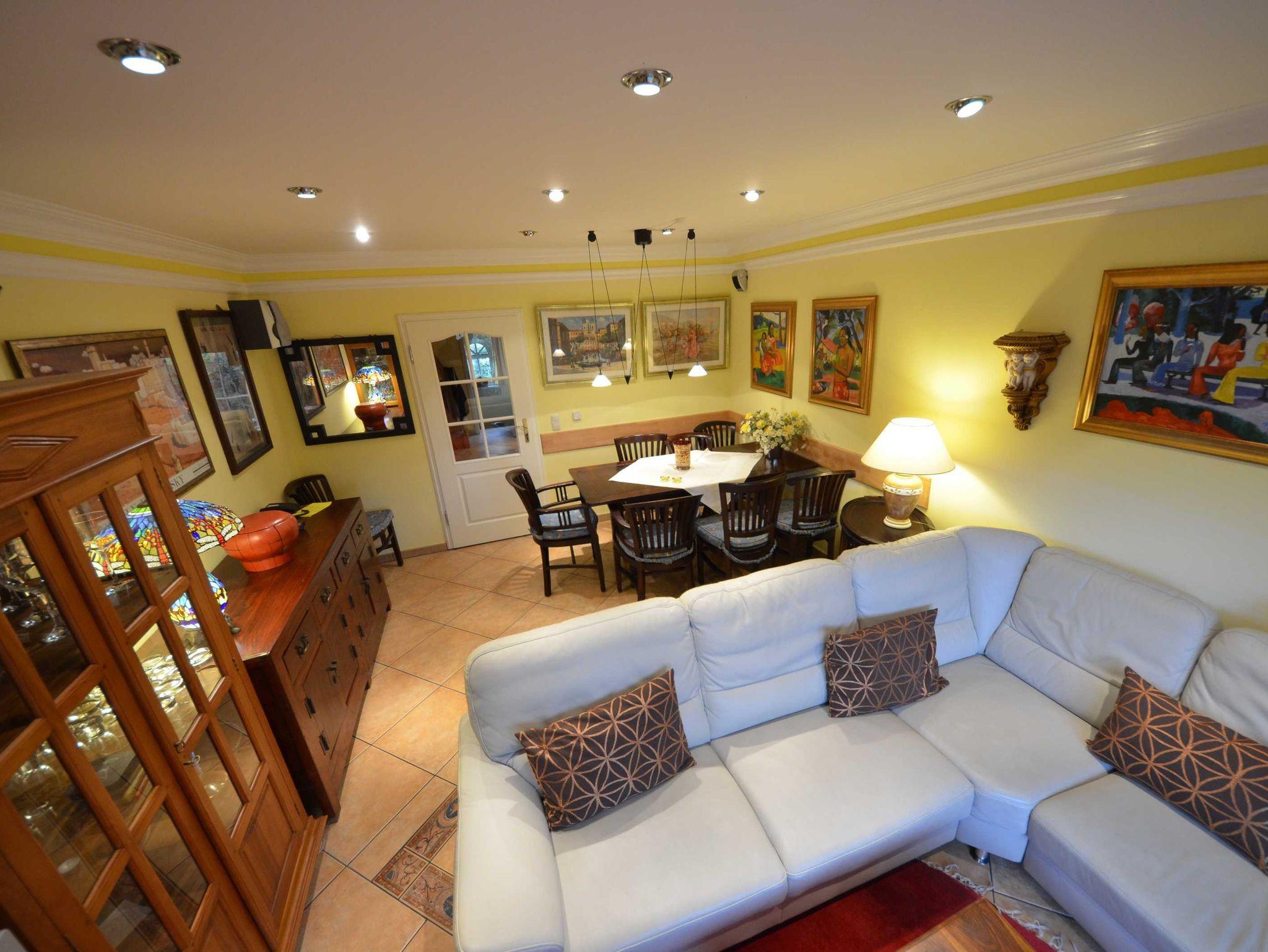 großzügiges Wohnzimmer mit Eßbereich, Geschirrschrank, Telefon, TV,Video, Stereo / CD, mit Bildern dekoriert