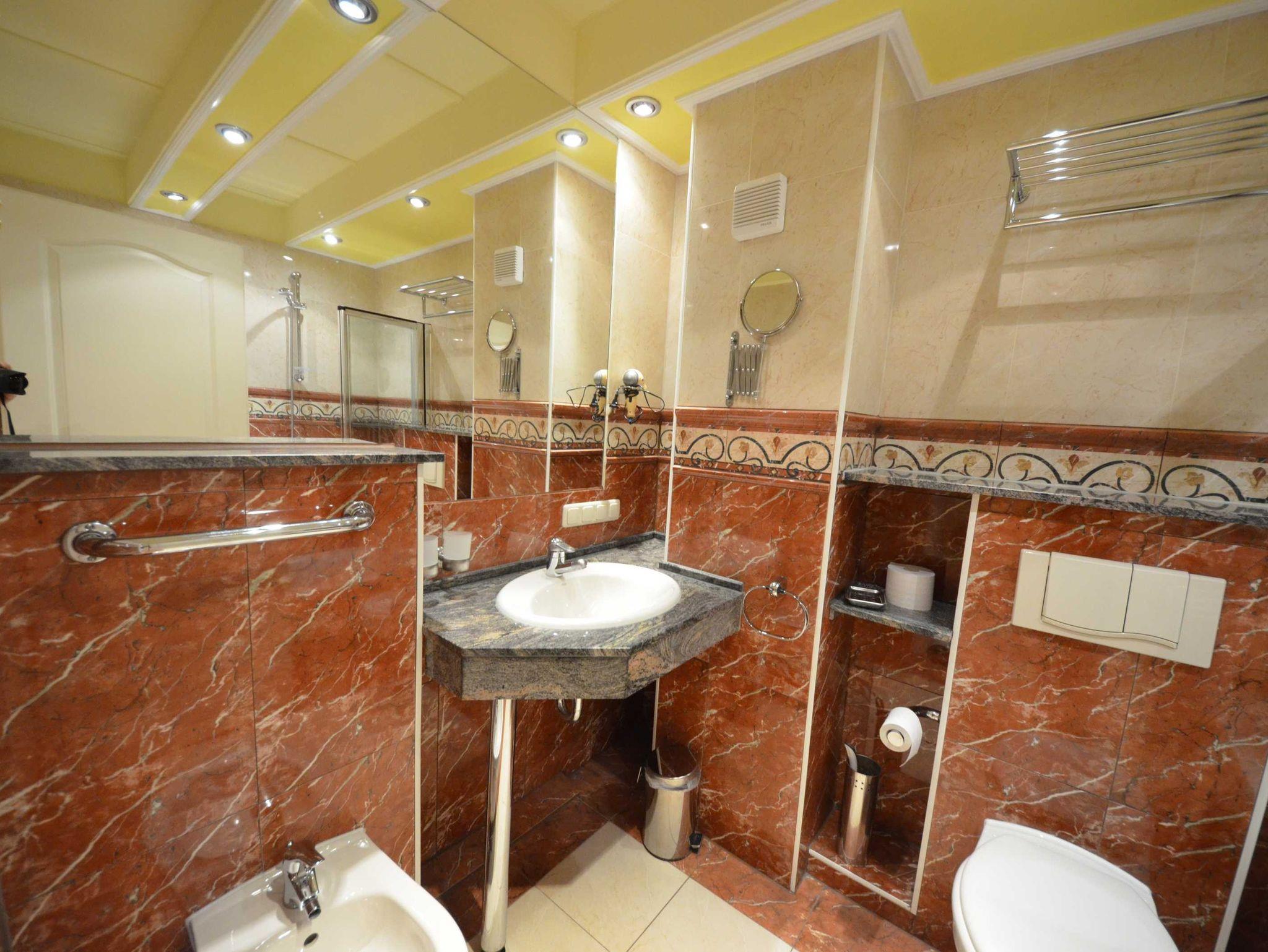 Bad mit Dusche aus Naturstein / Granit, große Spiegel, beheizbarer Handtuchhalter, Fön und Schminkspiegel