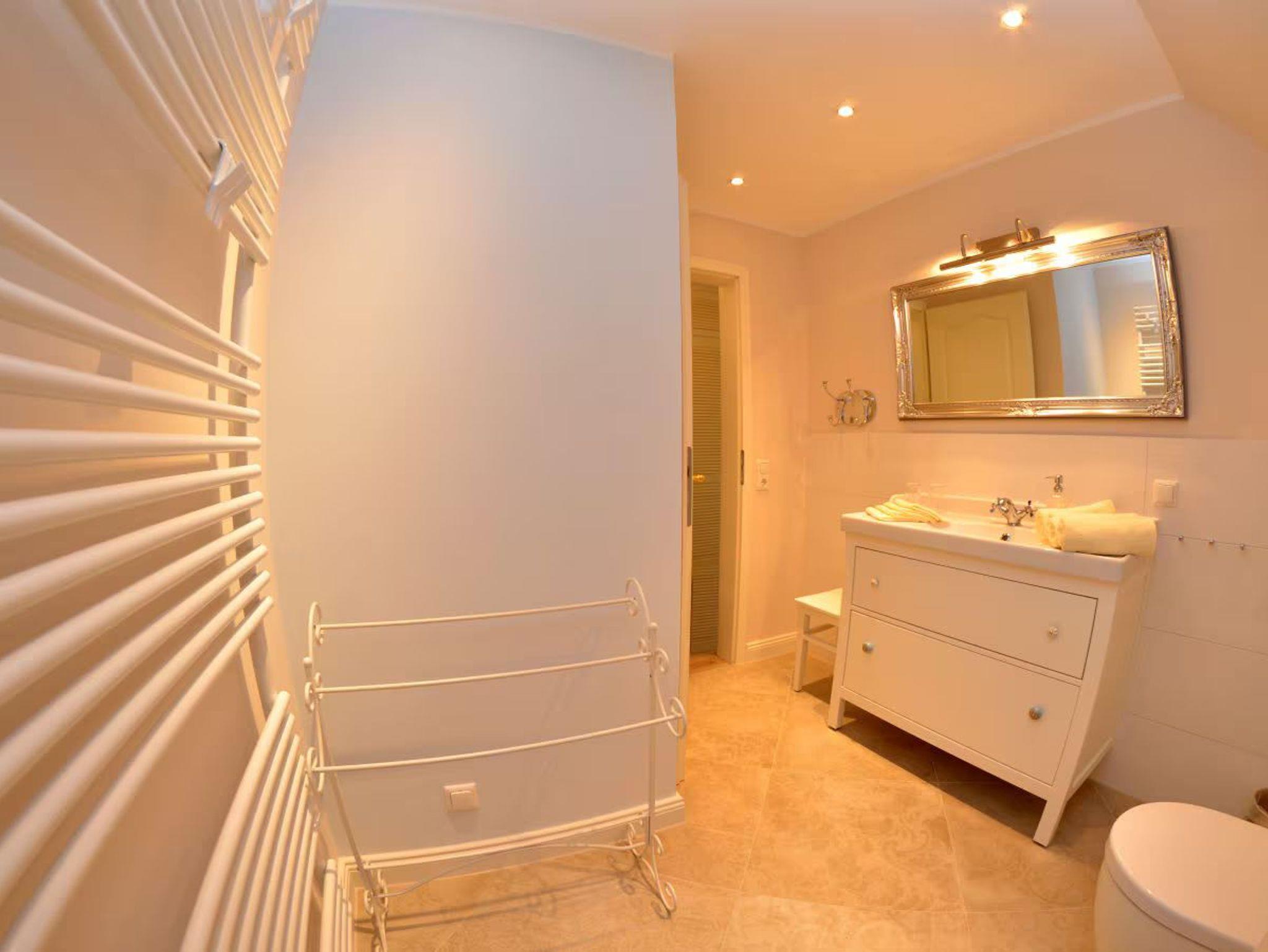 Flur mit Garderobe, Spiegel,Schuhablage.Einbauschrank mit Reinigungsuntersilien.Neues Bad mit ebenerdig begehbarer Dusche und Regenbrause,Waschbecken,WC, beheizbaren Handtuchhalter,großer Spiegel und ausreichende Ablagefläche und Stauraum,Haarfön.