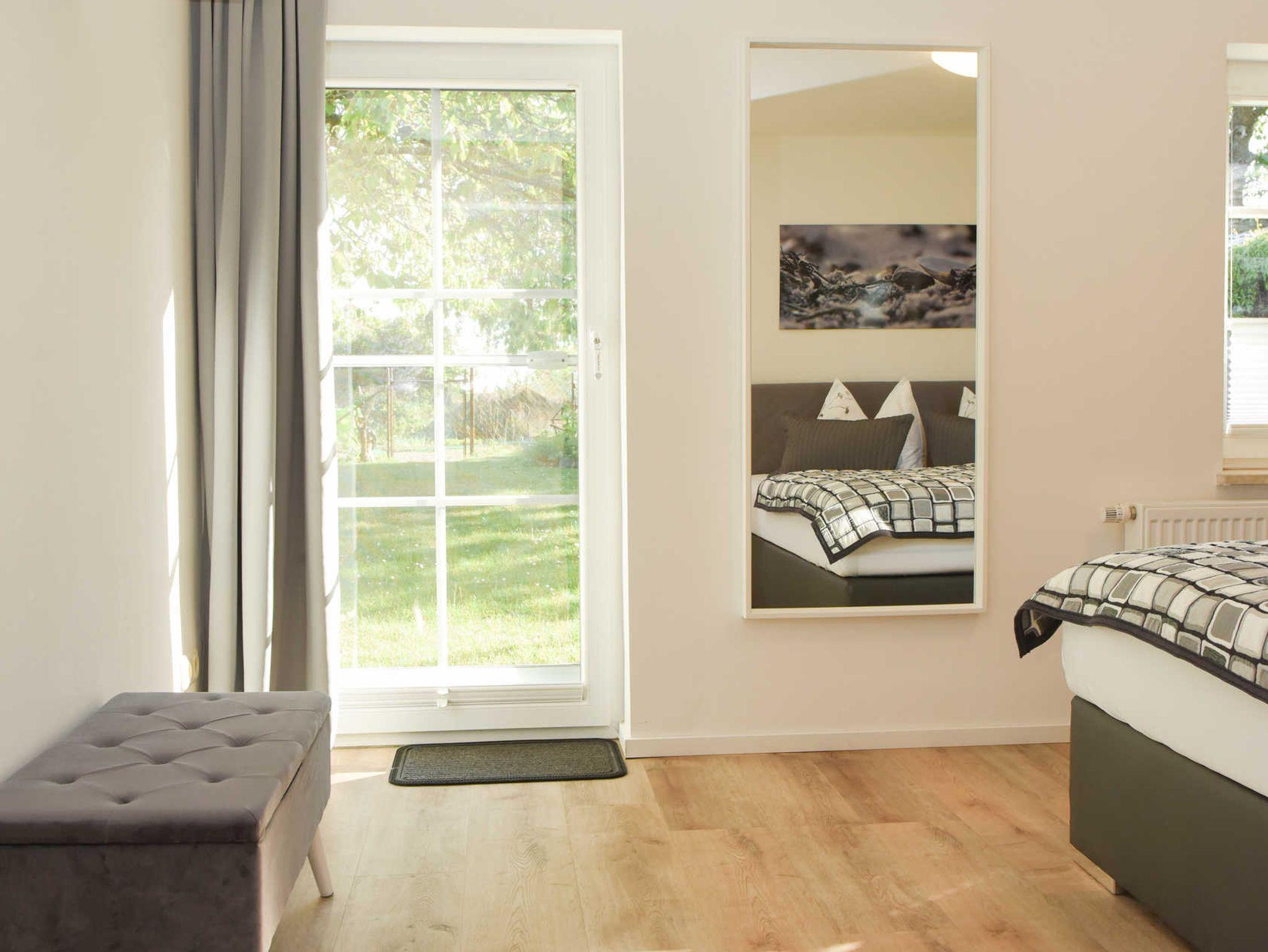 Boxspringbett (1,80m x 2,00m) mit durchgehendem Topper, Kleiderschrank, Zugang zum eigenen Sitzplatz im Garten
