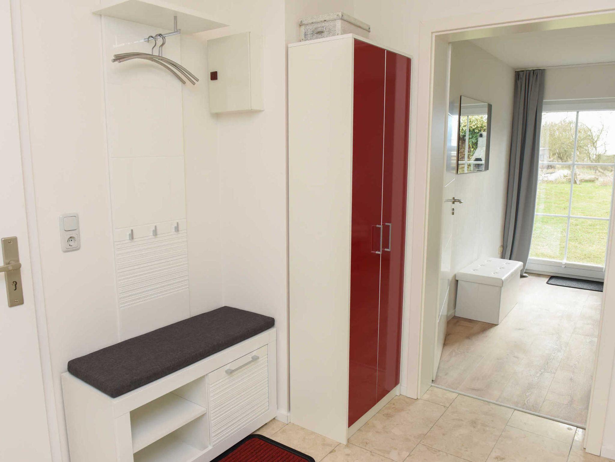 Über den Flur der Ferienwohnung gelangen Sie in ein Duschbad und den geräumigen Schlafraum ausgestattet mit einem Boxspringbett.