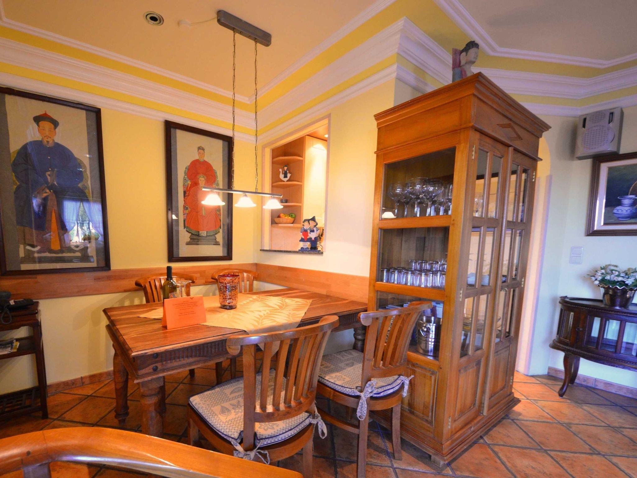 Telefontisch mit Telefon und balinesischem Spiegel, Kinderhochstuhl, Wände dekoriert mit Bildern.