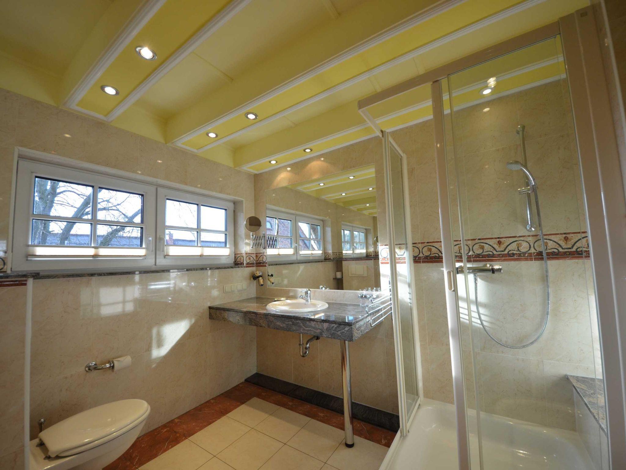 Fußbodenheizung, Naturstein - Abdeckungen, große Spiegel,