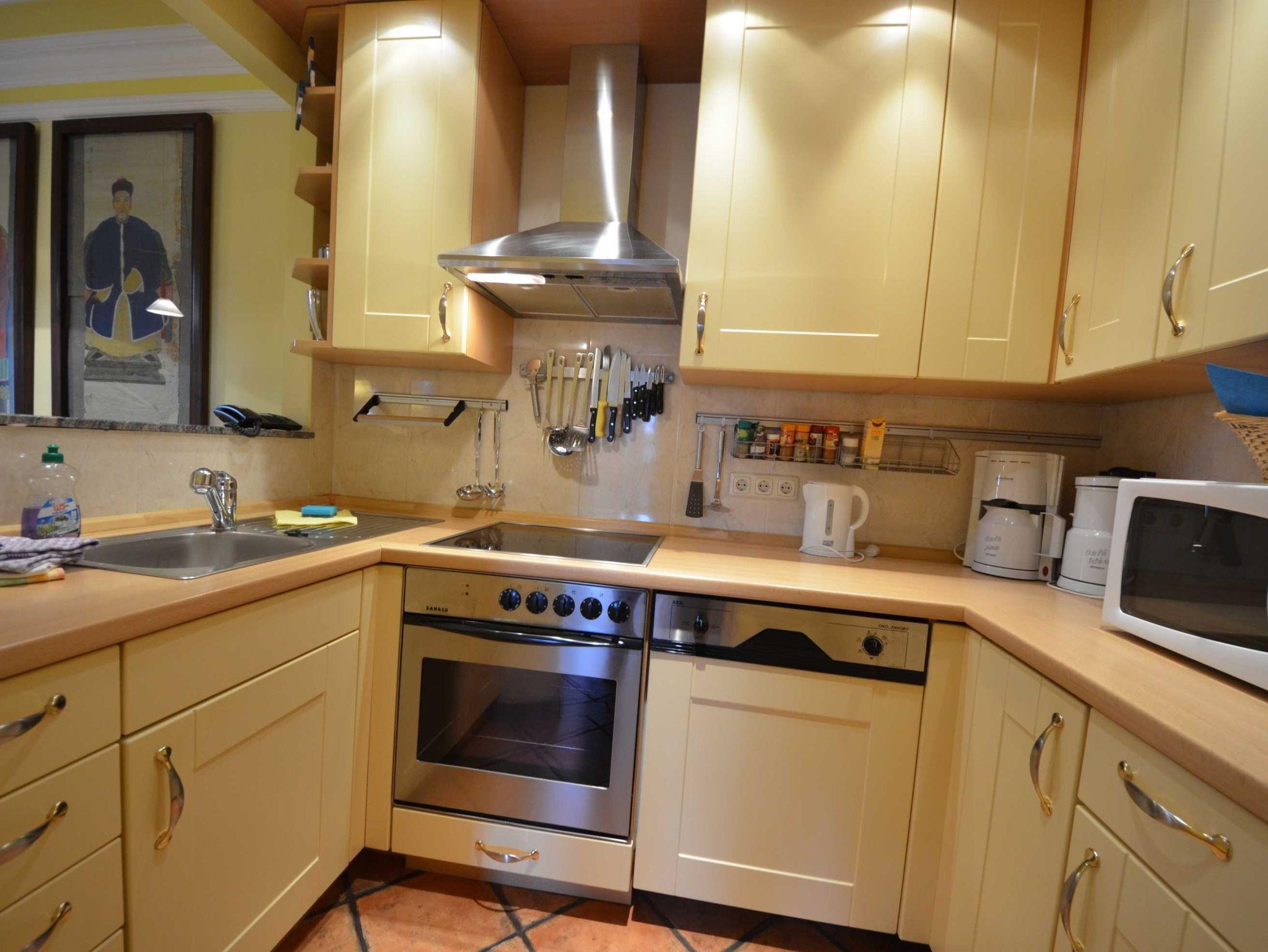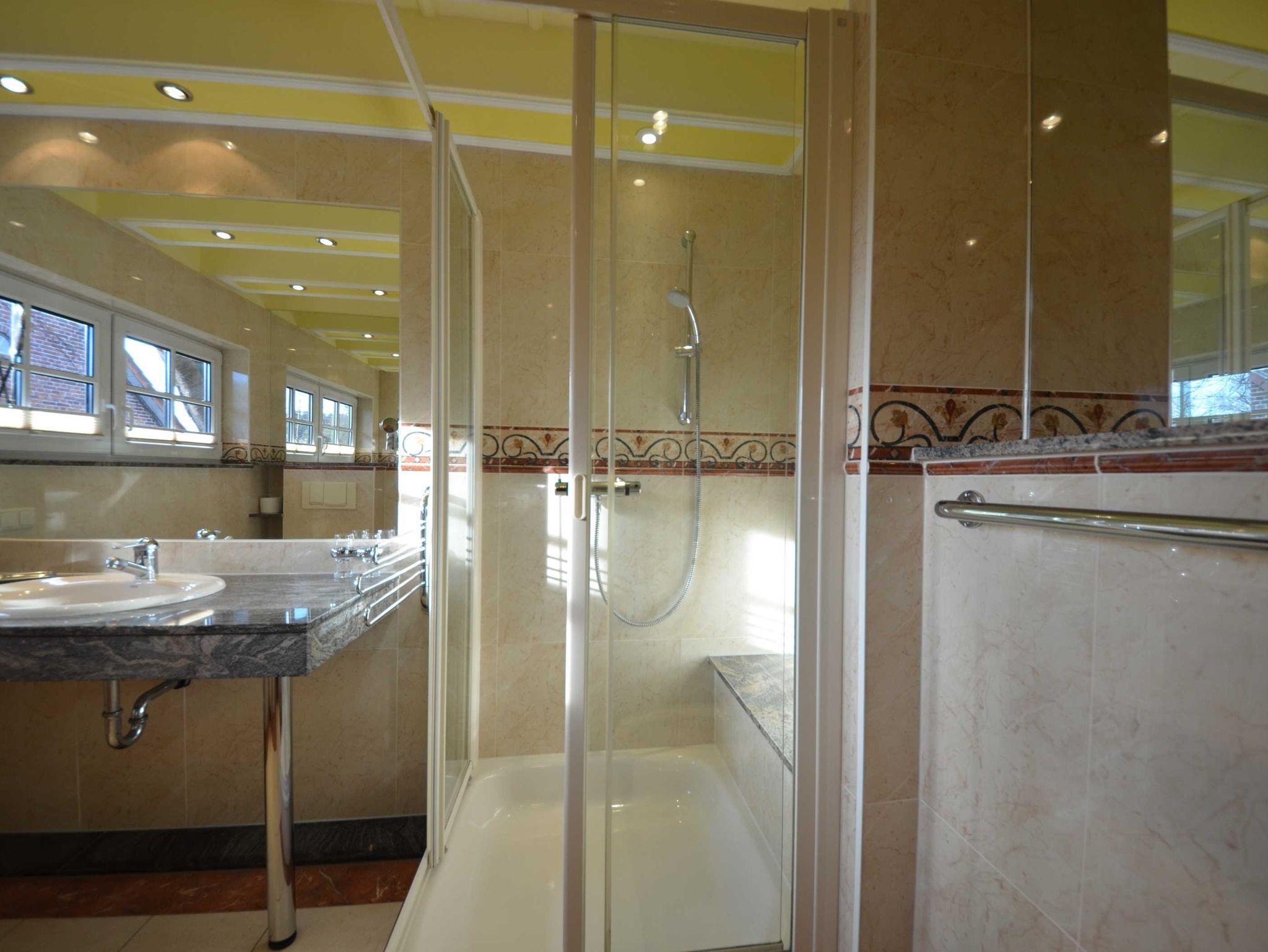 2 Bäder, Fußbodenheizung, schön eingerichtetes Wohn- Esszimmer, Couchgarnitur mit Leder bezogen, Opiumtisch, Speisetafel mit Stühlen, Geschirrschrank, Sat - TV, Telefon, Spiegel pp.