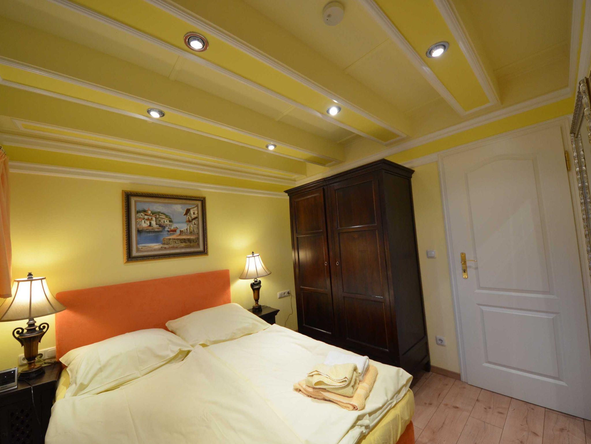 Doppelbetten jeweils 160 x 200 und 180 x 200, mit aufgezogener Bettwäsche. Radiowecker, mit Bildern dekoriert. Große Ganzkörperspiegel.
