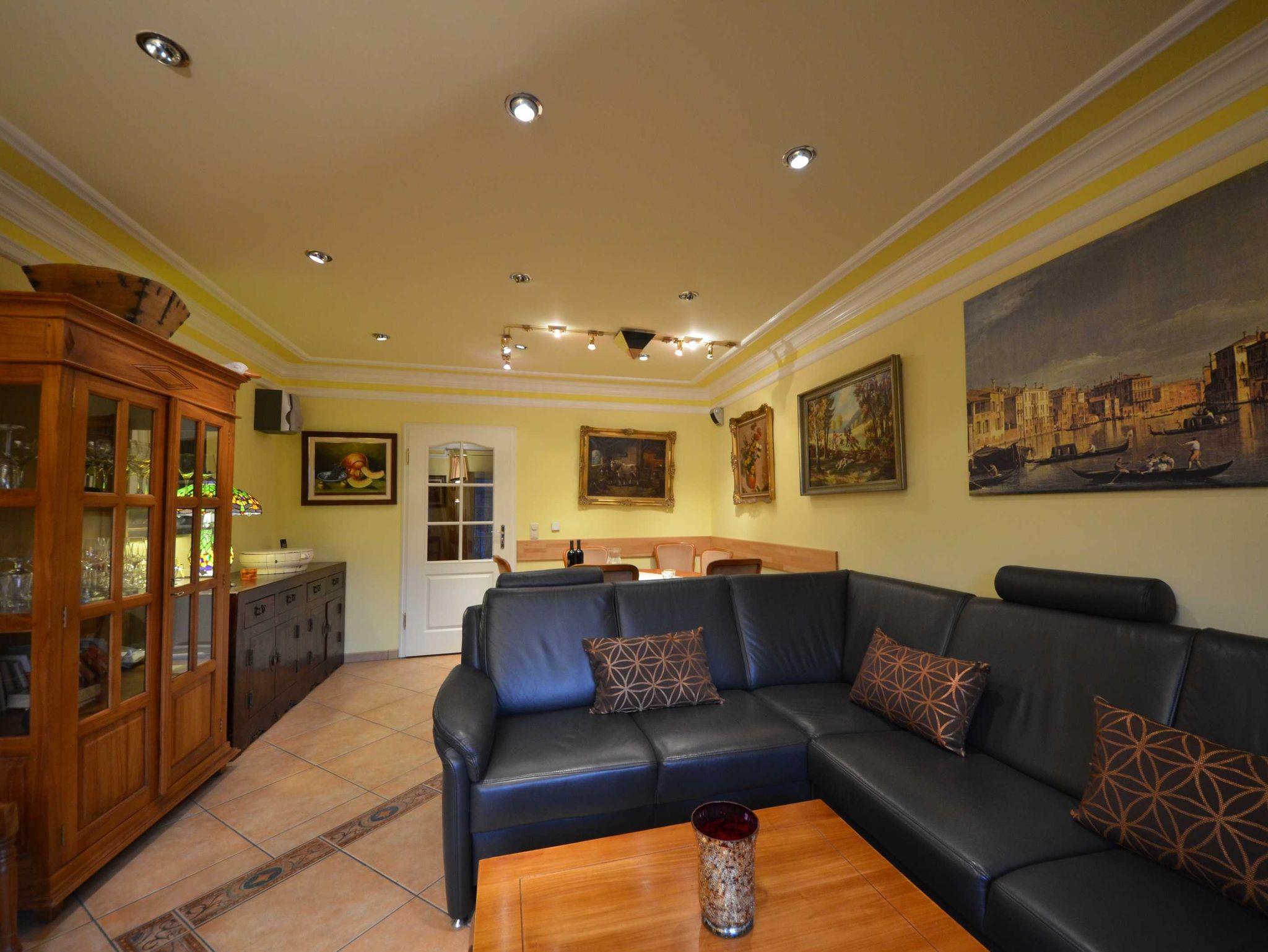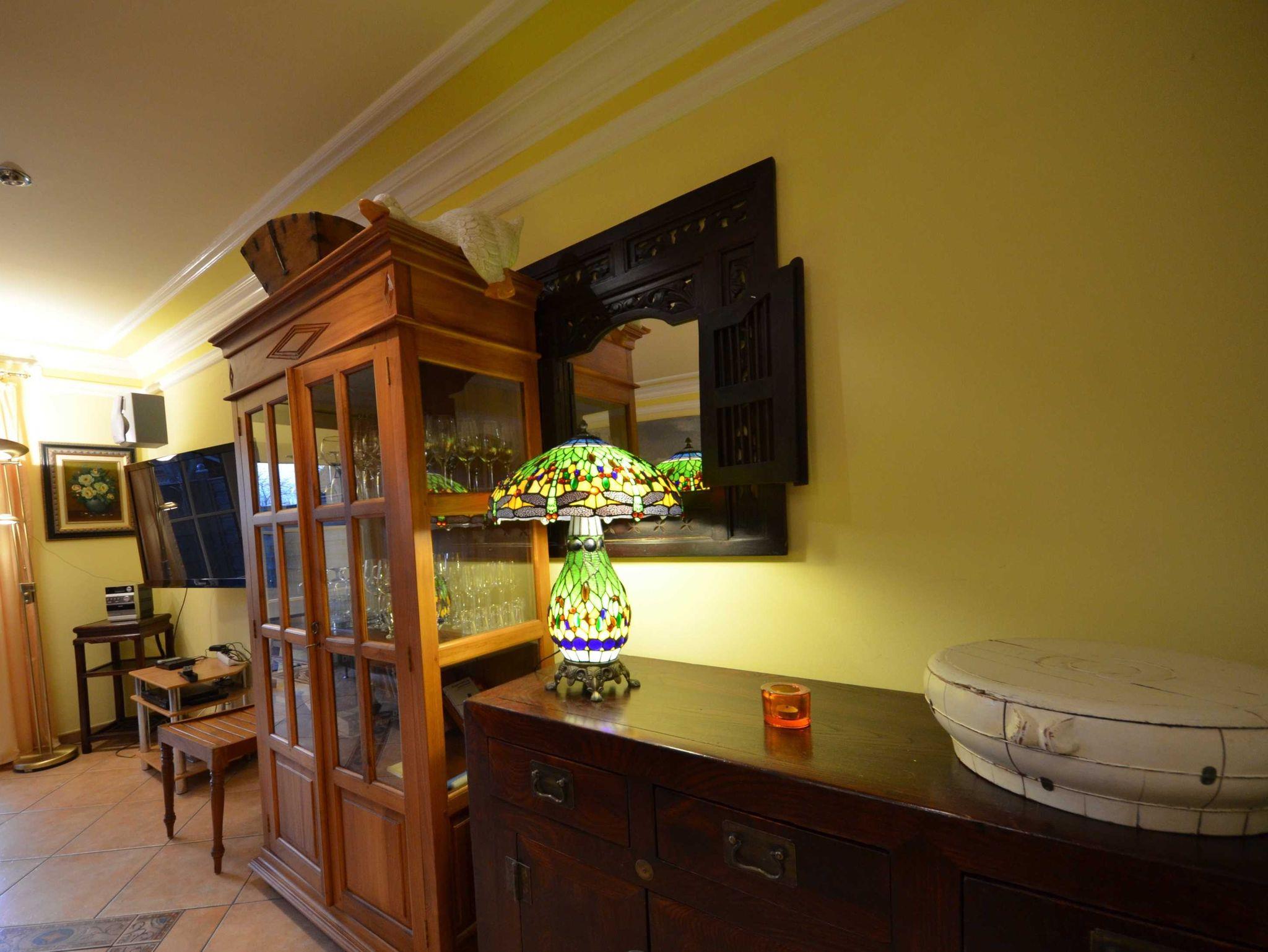 2 Bäder, Fußbodenheizung, schön eingerichtetes Wohn- Esszimmer, Couchgarnitur mit Leder bezogen, Opiumtisch, Speisetafel mit Stühlen, Geschirrschrank, Sat - TV, Telefon, Spiegel pp.