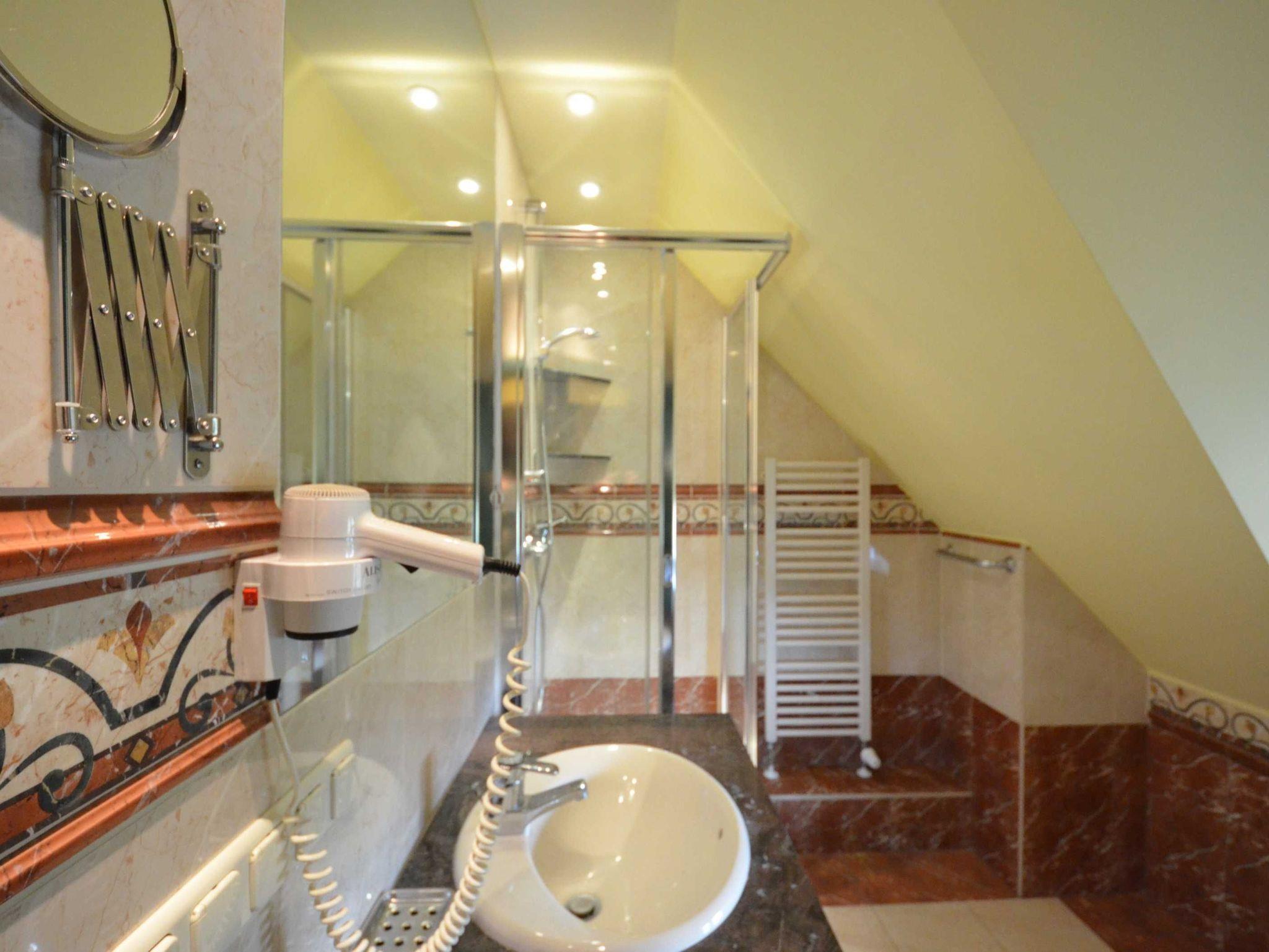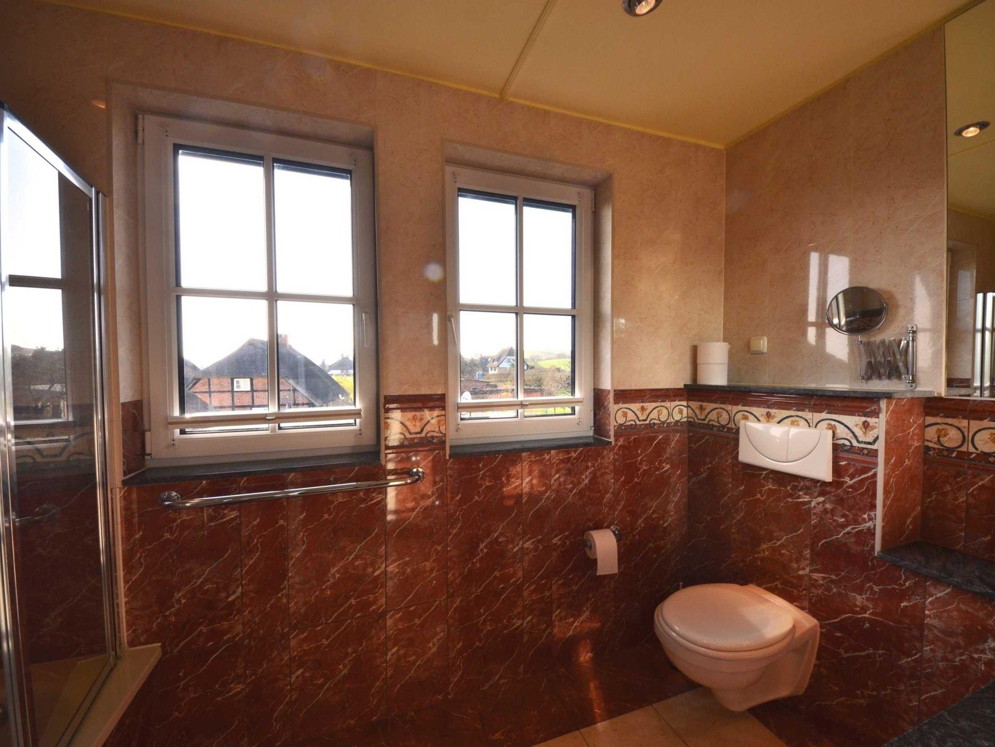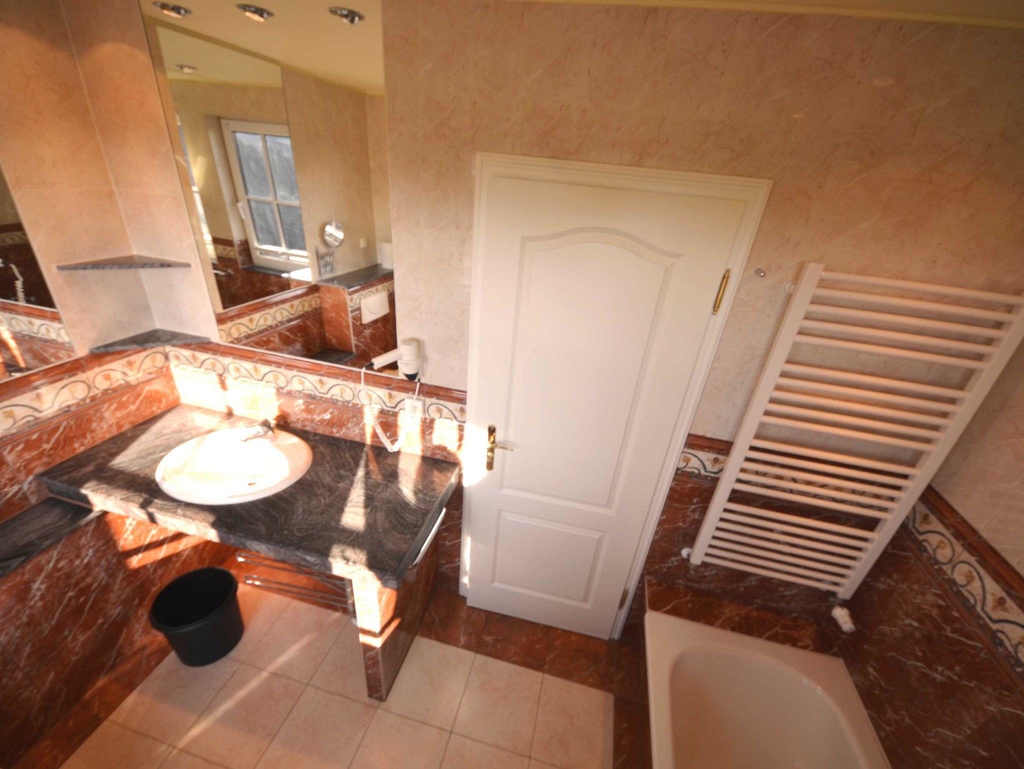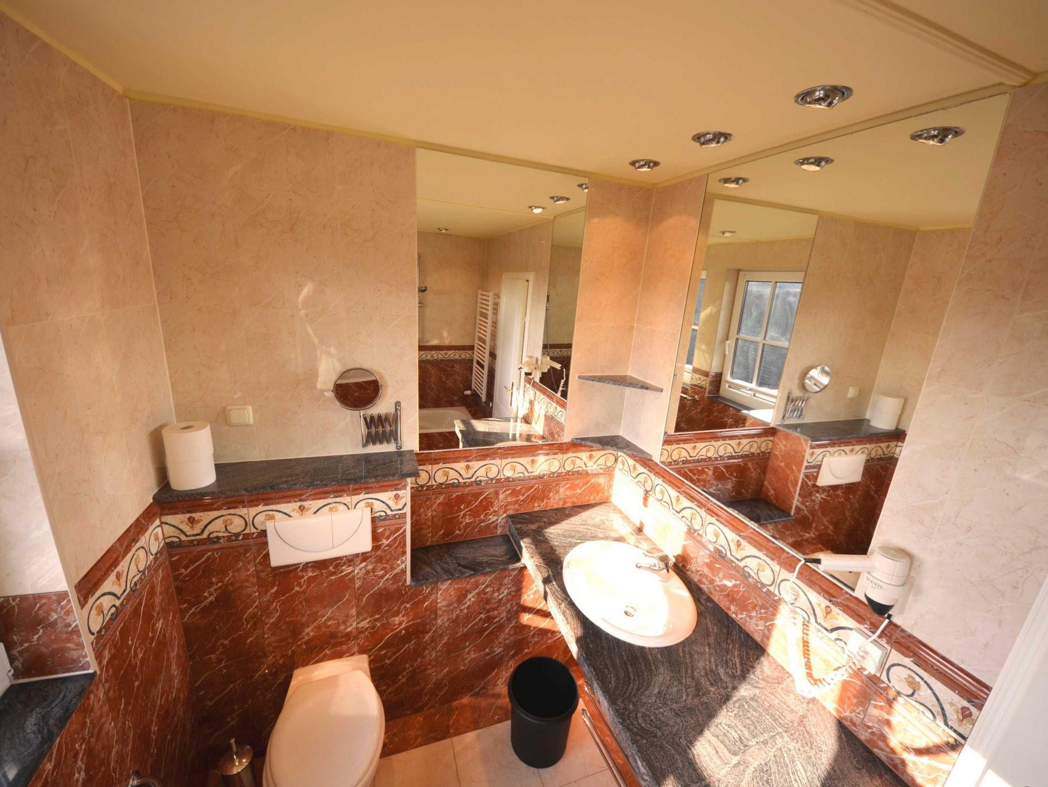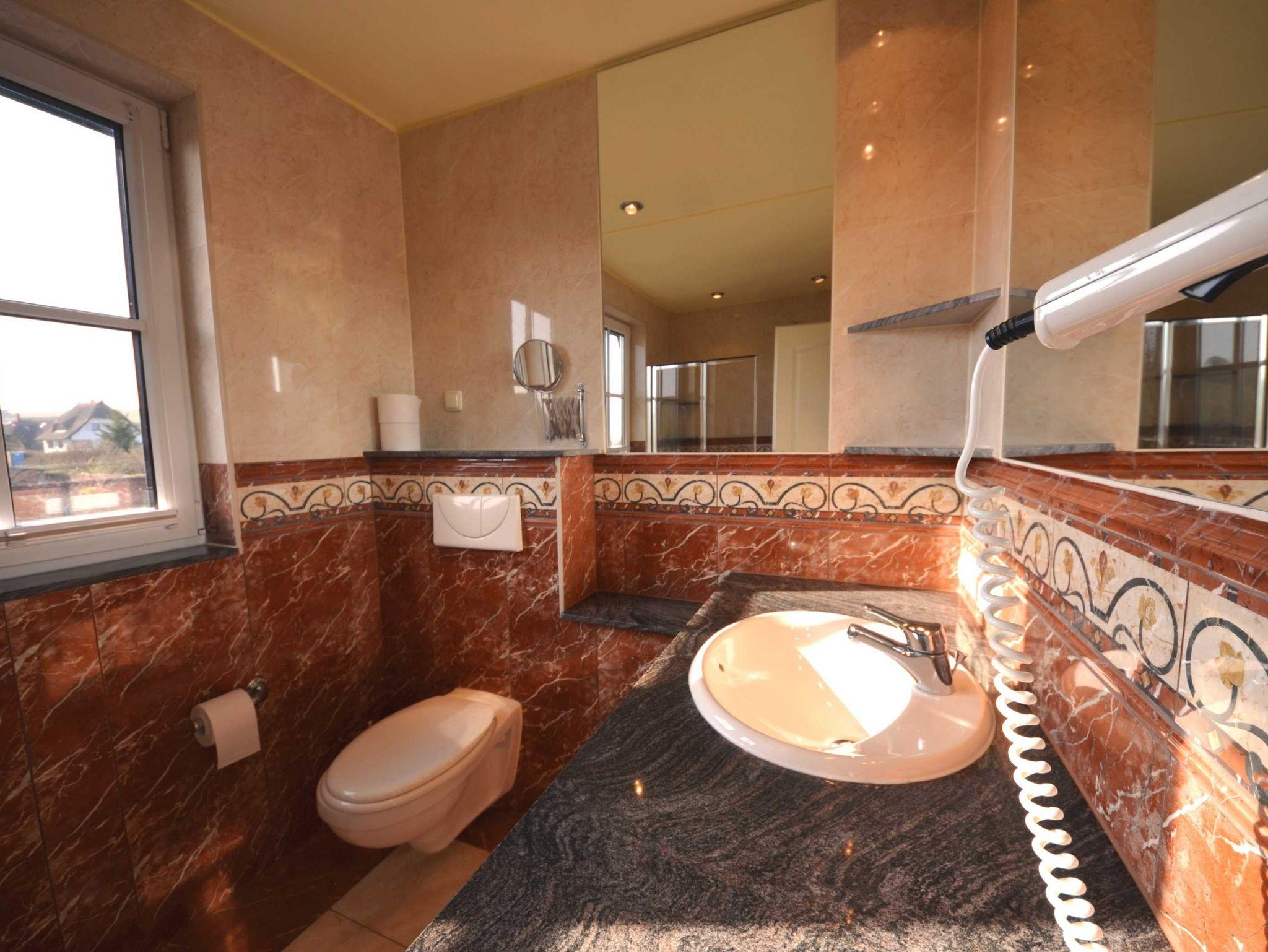 Naturstein, große Spiegel, schöne Sanitärausstattung beheizbarer Handtuchhalter, Fön, Schminkspiegel