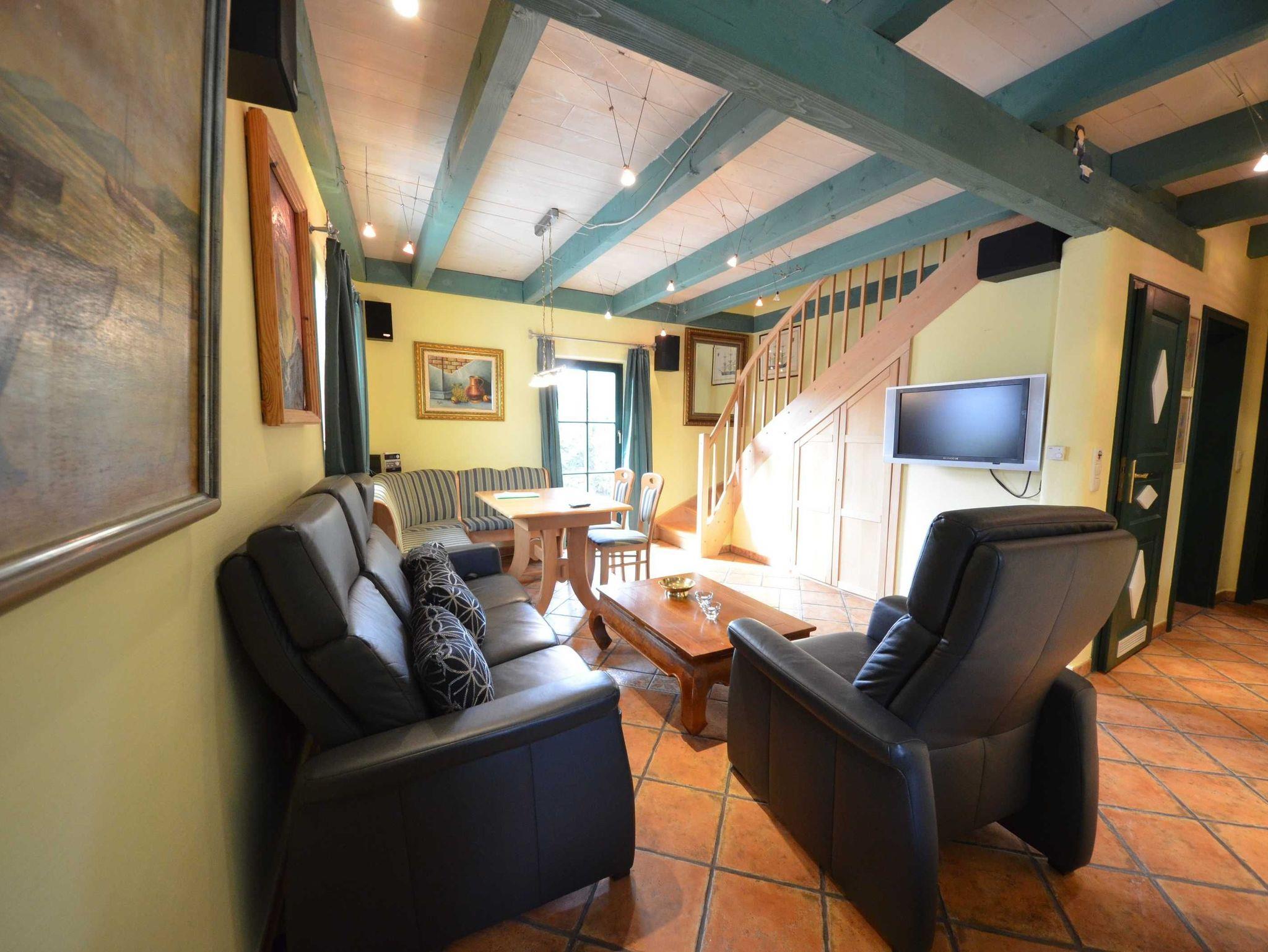 Erdgeschoss: Eingangsflur mit Garderobe und Schuhschrank, Fußbodenheizung, schön eingerichtetes Wohn- Esszimmer, Leder - Couchgarnitur, Opiumtisch, Speisetafel mit Stühlen, Geschirrschrank, Sat - TV, Telefon, Spiegel pp. Babybett und Hochstuhl.