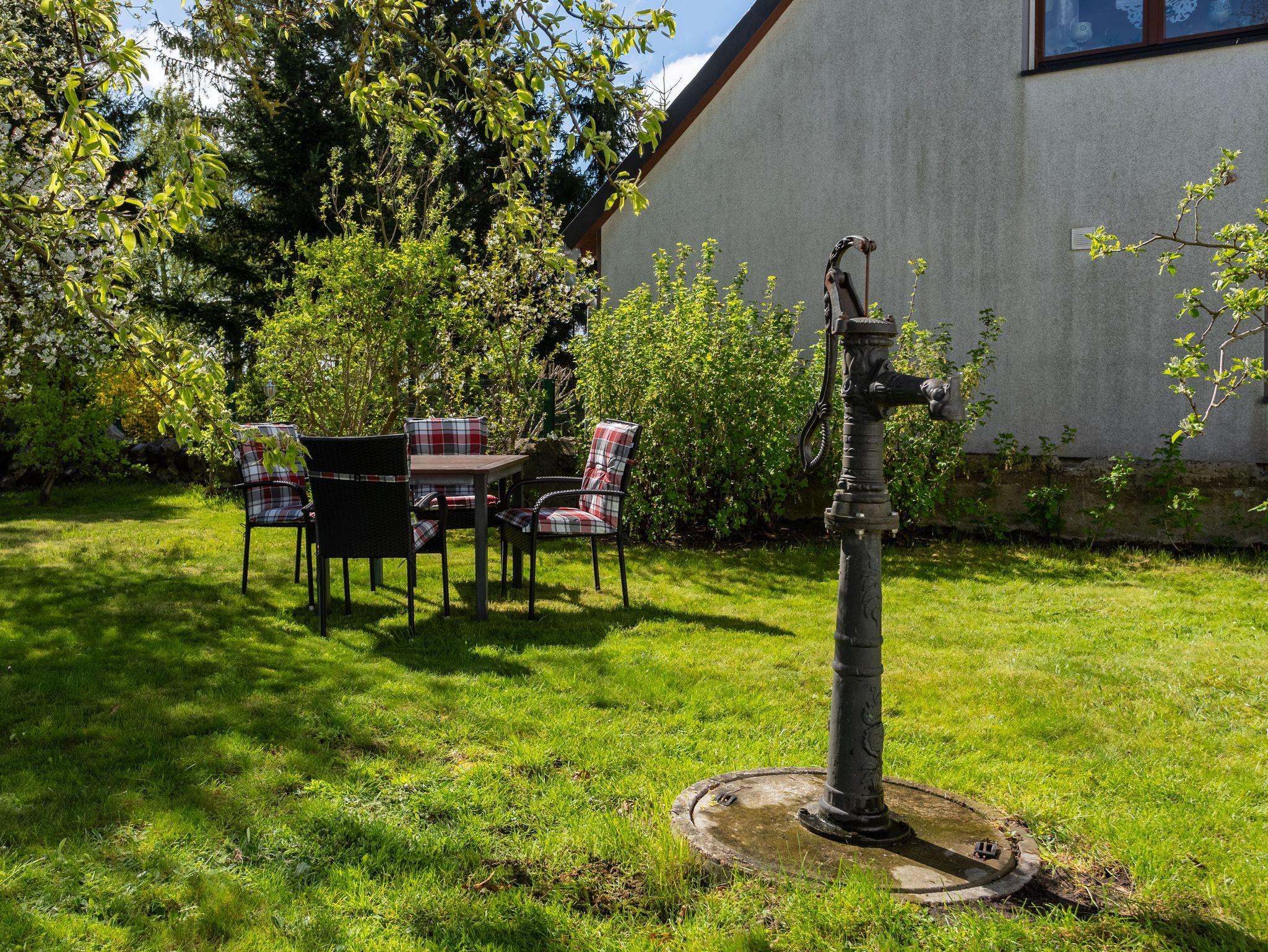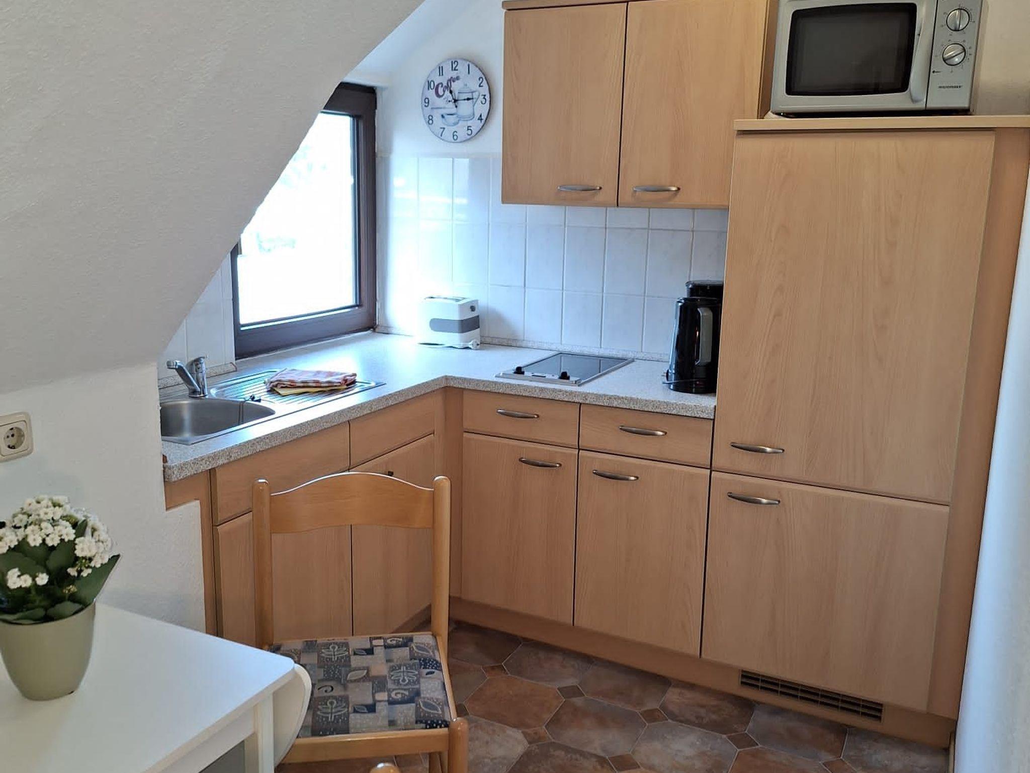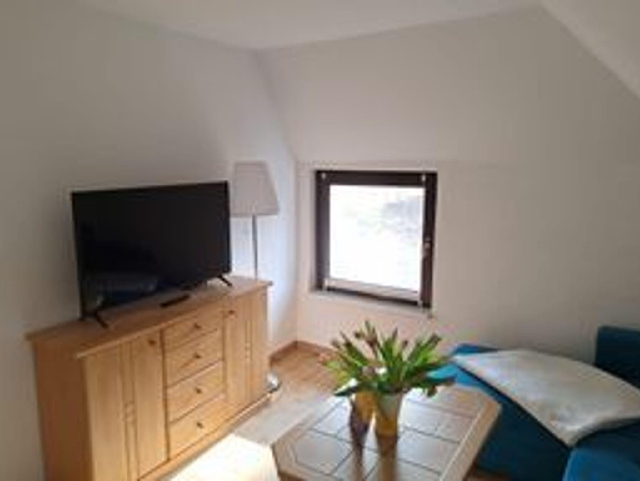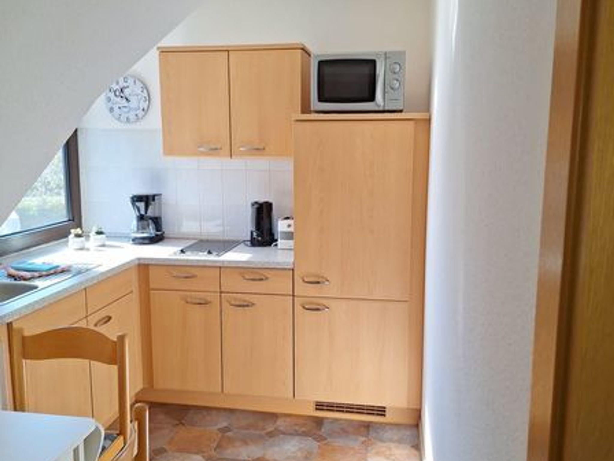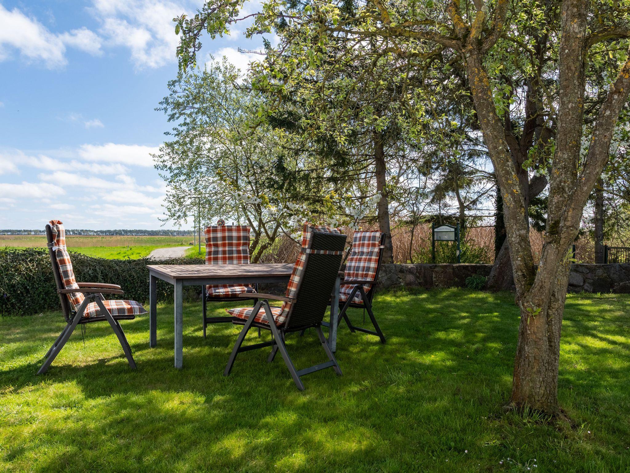 Unsere Ferienwohnung in der oberen Etage im reetgedeckten Haus besteht aus einem Wohnraum mit Sat-TV, einem Schlafraum, einer Küche sowie Bad mit Dusche und WC und einem separaten Eingang. In der Einbauküche sind ein 2- Platten Herd, Spüle, Kühlschrank sowie Kaffeemaschine, Toaster und Wasserkocher. Zu der Wohnung gehört ein Platz mit Sitzgruppe im Garten. Autostellplätze und Grillmöglichkeiten befinden sich auf dem Grundstück.
