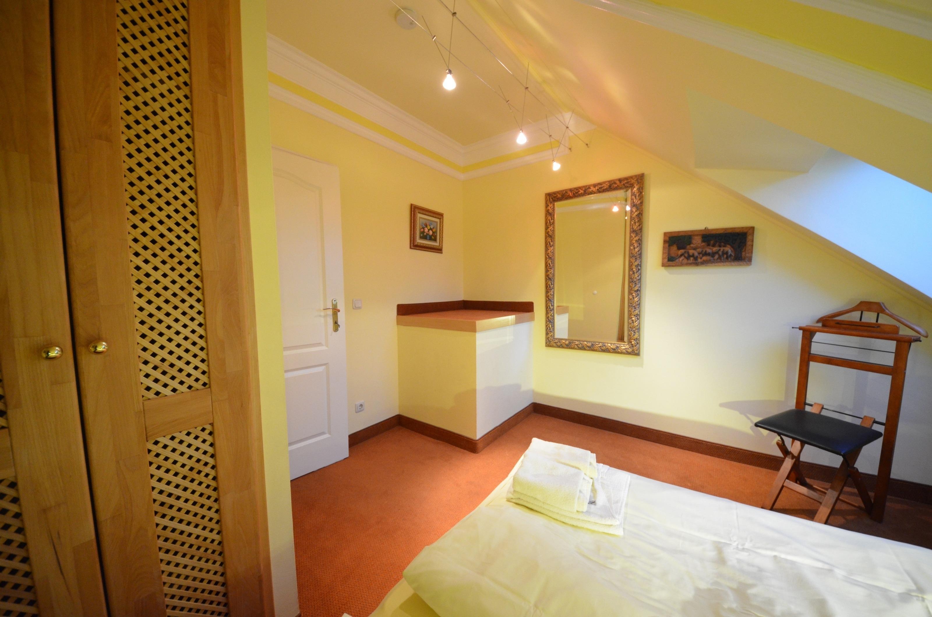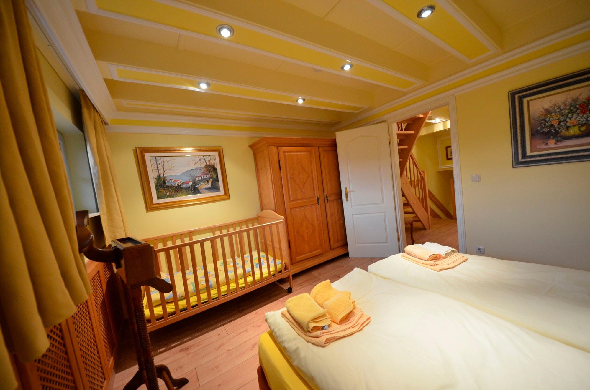 Doppelbetten jeweils 160 x 200 und 180 x 200, aufgezogene Bettwäsche. Radiowecker, mit Bildern dekoriert. Große Ganzkörperspiegel. In einem Schlafzimmer ein Babybett 70 x 140 (kostenlos) aufgezogene Bettwäsche.